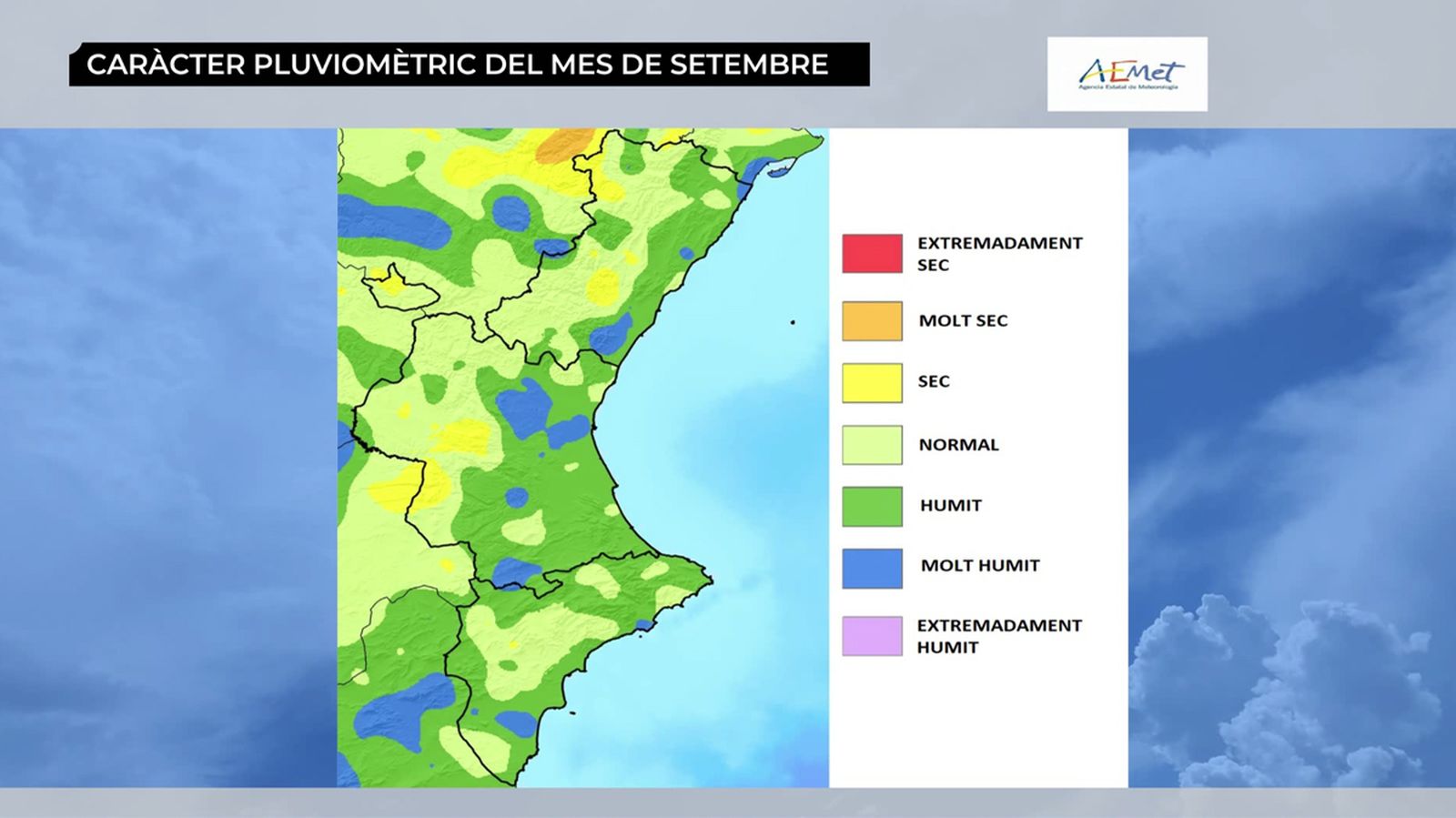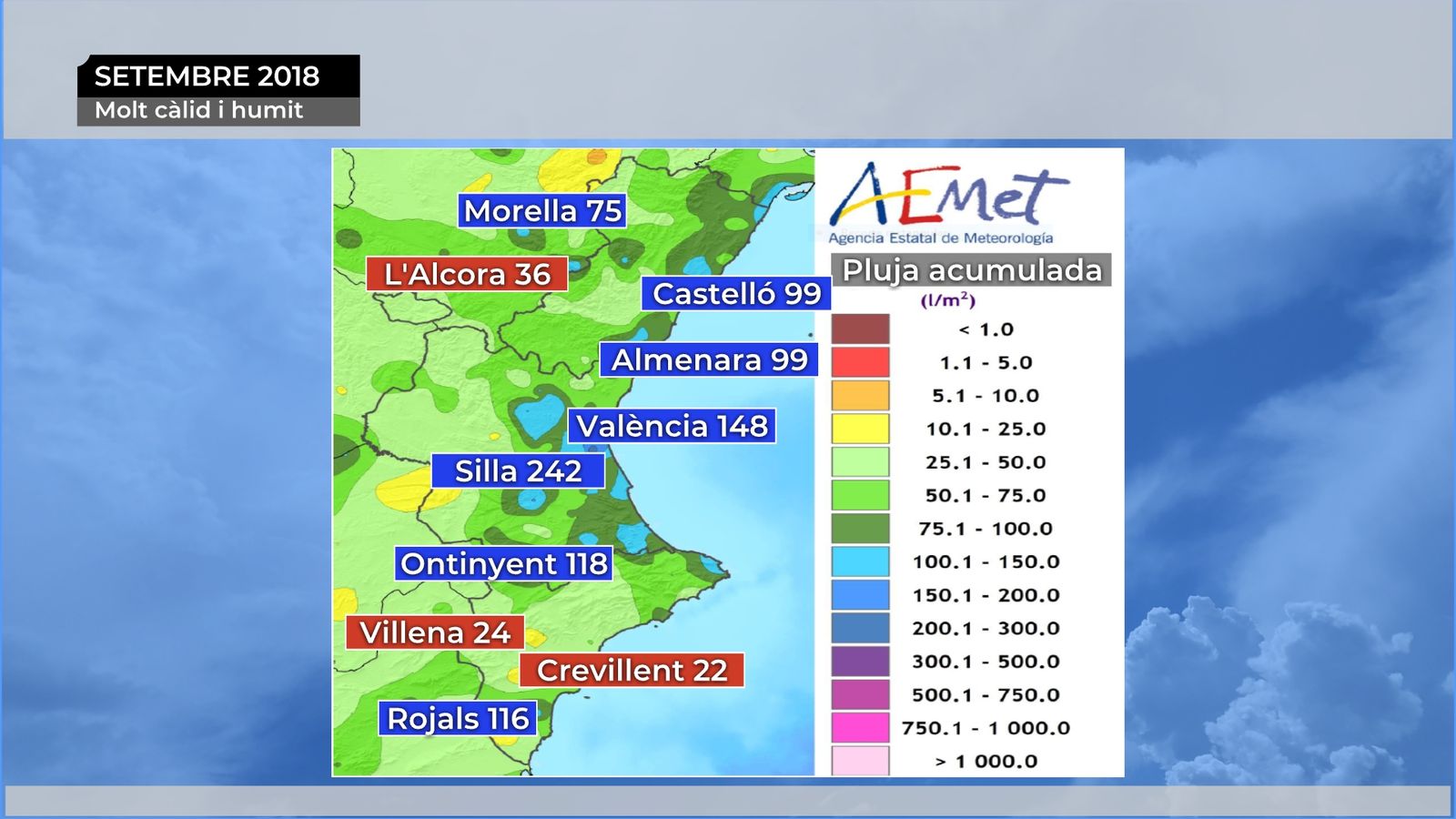 Setembre és un dels mesos més plujosos de l'any a la Comunitat Valenciana i enguany ha fet honor al seu nom. La pluja ha sigut bastant general, però molt irregular, ja que en la majoria dels casos ha tingut un caràcter eminentment tempestuós. De fet, una tronada el dia 3 va deixar fins a 82 l/m² a Fontanars dels Alforins, a la Vall d'Albaida, 78 dels quals van caure en només una hora. I el dia 5, una intensa tempesta va afectar l'Horta i va deixar quasi 100 l/m² a Silla, mentre que a València van caure menys de 5 l/m². Precisament, a Silla és on més aigua s'ha arreplegat, concretament 242 l/m².