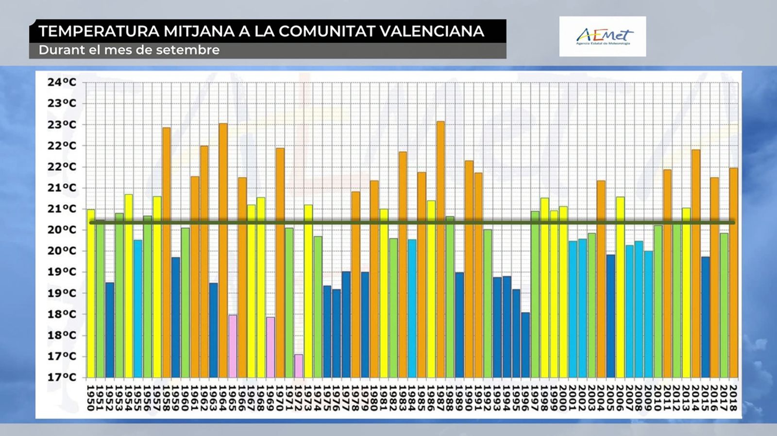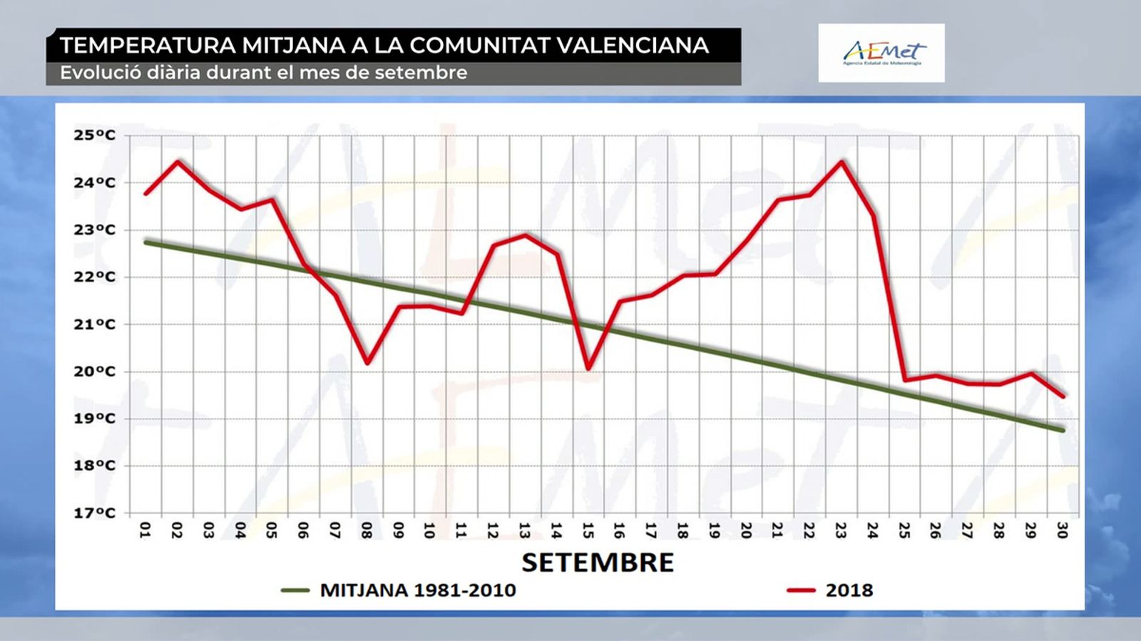 Pel que fa a les temperatures, aquest mes de setembre hem passat més calor de l'habitual. Ha sigut un mes molt càlid segons l'Agència Estatal de Meteorologia. La temperatura mitjana ha sigut de 22 °C, 1,3 °C per damunt de la mitjana climàtica. Se situa en el nové lloc en els rànquing dels setembres més càlids des de 1950. Destaca l'episodi de calor que vam tindre entre els dies 22 i 23, quan es van superar els 35 °C a localitats del sud de València, com Sumacàrcer, Xàtiva o Xalans. Ja a finals de mes, les temperatures es van normalitzar.