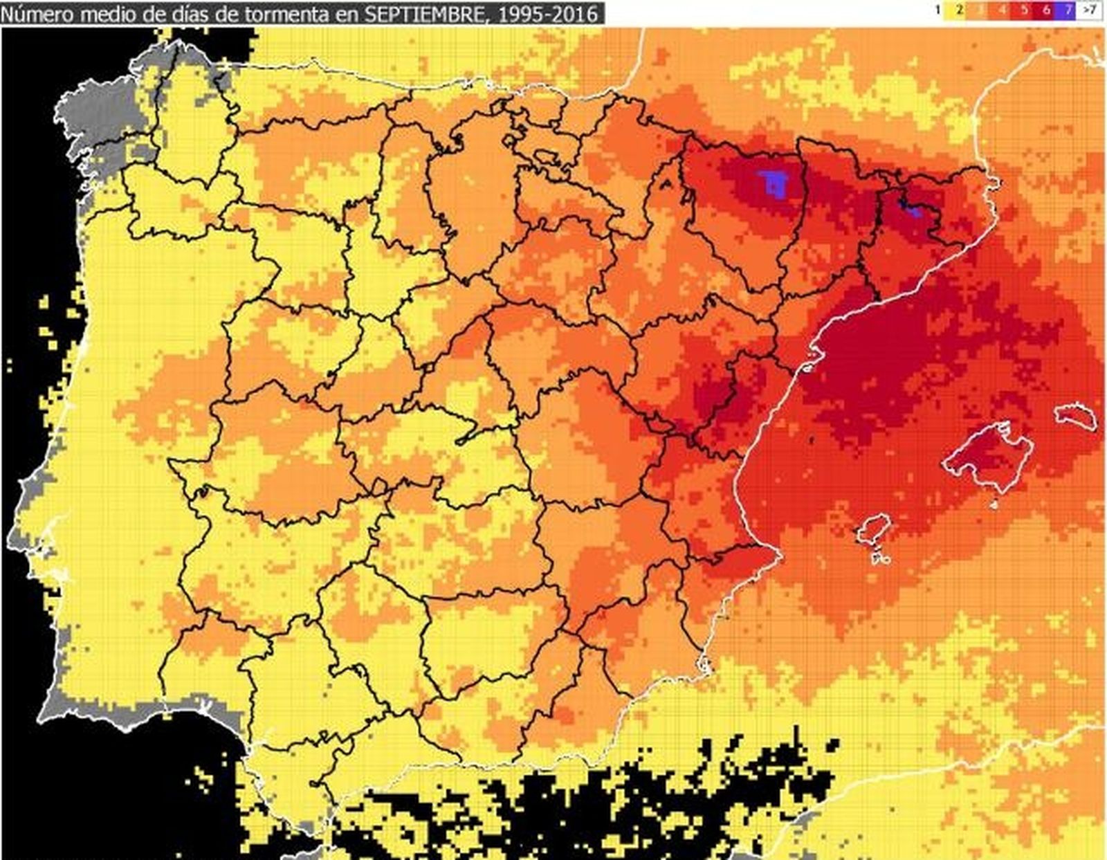 Amb la mitjana de registres entre 1995 i 2016, la freqüència de tempestes a la península Ibèrica, al llarg de setembre, augmenta des del sud-oest cap al nord-est. Destaca l'activitat de tronades a la zona marítima respecte dels altres mesos, a causa de l'energia aportada al sistema atmosfèric per la superfície de l'aigua del mar en aquestes dates.