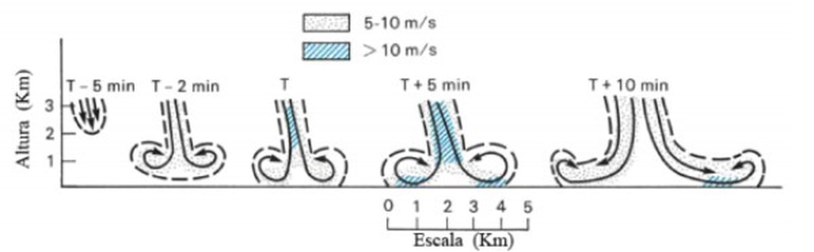 Es tracta d'un fort corrent convectiu que es produeix a l'interior d'un núvol de tempesta. El corrent descendent després de travessar una capa d'aire càlid i sec, s'accelera, evapora la precipitació i es generen ratxes molt fortes de vent.