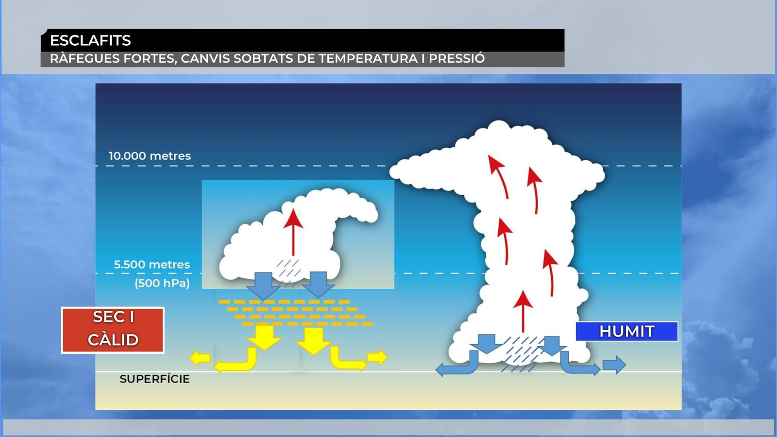 En el cas dels núvols de tempesta de base alta, com els que tenim estos dies, que viatgen damunt d'una massa d'aire sec i de vegades carregada de pols ens suspensió, la pluja, en travessar aquesta massa d'aire sec, s'evapora i provoca un refredament sobtat de l'aire, que augmenta la densitat i accelera la caiguda, de manera que s'esclafa amb violència amb la superfície. Quan arriba a la superfície, es troba a una pressió més alta i la compressió d'aquest aire més sec fa que es recalfe de manera sobtada, cosa que provoca un vent molt fort i càlid en la superfície. És en aquest moment quan podem dir que tenim l'esclafit sec o càlid.