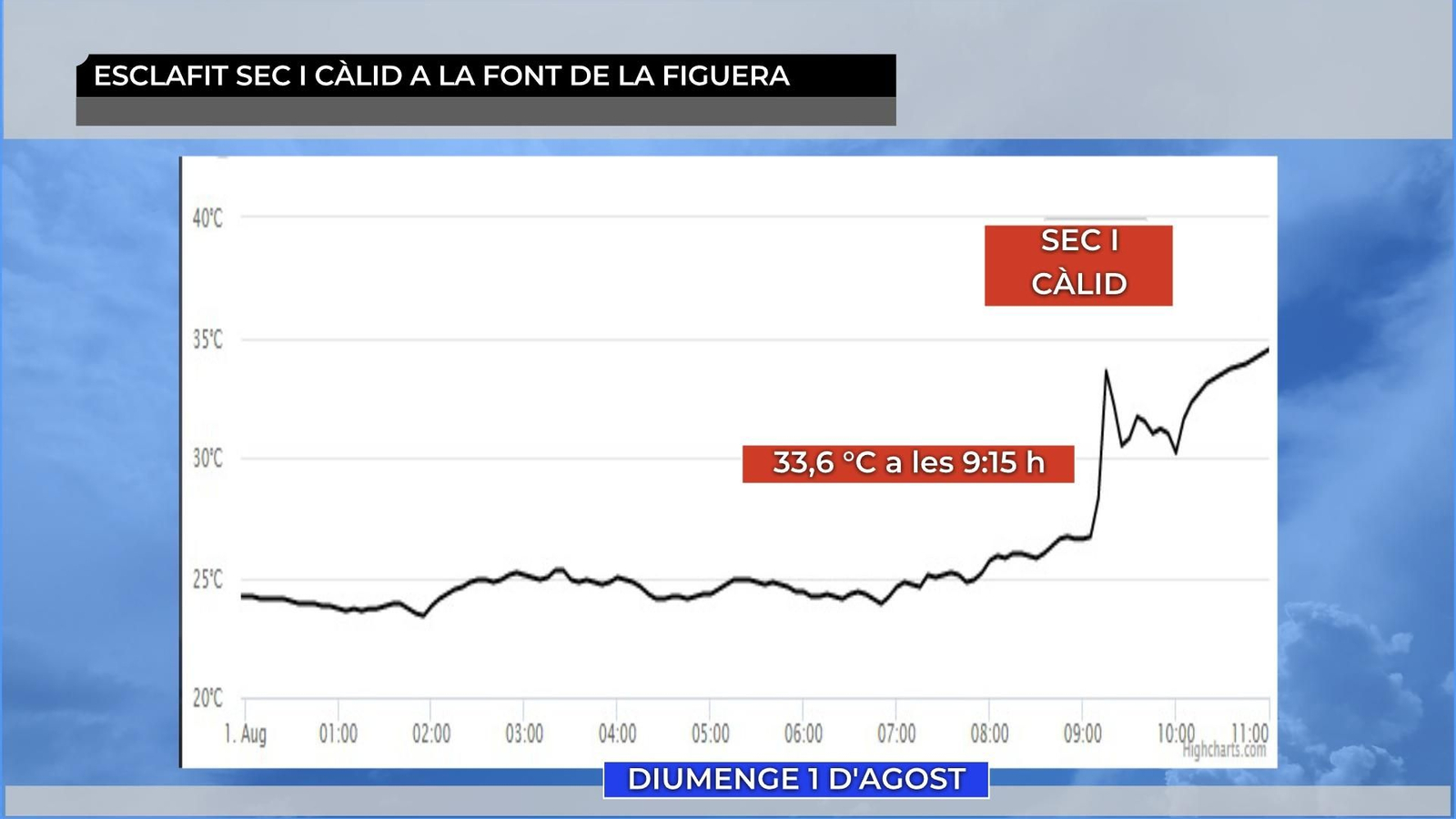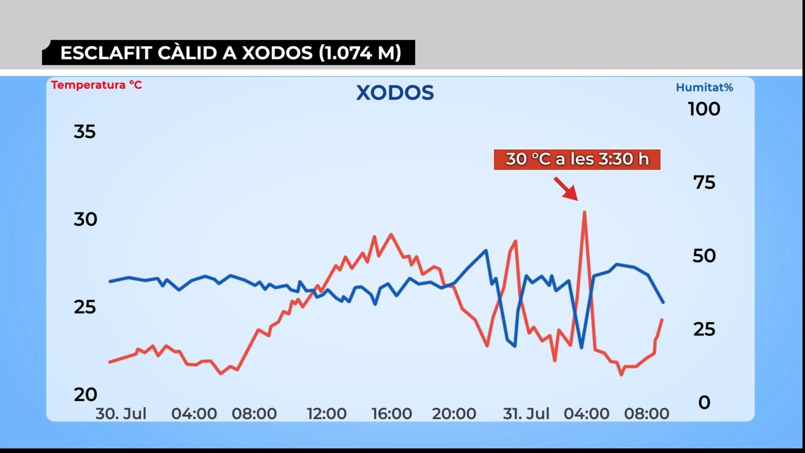 Podem veure l'exemple dels canvis de temperatura registrats a Xodos la matinada del 31 de juliol, amb 30 °C de matinada de manera sobtada.