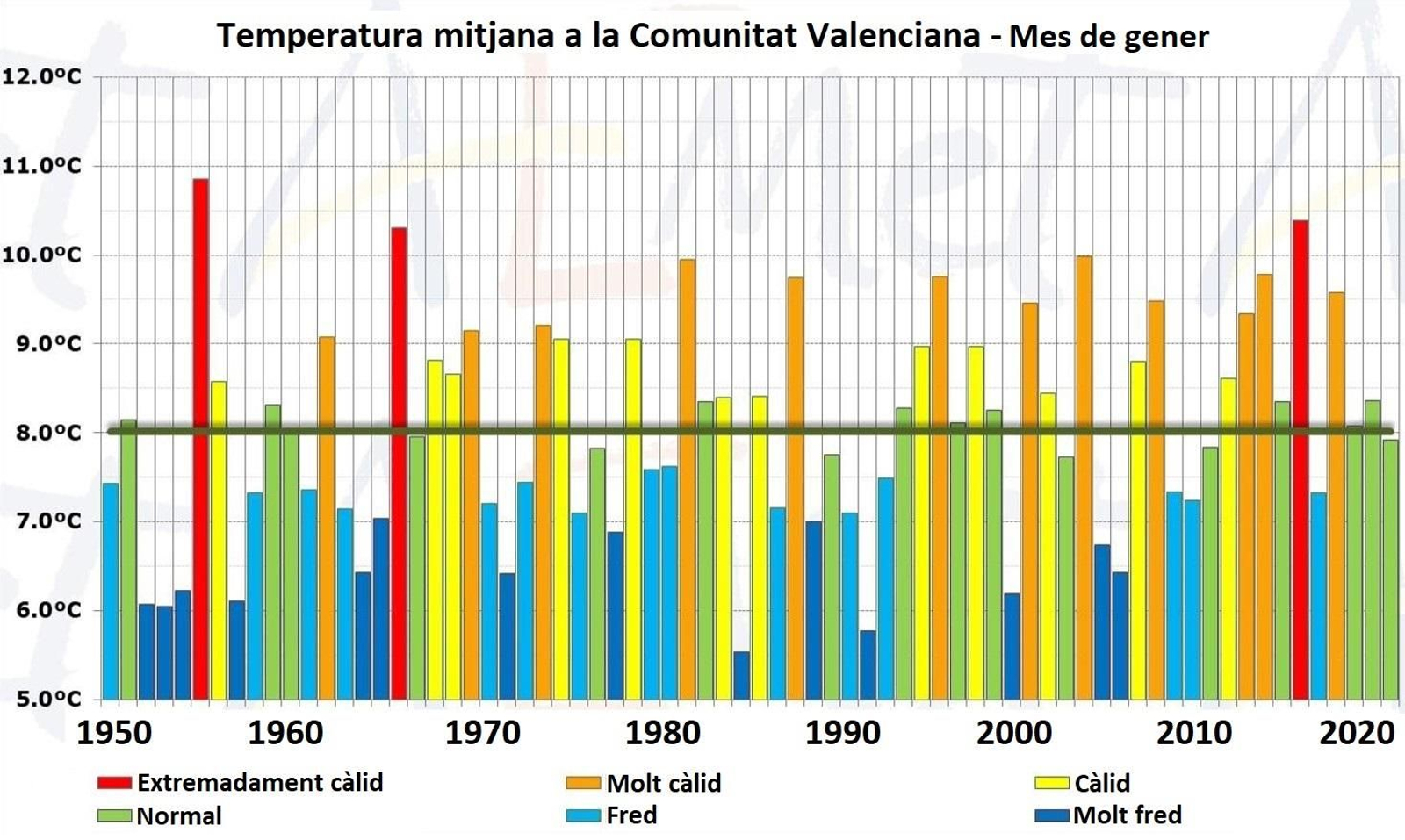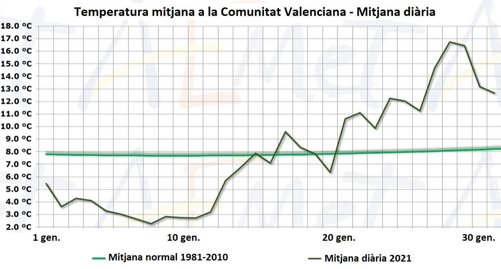 En definitiva, acaba un mes de gener que, tot i haver resultat estadísticament normal pel que fa a la temperatura mitjana, ha tingut registres extrems tant de fred com de calor. L'amplitud tèrmica mensual a la Comunitat Valenciana ha sigut de 55,9 °C: dels -26,1 °C del pla de Vistabella del Maestrat el dia 12 als 29,8 °C d'Alacant el dia 29. Unes dades, sense dubte, extraordinàries.