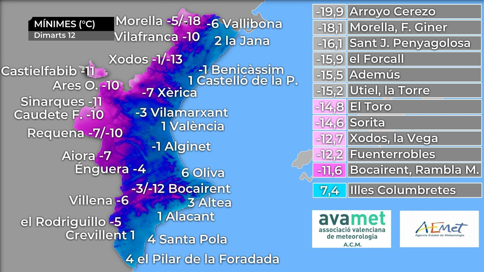 A casa nostra les nits més fredes van ser les dels dies 6 i 12 de gener. La particularitat del dia 12 va ser que en imposar-se l'anticicló després del pas de la borrasca Filomena les temperatures es van desplomar a valors extrems en aquelles zones cobertes per la neu: l'observatori d’Avamet situat a Arroyo Cerezo, al Racó d'Ademús, va enregistrar -19,9 °C. Al pla de Vistabella del Maestrat van ser -26,1 °C, un valor que va superar el rècord oficial de temperatura mínima de la Comunitat Valenciana: els -24 °C registrats a Villena el 17 de gener de 1957.