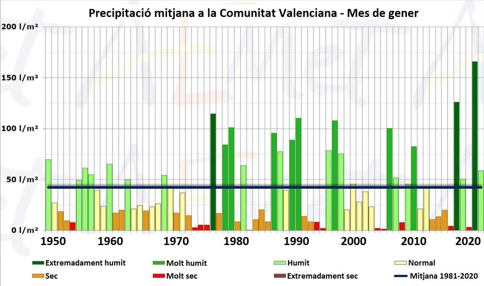Pel que fa a les precipitacions, d’acord amb les dades facilitades per l’Aemet, ha sigut un mes amb valors un 40% per damunt de la mitjana, però gens extraordinaris: sense anar molt lluny, gener de 2020 va ser molt destacable pluviomètricament a causa de la borrasca Gloria: al conjunt del territori va ser el gener més plujós des que hi ha dades i a l'observatori de l’Associació Valenciana de Meteorologia situat a Benissili, la Vall de Gallinera, es van acumular 822 l/m².
