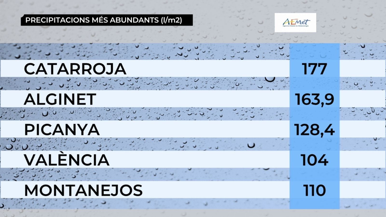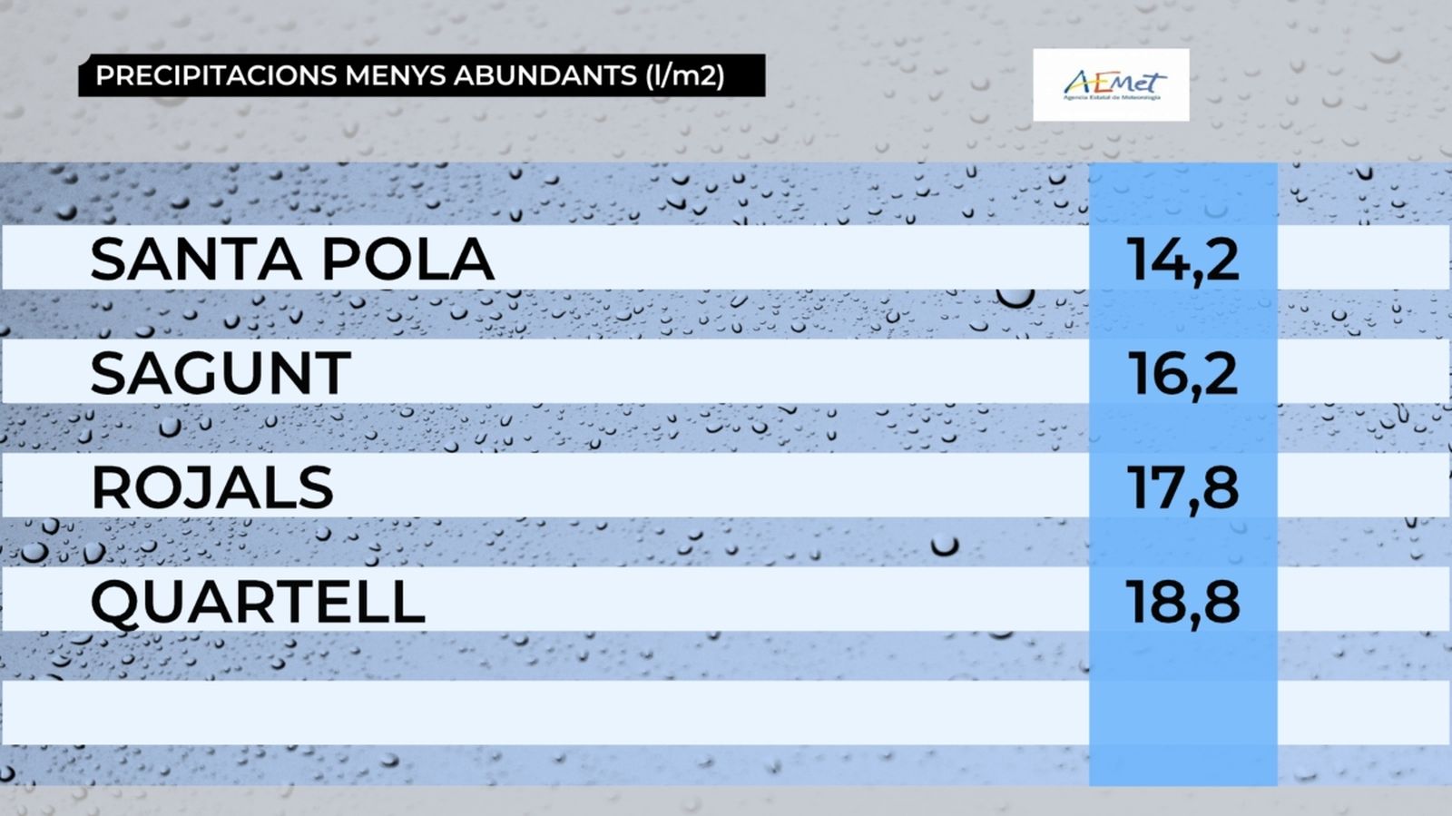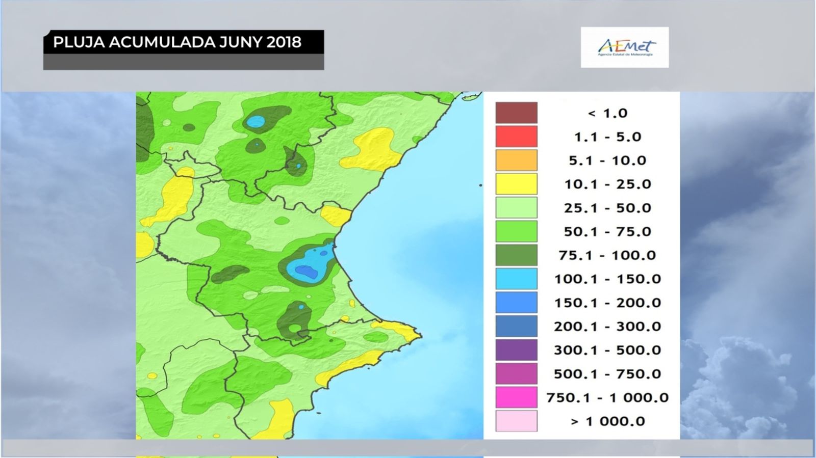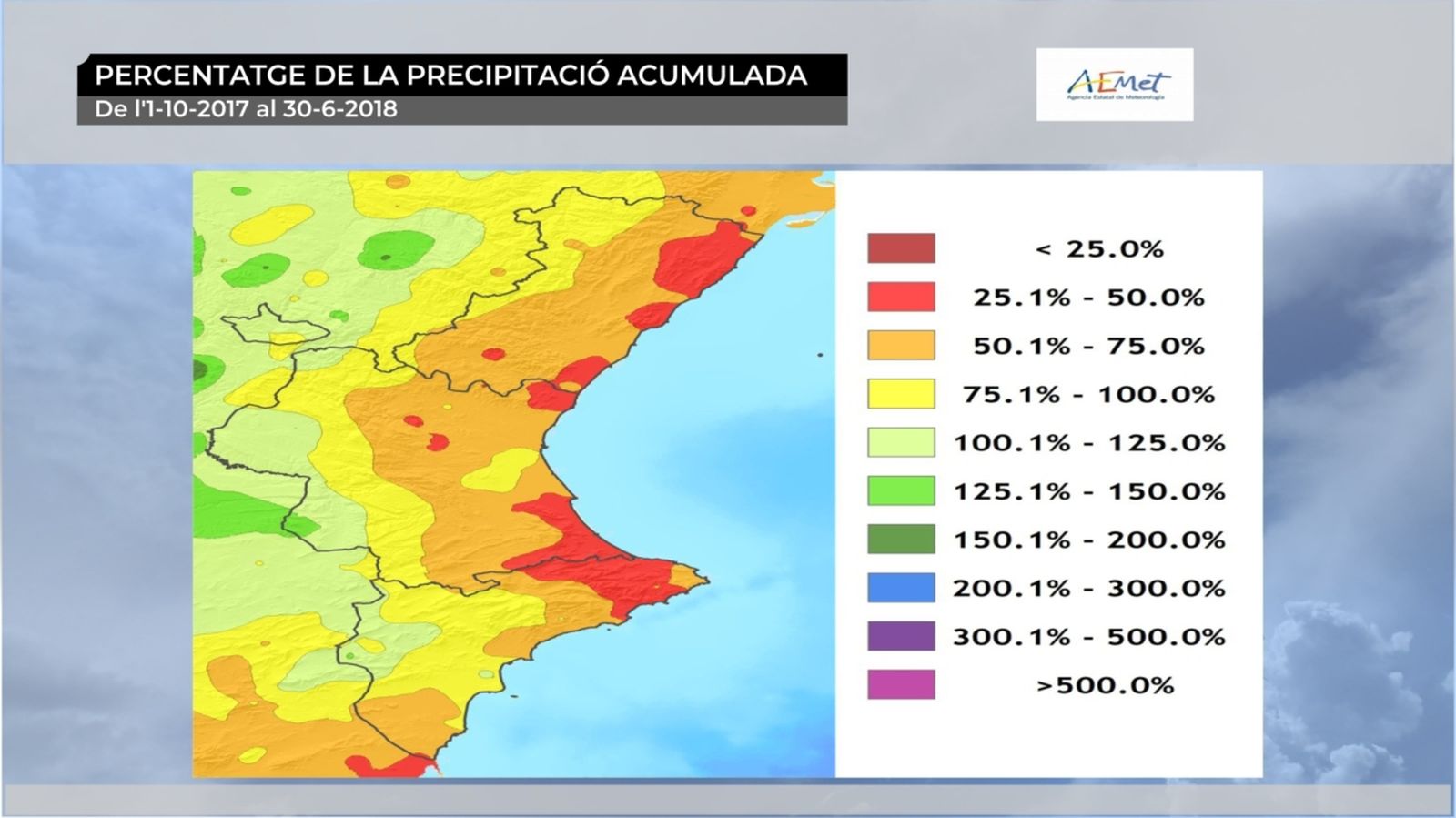De fet, tot i les tempestes de maig i de juny, el fet cert és que la major part del territori arrossega un dèficit molt considerable de precipitacions. Des que va començar l'any hidrològic, el passat 1 d'octubre, el dèficit a tota la comunitat es xifra en un 30 %. Però aquesta mitjana amaga unes realitats molt diferents, com sol passar en el nostre clima. Així, mentre que la zona interior de València i del nord d'Alacant presenta un lleuger superàvit pluviomètric, hi ha zones costaneres on ha plogut menys de la meitat del que seria normal, és a dir, on hi ha un dèficit de pluja superior al 50 %.