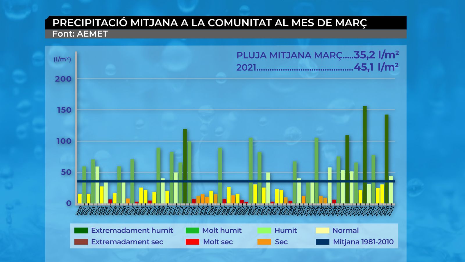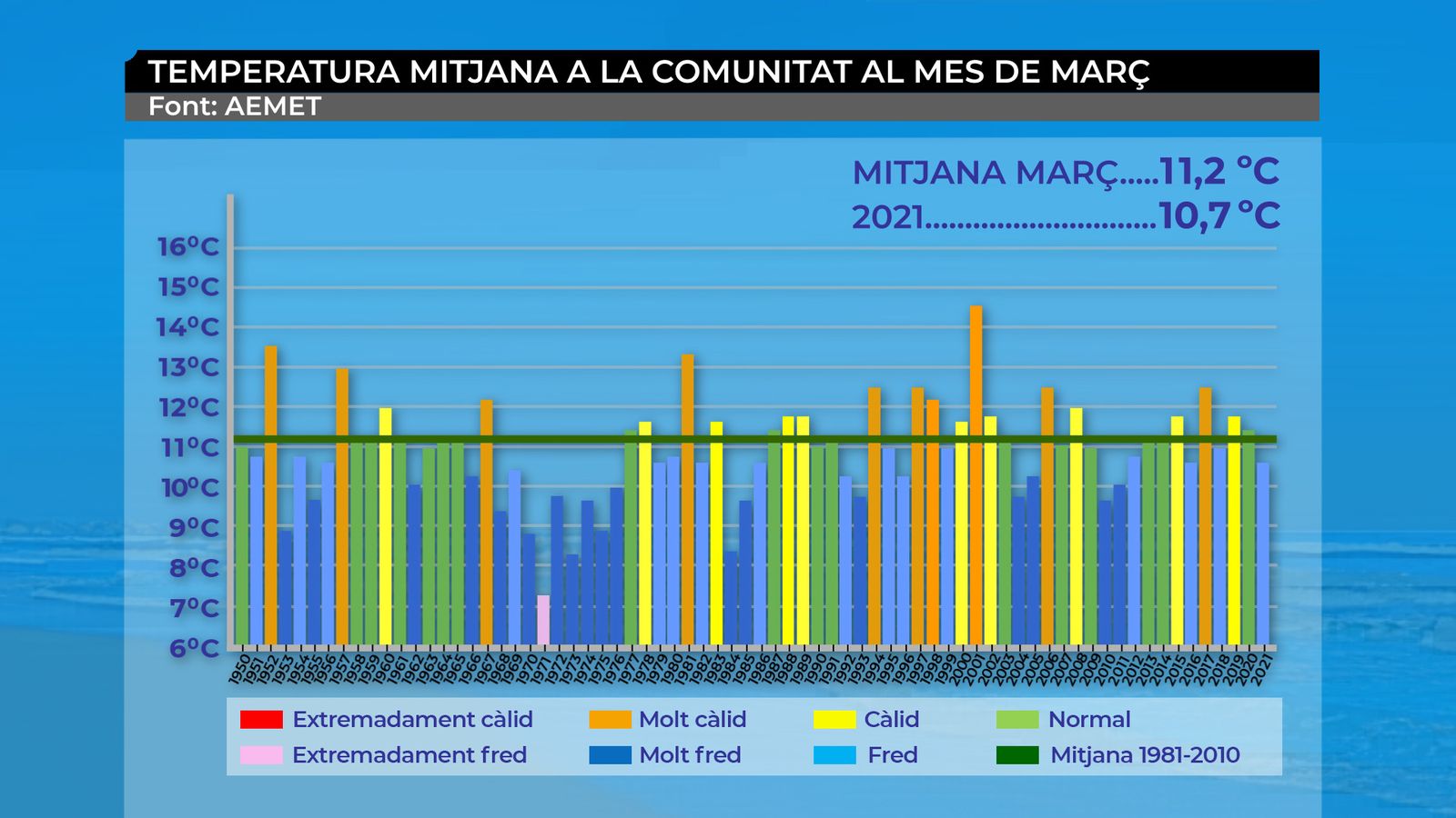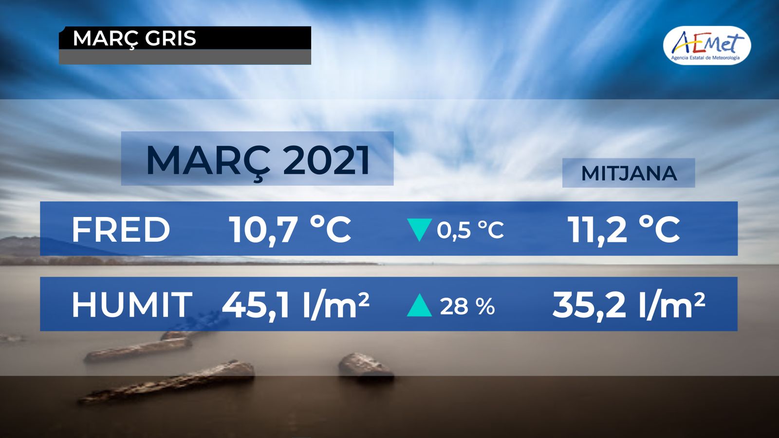 Segons les dades de l’Agència Estatal de Meteorologia (Aemet), març de 2021 ha sigut un mes fred i humit. La temperatura mitjana al conjunt del territori ha sigut de 10,7 °C, és a dir, 0,5 °C inferior a la mitjana.