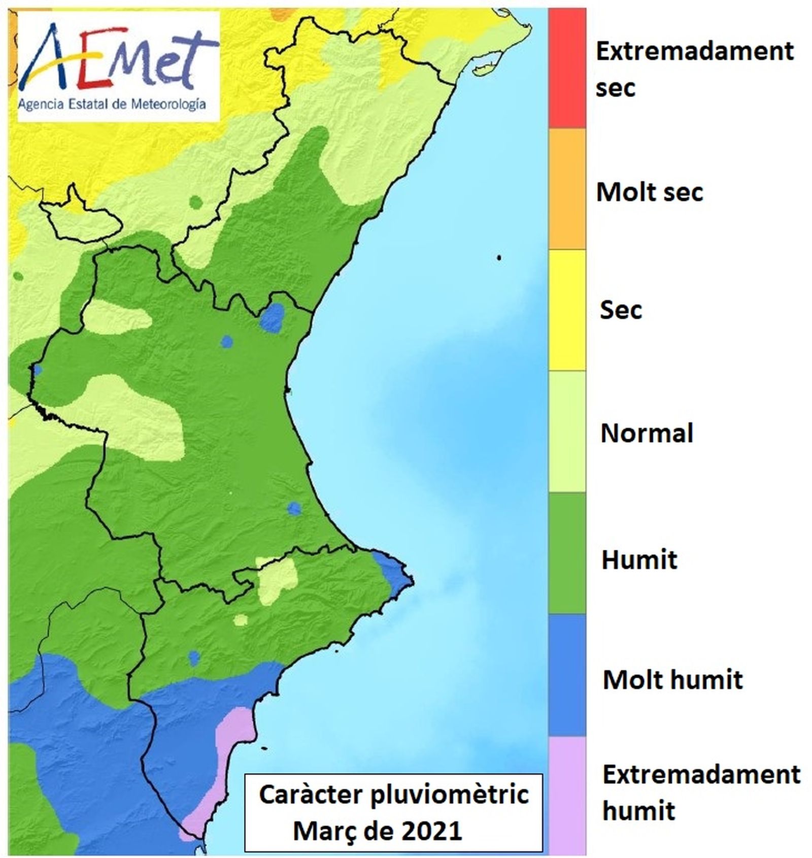 De fet, al litoral del Baix Segura i del Baix Vinalopó març ha sigut catalogat com extremadament humit. En contraposició, als Ports ha sigut un mes de març sec, el més sec des de 1998.