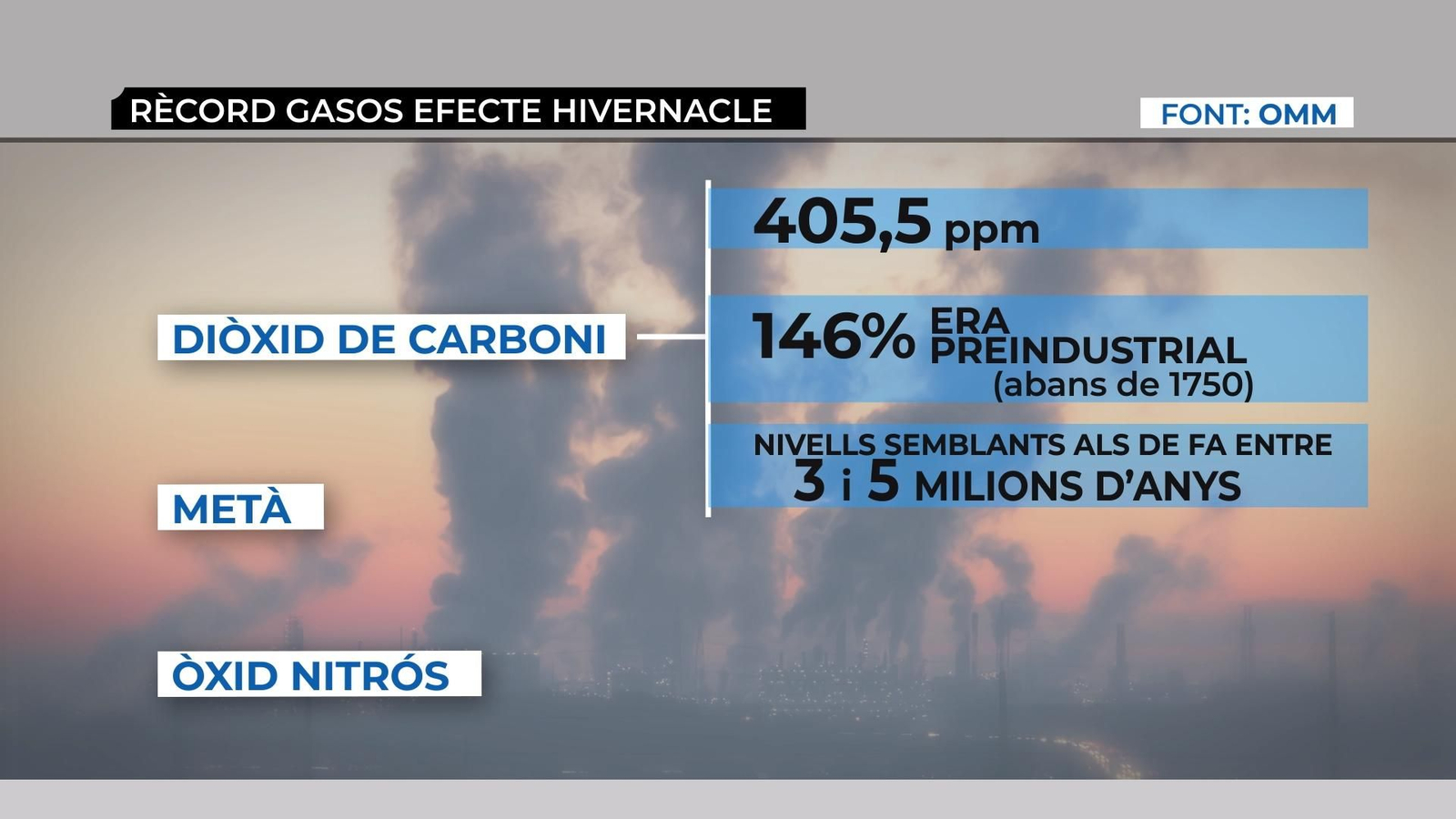 El continu ascens de la temperatura està clarament relacionat amb l'augment de gasos d’efecte hivernacle i l'Organització Meteorològica Mundial acaba de donar dades molt preocupants. Ja sabem que un dels principals gasos que provoquen el calfament del planeta és el diòxid de carboni, que ha arribat a una concentració de 405,5 parts per milió, cosa que representa un 146% respecte dels nivells de l'era preindustrial. S'estima que concentracions com aquestes no es donaven des de fa entre tres i cinc milions d'anys, quan la temperatura del planeta era de dos a tres graus superior a l'actual. Destaca, també, el creixement d'altres gasos com el metà o l'òxid nitrós, que també contribueixen a l'augment de les temperatures.