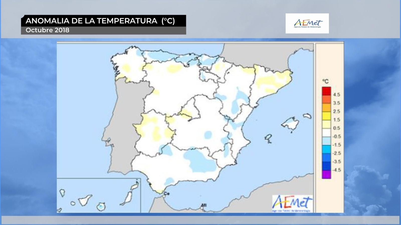 Però l'octubre de 2018 no ha sigut molt càlid a tot arreu. De fet, segons l'Agència Estatal de Meteorologia, el passat mes d'octubre es pot qualificar de tèrmicament normal a Espanya, ja que només s'ha quedat 0,1 °C per damunt de la mitjana climàtica.