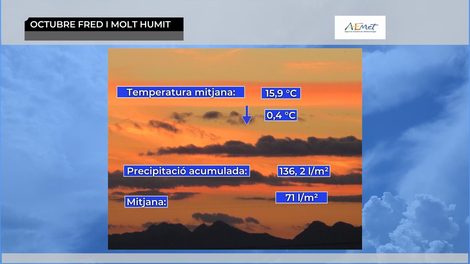 I si reduïm encara més el focus, a la Comunitat Valenciana vam tindre un octubre fred i humit, amb una temperatura mitjana de 15,9 ºC, quedant-se 0,4 ºC per davall de la mitjana climàtica. Excepcions dins d'un context de calfament global.