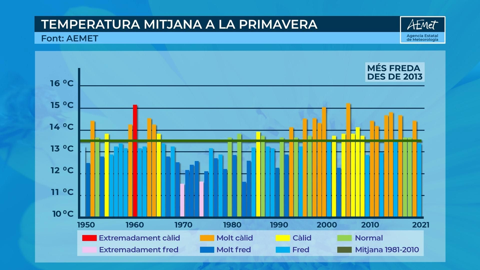 Si ens centrem en la temperatura, la mitjana ha sigut de 13,5 ºC en el conjunt del territori valencià. Ens hem de remuntar a 2013 per a trobar una primavera tan fresca. De calor, n'hem passat alguns dies, en especial el dia 16 de maig, quan es van superar els 35 ºC al litoral i prelitoral central i sud. En aquest cas, Elx torna a estar en el top pel que fa a la màxima més alta registrada, amb 37,8 ºC. Pics de calor, però també de fred, sobretot entre el 18 i el 21 de març. La de la nit de la no-Cremà d'enguany passarà a la història per ser la més freda des de l'any 1975.
