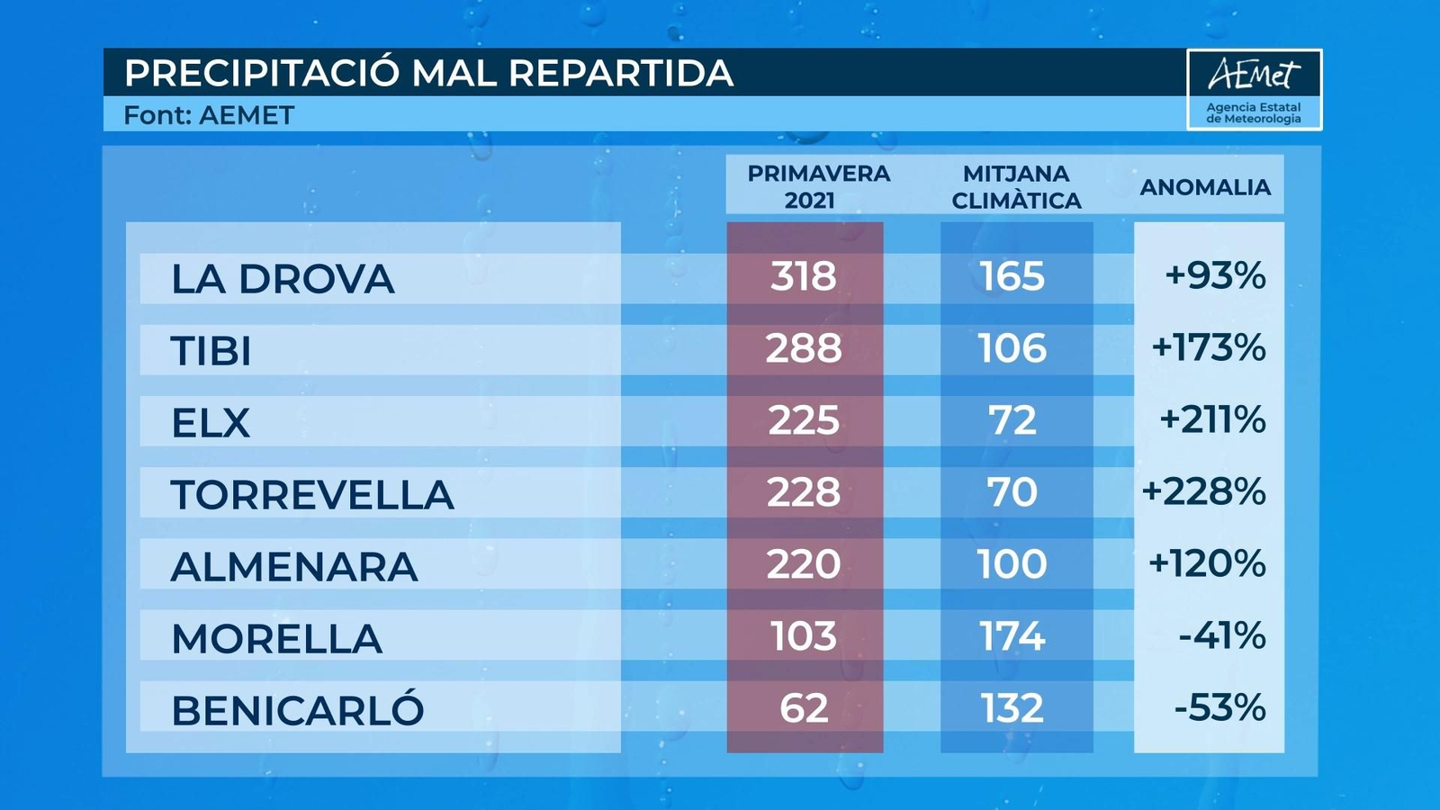 De totes les dades que ens deixa el trimestre primaveral, és molt remarcable el que va passar durant el mes d'abril. Va ploure en 22 dels seus trenta dies, una persistència que s'observa poc en les nostres contrades. Hi ha va haver poques tempestes, llevat de la que el dia 11 va deixar una intensa granissada a localitats de la Plana Baixa com Artana, la Vall d'Uixó, Nules o Moncofa. També destaca la tempesta que el 26 d'abril va descarregar fins a 65 l/m2 a Elx. De fet, a l'aeroport d'Alacant-Elx ha sigut la primavera més humida des de l'any 1967, amb 223 l/m2 arreplegats. En l'altre extrem, però, trobem localitats del Baix Maestrat i dels Ports, on la precipitació ha quedat molt per davall de la mitjana, com es pot comprovar en la següent taula.