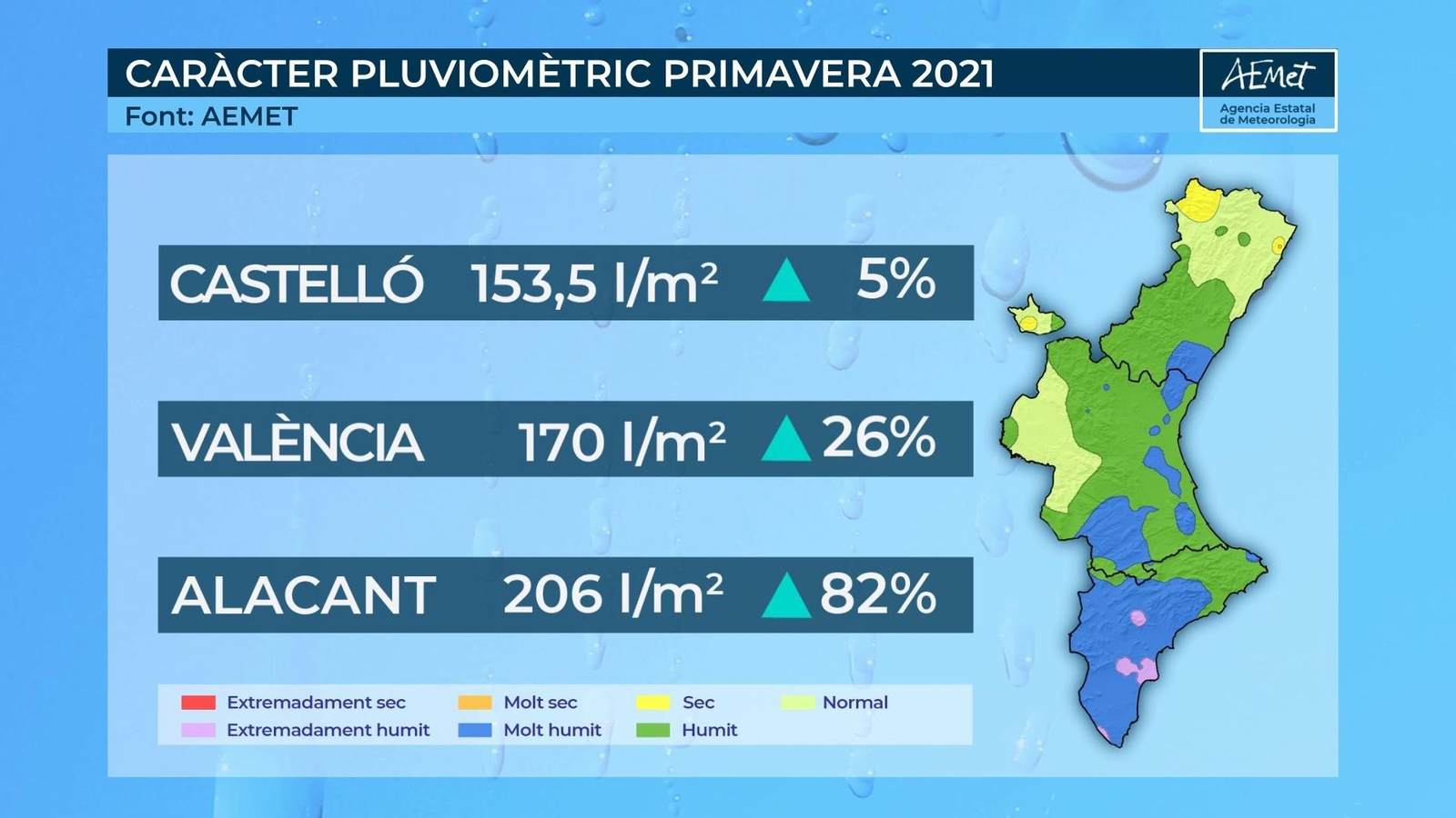Deixem arrere una primavera més freda de l'habitual i sobretot, més humida, però amb grans contrastos entre el nord i el sud. Mentre que en algunes zones d'Alacant les pluges han triplicat les habituals, a l'extrem nord els registres indiquen un dèficit pluviomètric