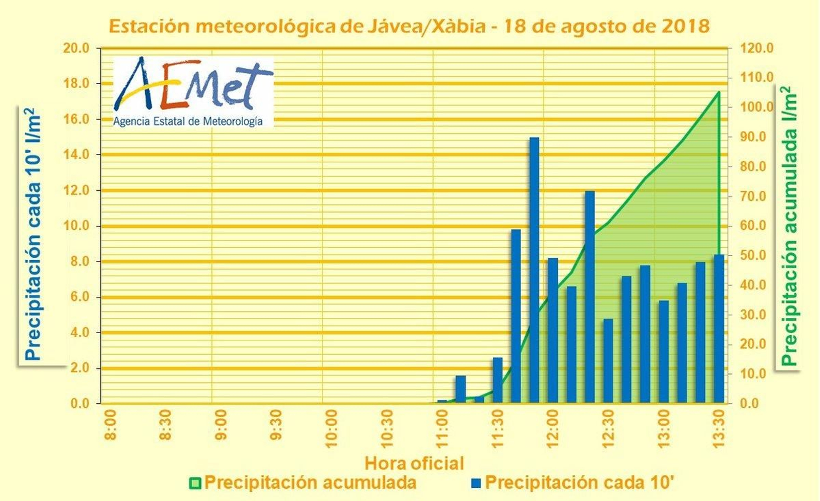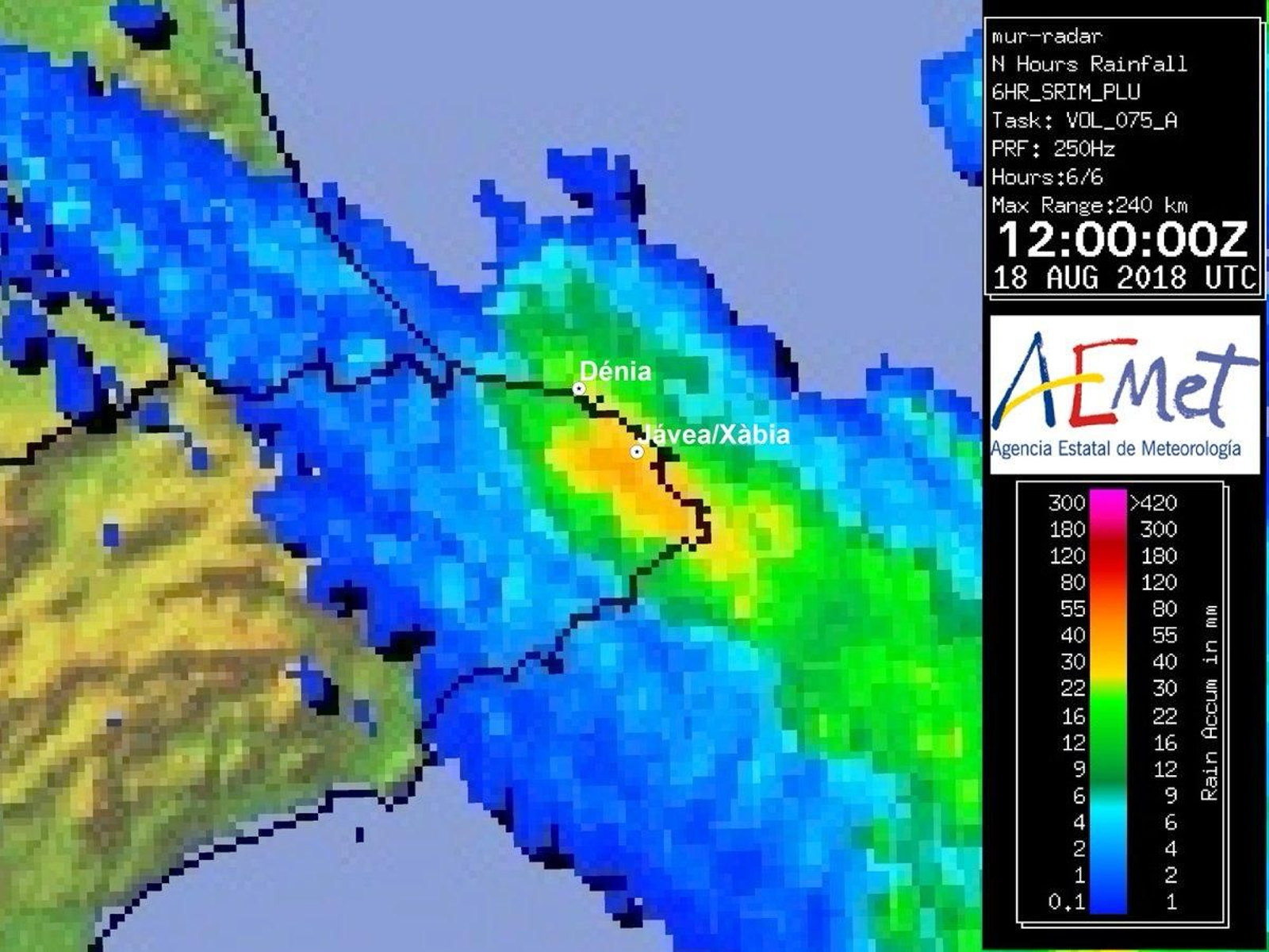 La pluja s'ha focalitzat entre Dénia i Xàbia amb pluja acumulada que ha fluctuat entre els 60 i els 128 l/m². El radar mostra que no s'han registrat reflectivitats massa altes, com correspondria a la intensitat torrencial de la pluja registrada en alguns observatoris, però sí que ha detectat molt bé la focalització. Es tracta de tempestes que es formen per convecció de tipus càlid, i que no són gens inusuals al litoral de la Marina a l’agost. Només hem d'anar al 2009 per a trobar-ne de semblants.