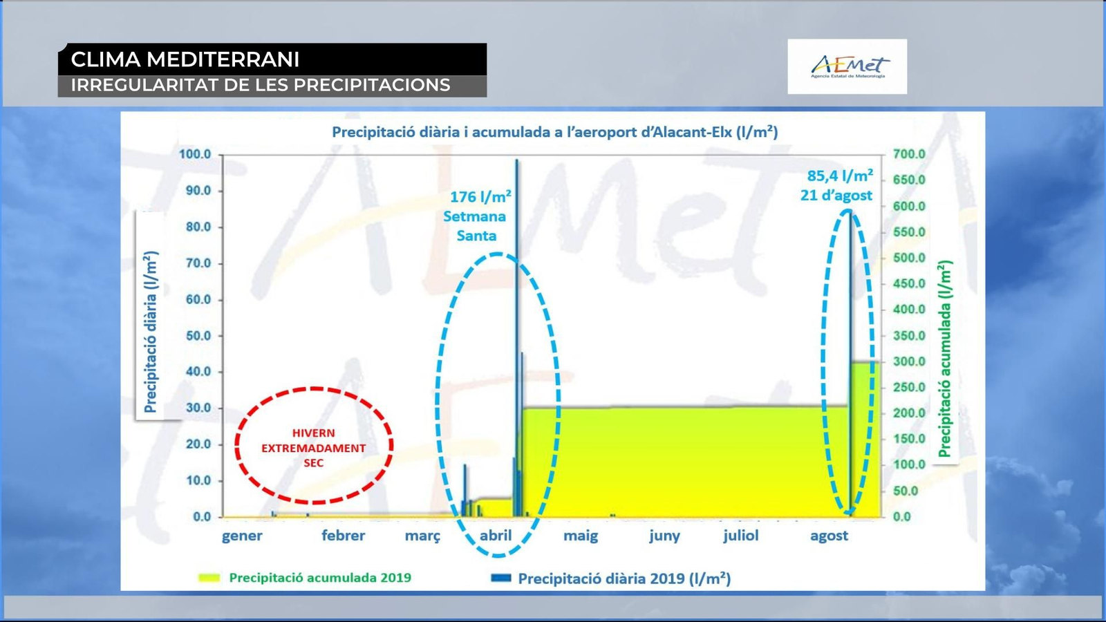 La irregularitat de les precipitacions és una de les característiques més notables del clima mediterrani. L'observatori de l'aeroport d'Alacant-Elx enguany n'és un gran exemple, ja que ha rebut els 80% de la precipitació que porta fins ara en només tres dies.