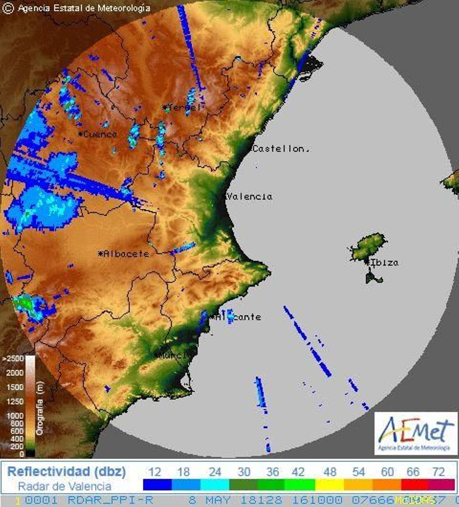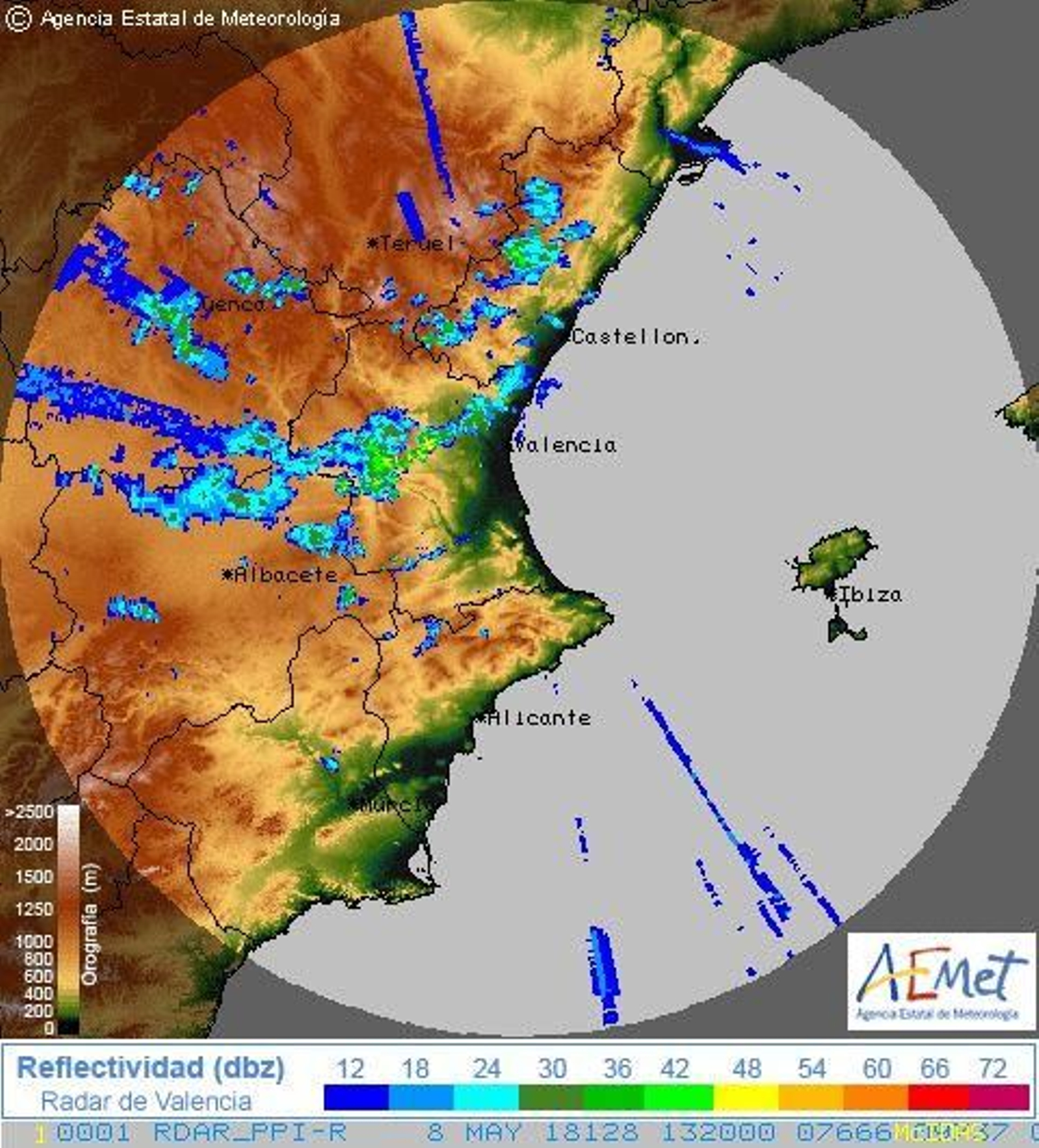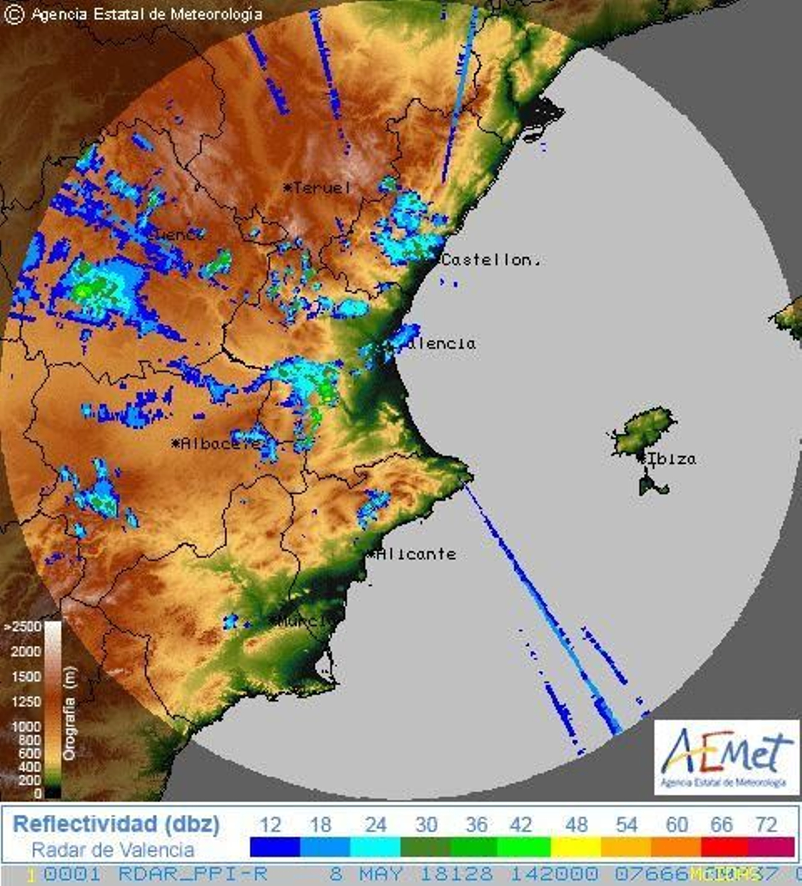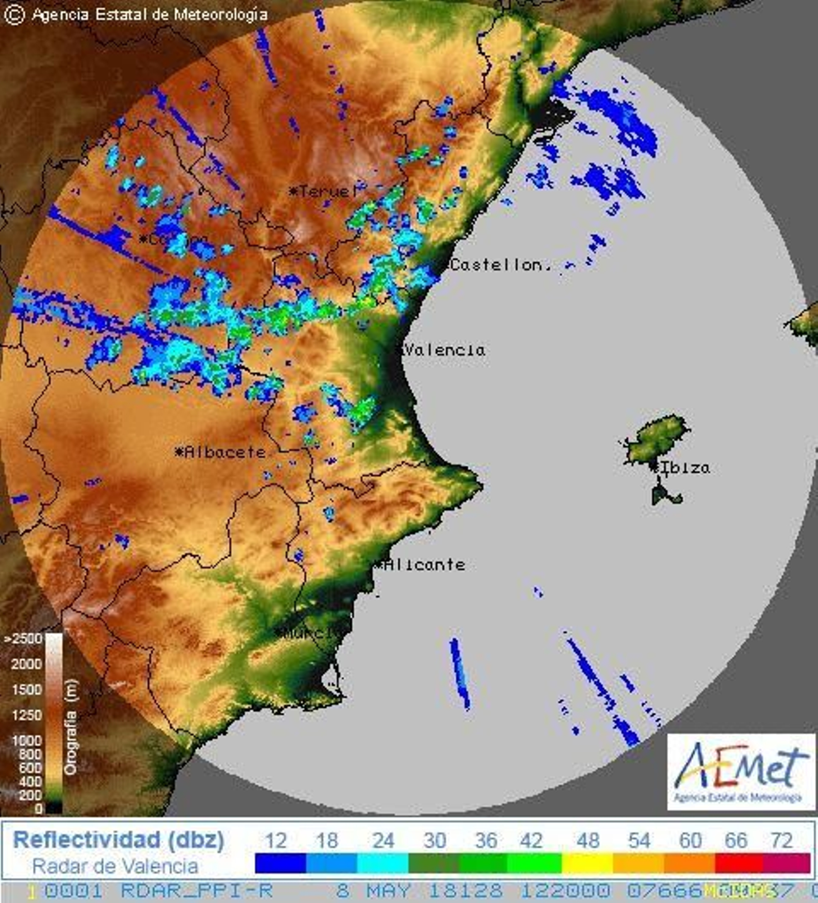 Ha sigut tot just a primera hora de la vesprada que s'han produït les tempestes més fortes. Per contra, a la imatge de les 18:10 h del radar meteorològic veiem com la majoria de les tronades ja s'havien dissipat. Entre les quantitats més importants, destaquem els 25 l/m² de Xodos (l'Alcalatén), 23 l/m² a Bunyol (la Foia de Bunyol), 20 l/m² a Villena (l'Alt Vinalopó) o els 17 l/m² a Sogorb (l'Alt Palància).