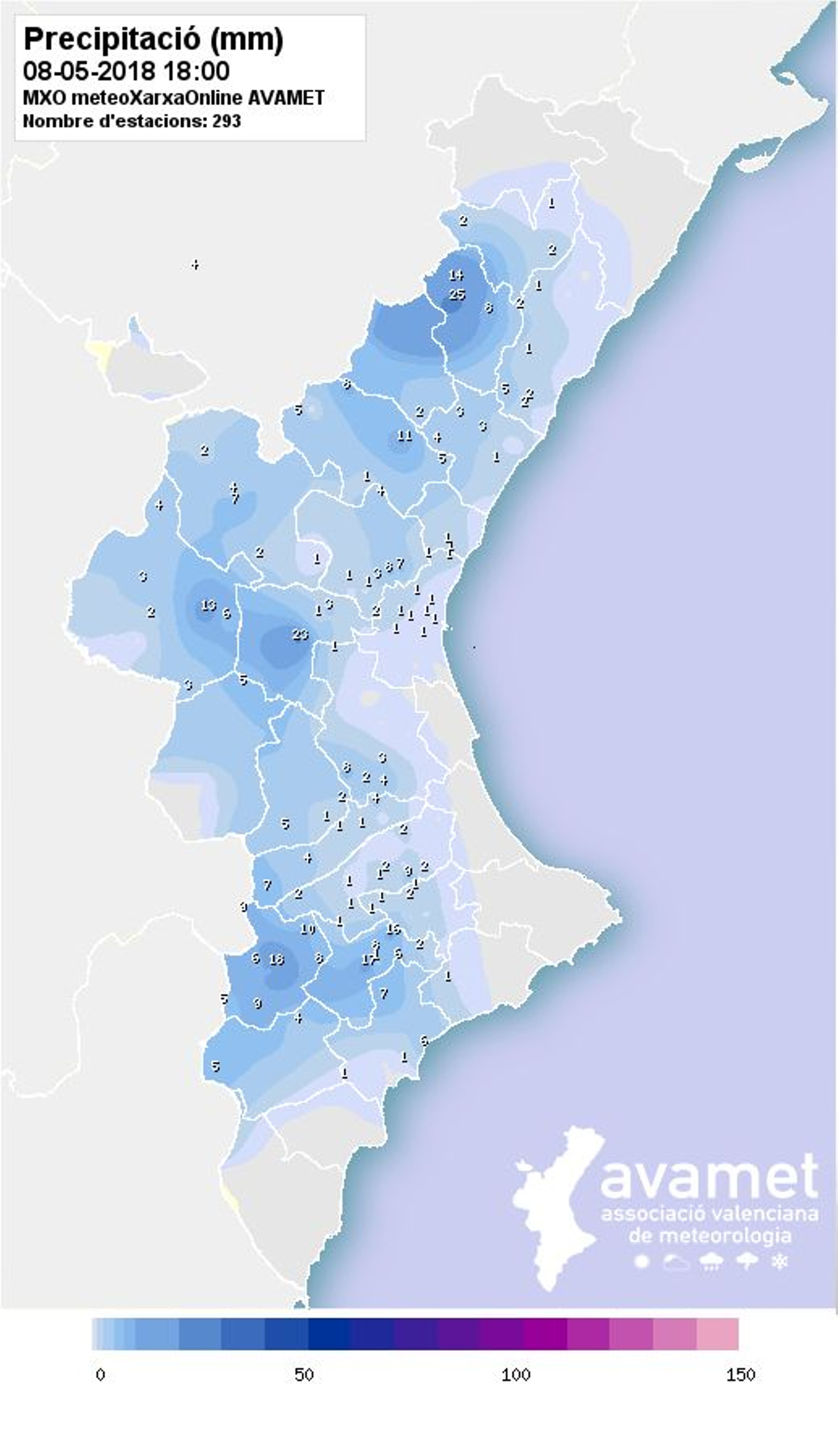 Pluja acumulada 08/05/2018 fins a les 18:00 h en mm o l/m² / AVAMET