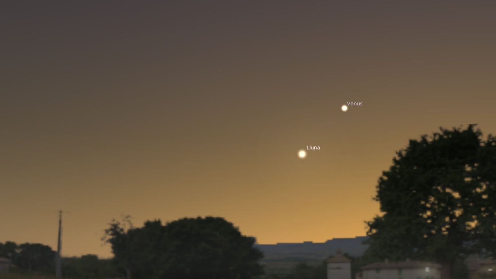17 d'abril, 21.00 h. Cel visible cap a l'oest. La lluna creixent estarà al costat del planeta Venus.