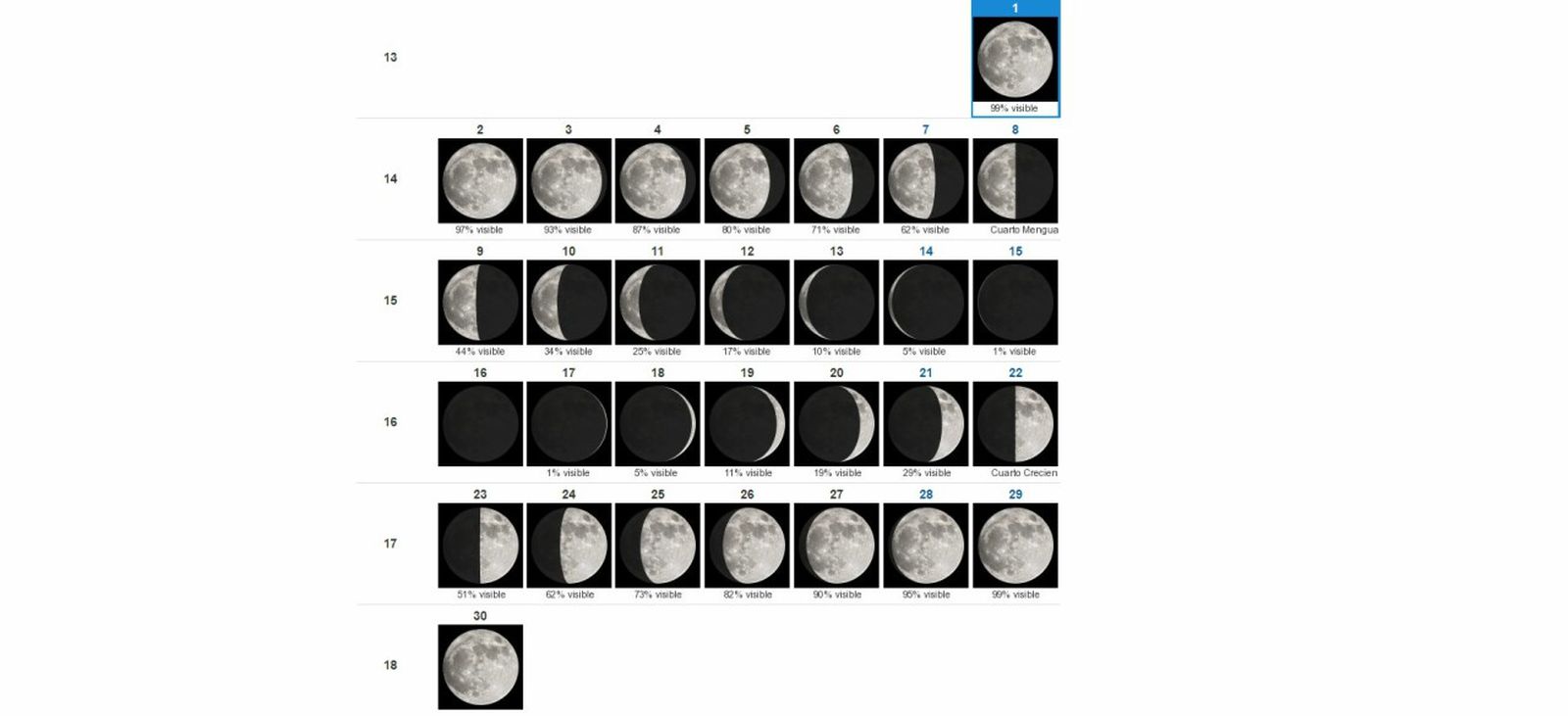 La lluna farà el ple el dia 30 d'abril i serà nova el 16 d'abril. Ací podeu vore les fases lunars al llarg del mes.