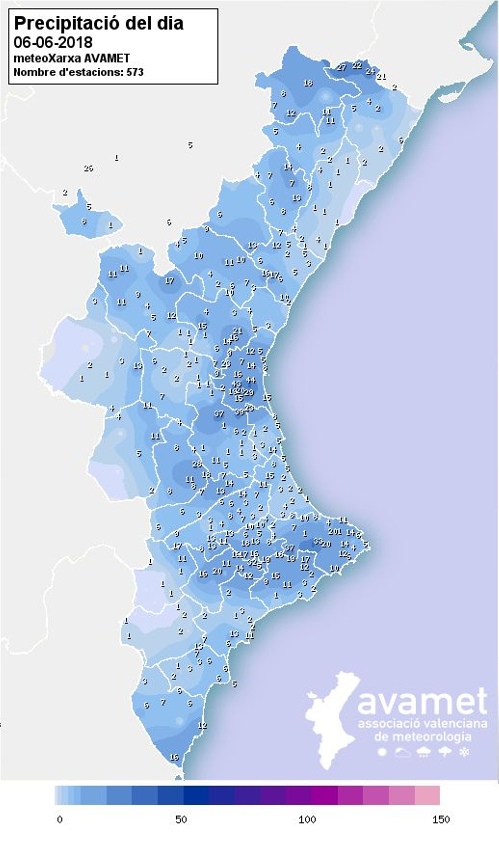 Les pluges van ser escasses a les comarques del Vinalopó, la Plana d'Utiel-Requena, la Vall d'Aiora-Cofrents, la Plana Alta i la Safor. Però en altres zones les precipitacions van superar els 30 l/m². Destaquen dos màxims: el primer el trobem a les comarques centrals del golf de València, amb quantitats de fins a 44 l/m² a Catarroja i 43 a Picassent. Un segon màxim el localitzem a les comarques del nord d'Alacant, amb registres de fins a 48 l/m² a Murla o 36,5 a Parcent.