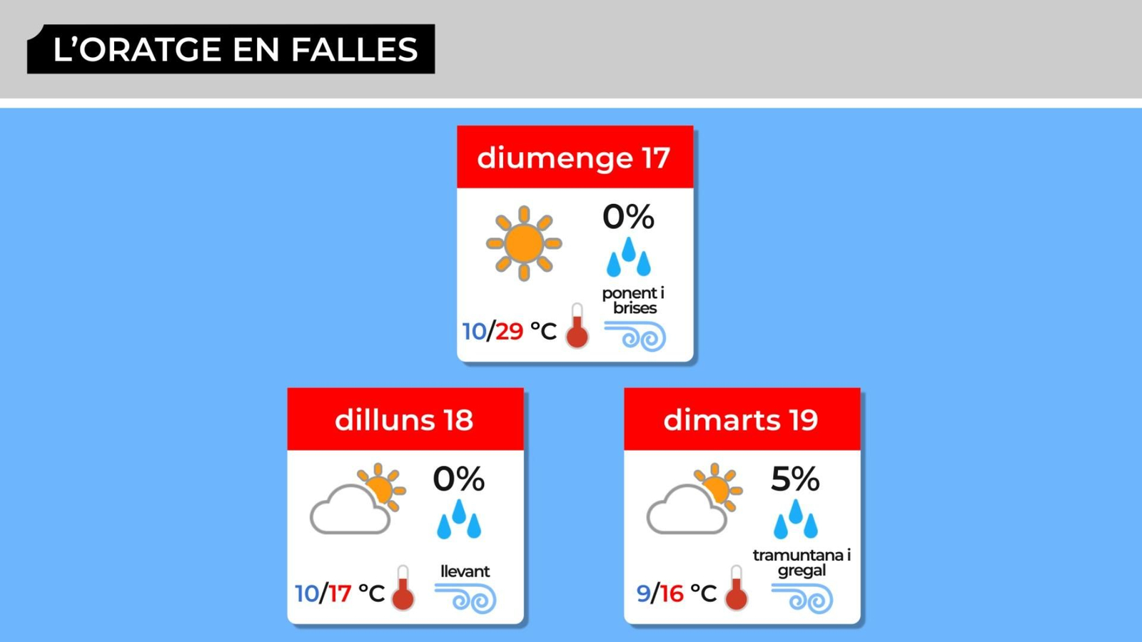 Després dels 30 °C de diumenge, acabarem les falles amb temperatures típiques de final d'hivern i probabilitat de ruixats el dimarts.