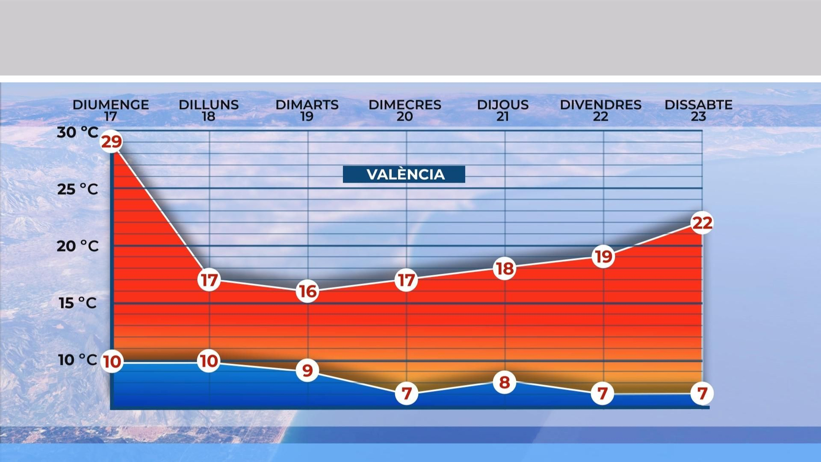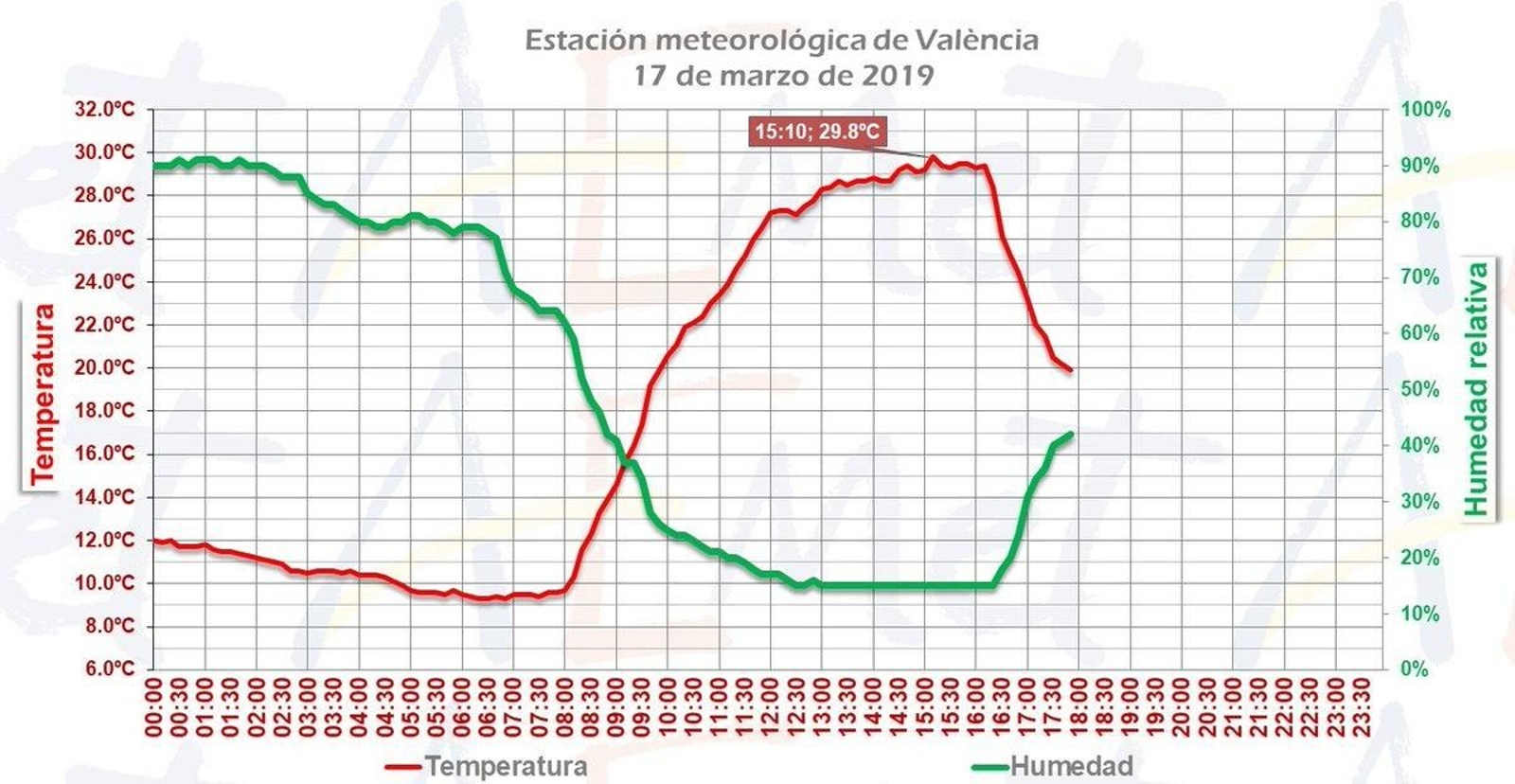 Diumenge ha sigut un dia quasi d'estiu, amb temperatures màximes de 30 °C a la ciutat de València. Encara que a partir de les 16:00 hores ha canviat la direcció del vent, de ponent a gregal i, les temperatures han baixat en poc més d'una hora més de sis graus.