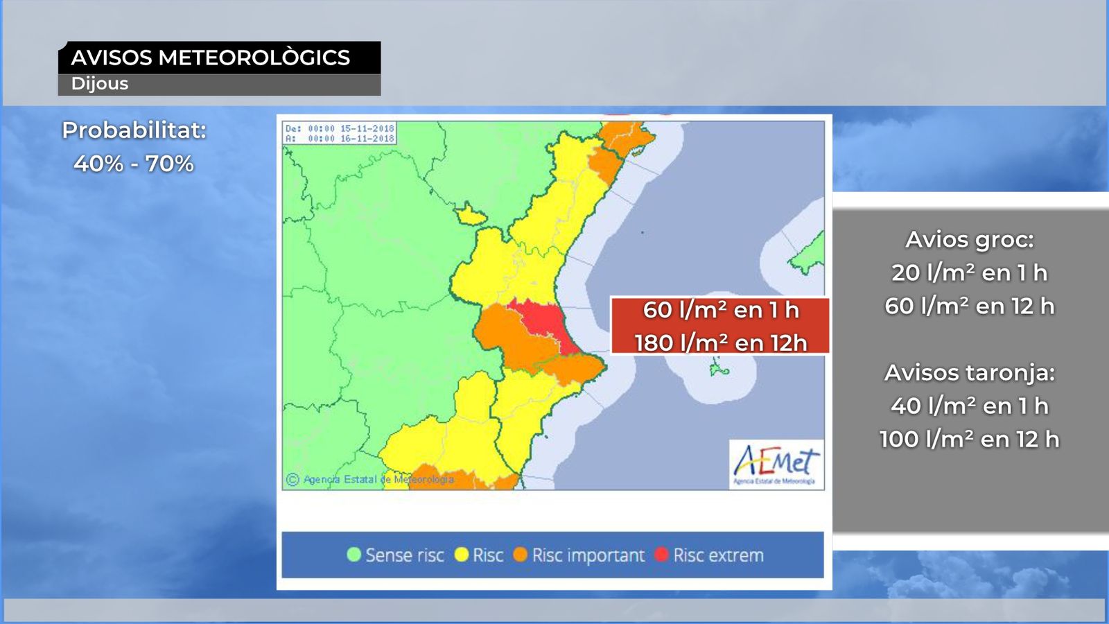 Els avisos actius dijous a la resta del territori són groc o taronja, segons les comarques. Estem davant d'una situació de pluges fortes, que en algunes localitats seran persistents i acumularan quantitats molt importants.