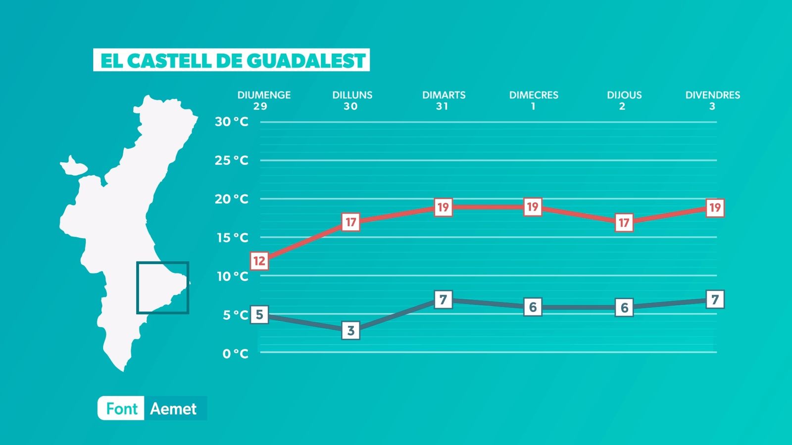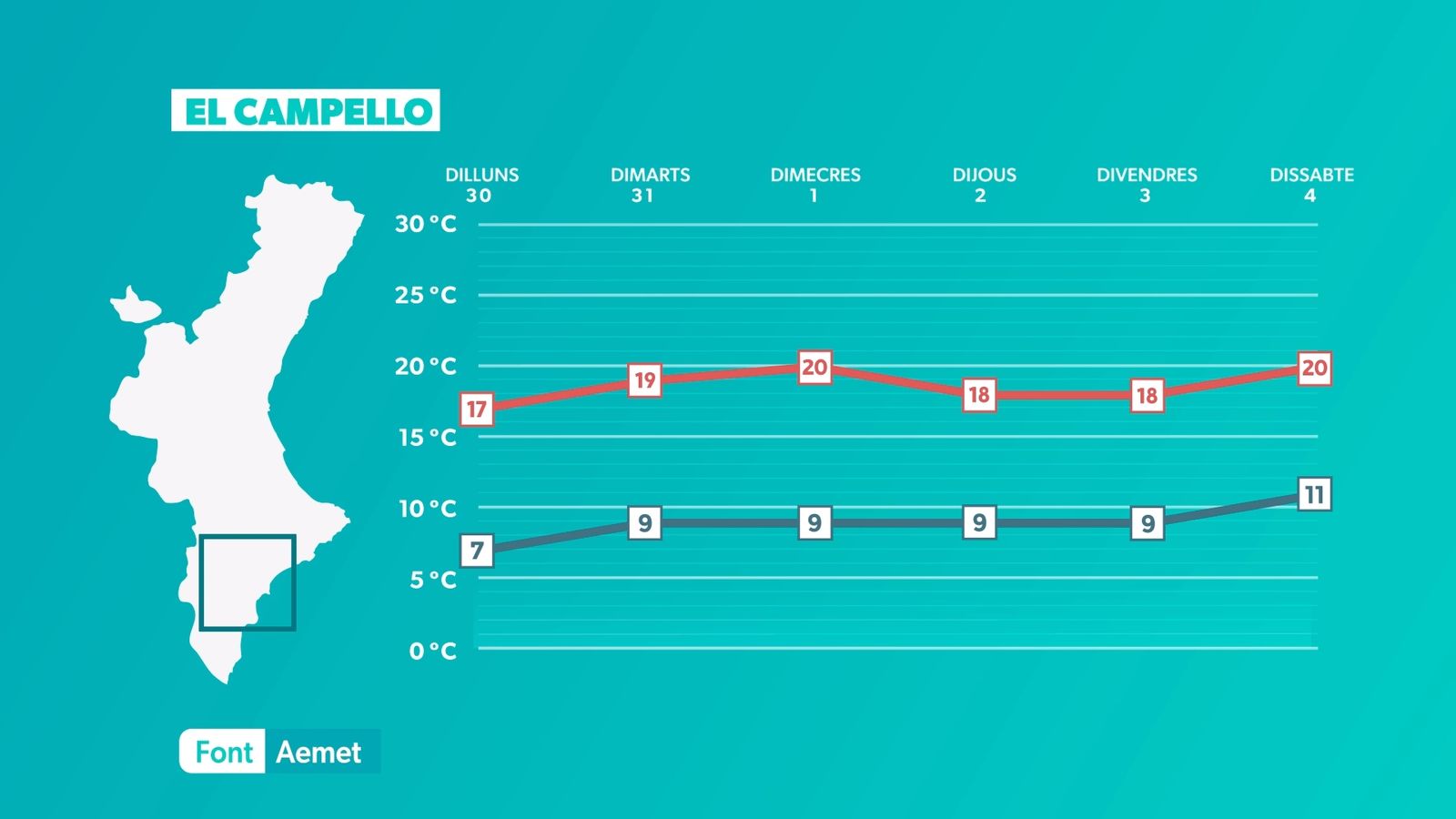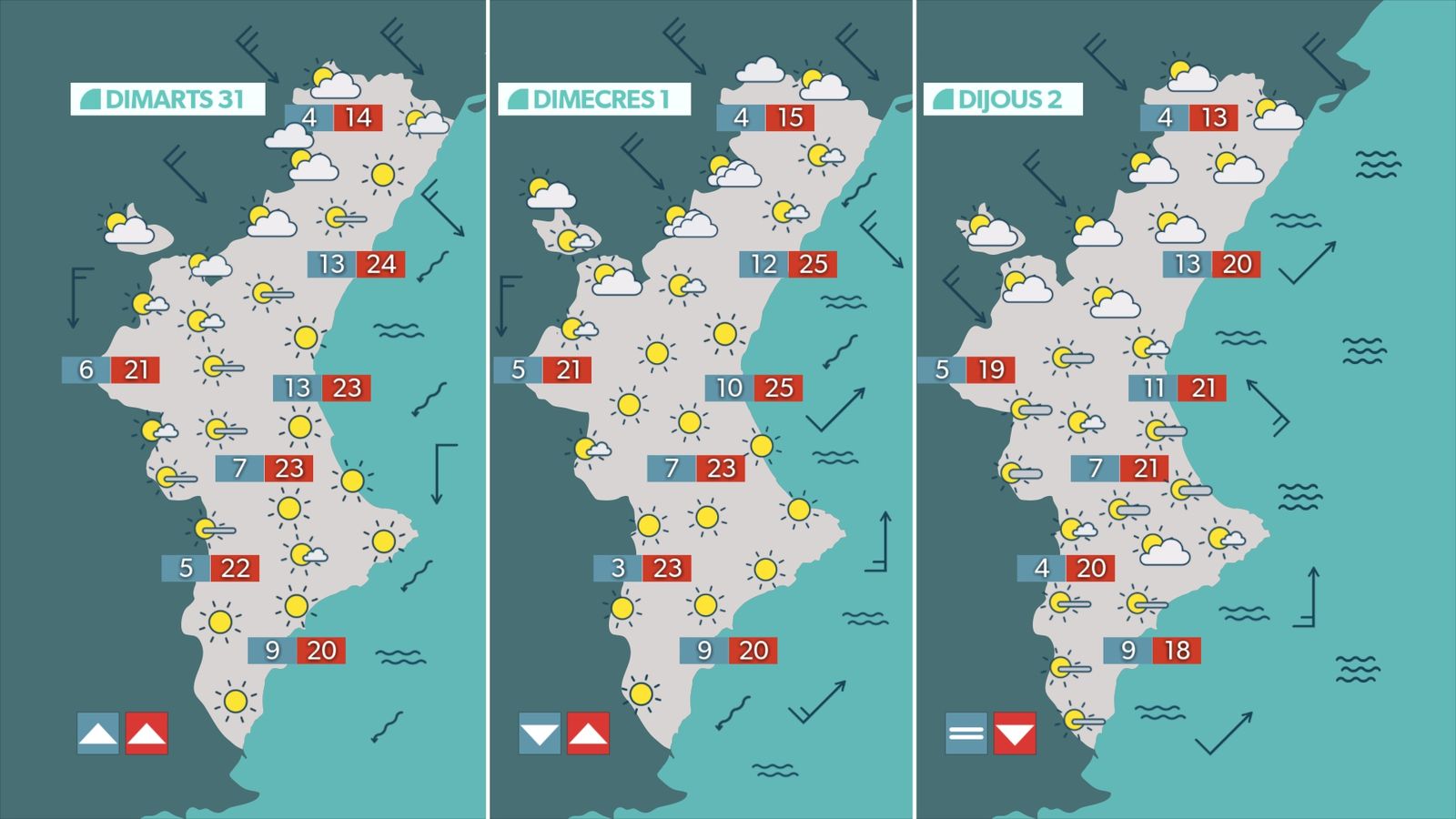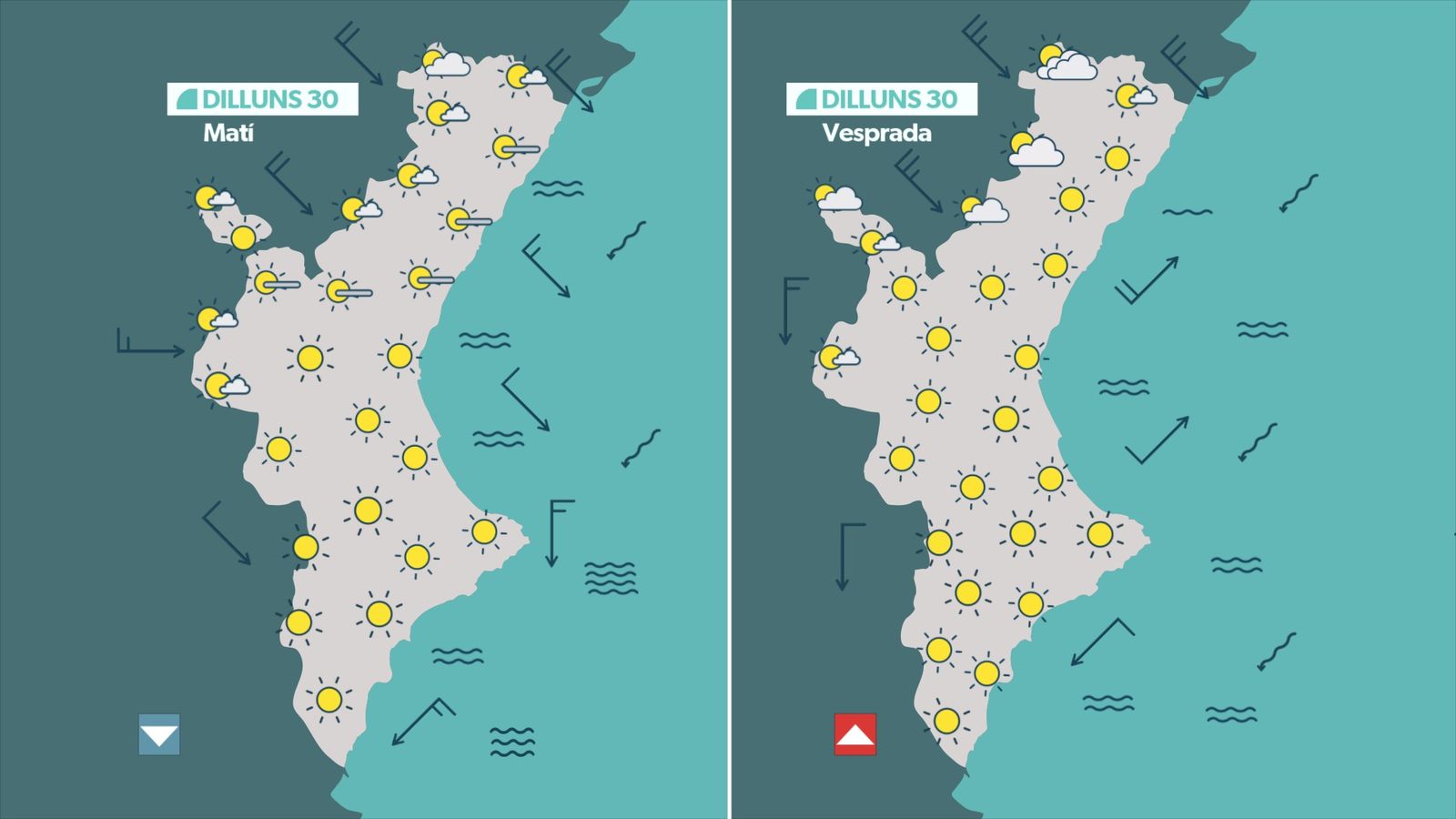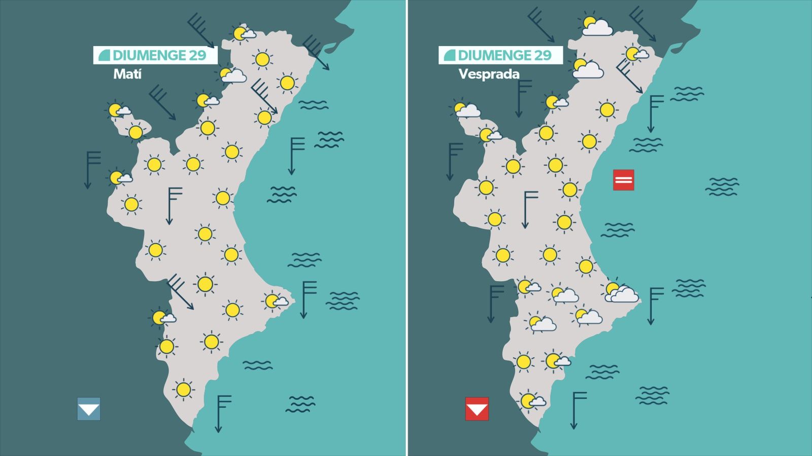 Diumenge serà assolellat, amb intervals de núvols baixos al nord de Castelló i al nord d'Alacant, amb baixa probabilitat de ruixats dèbils a la Marina Alta.