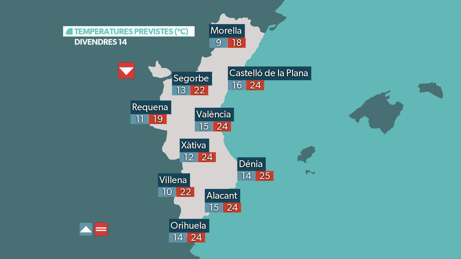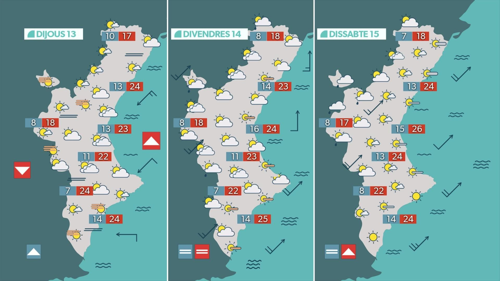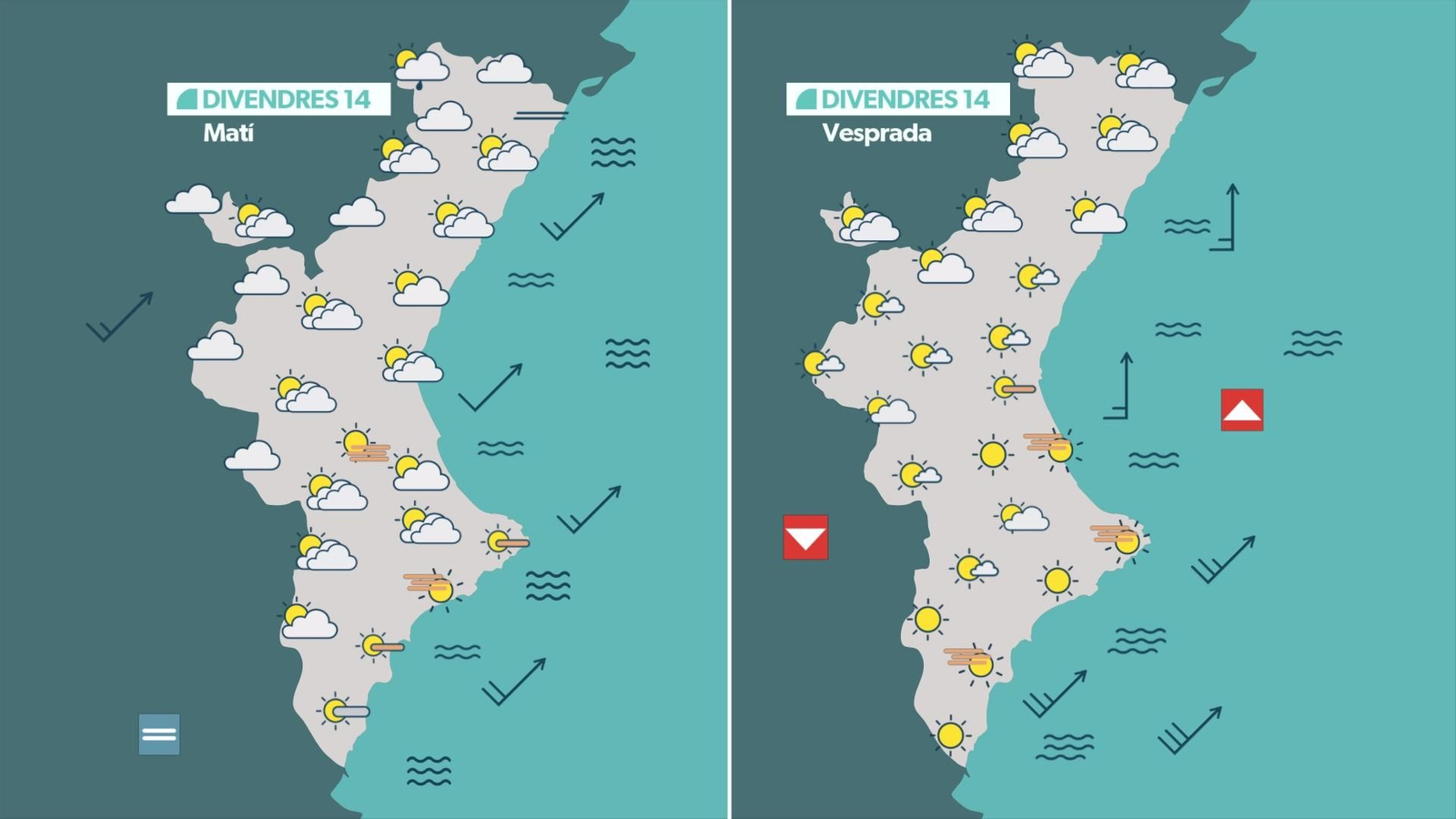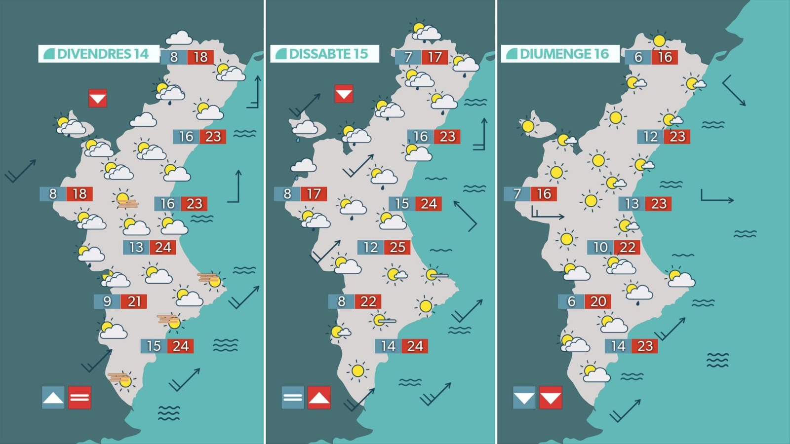 Divendres, el pas d'un front ens deixarà molts núvols però poques pluges. Sí que són probables alguns ruixats a l'interior, però poc importants i acompanyats de fang, perquè es mantindrà la calitja. Ja de vesprada s'obriran clarianes i a última hora el cel quedarà ras. El vent girarà a sud i llebeig, amb ratxes moderades al litoral d'Alacant i notable alteració marítima. Pujaran les mínimes, mentre que les màximes baixaran a l'interior. Per contra, a la costa i comarques centrals seran molt elevades, amb valors de 23 °C a 25 °C.