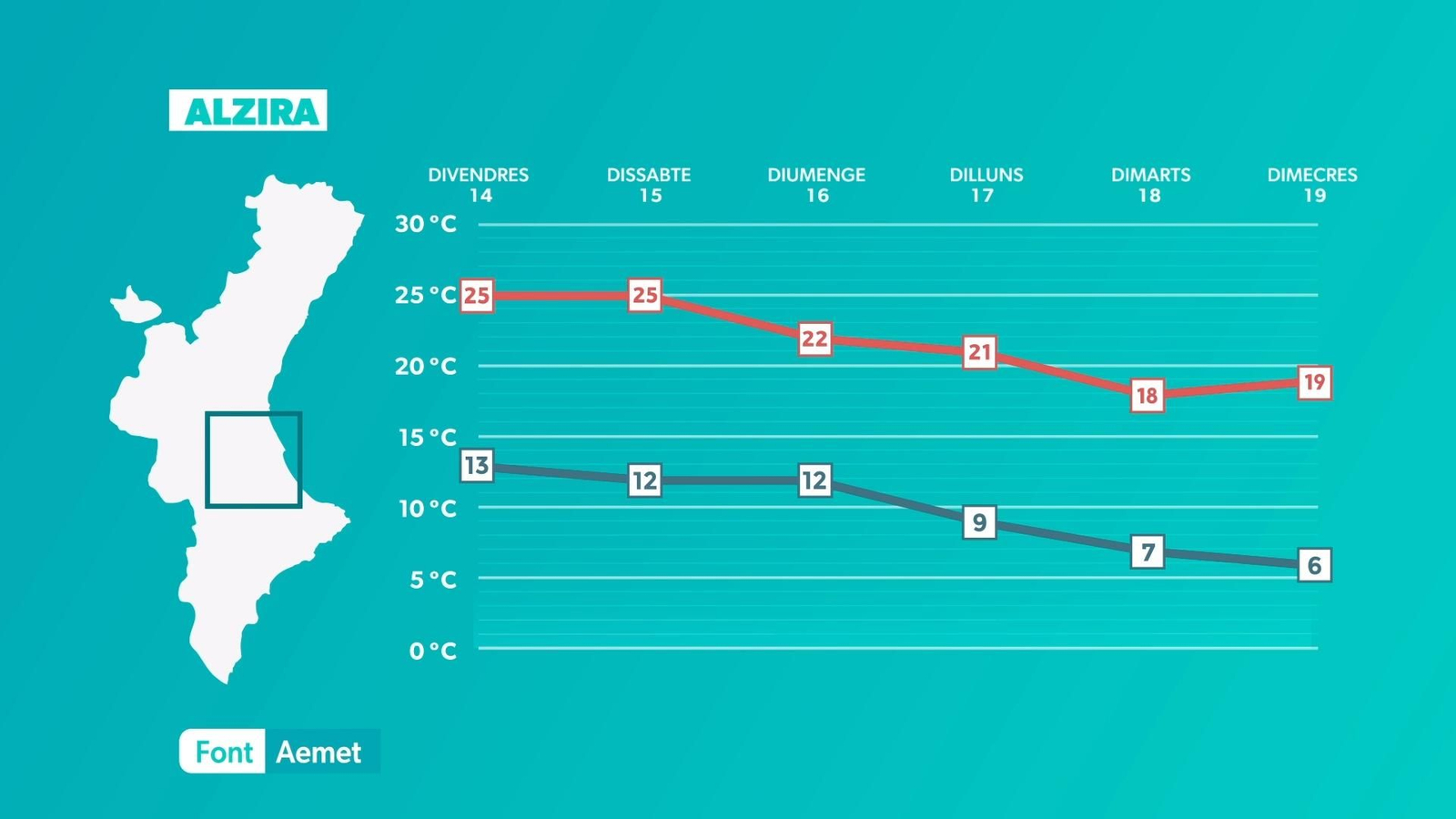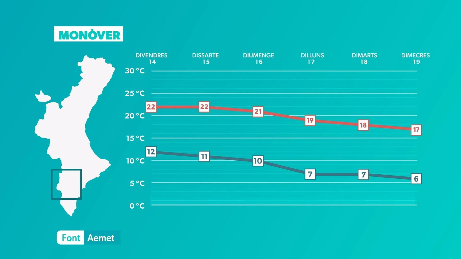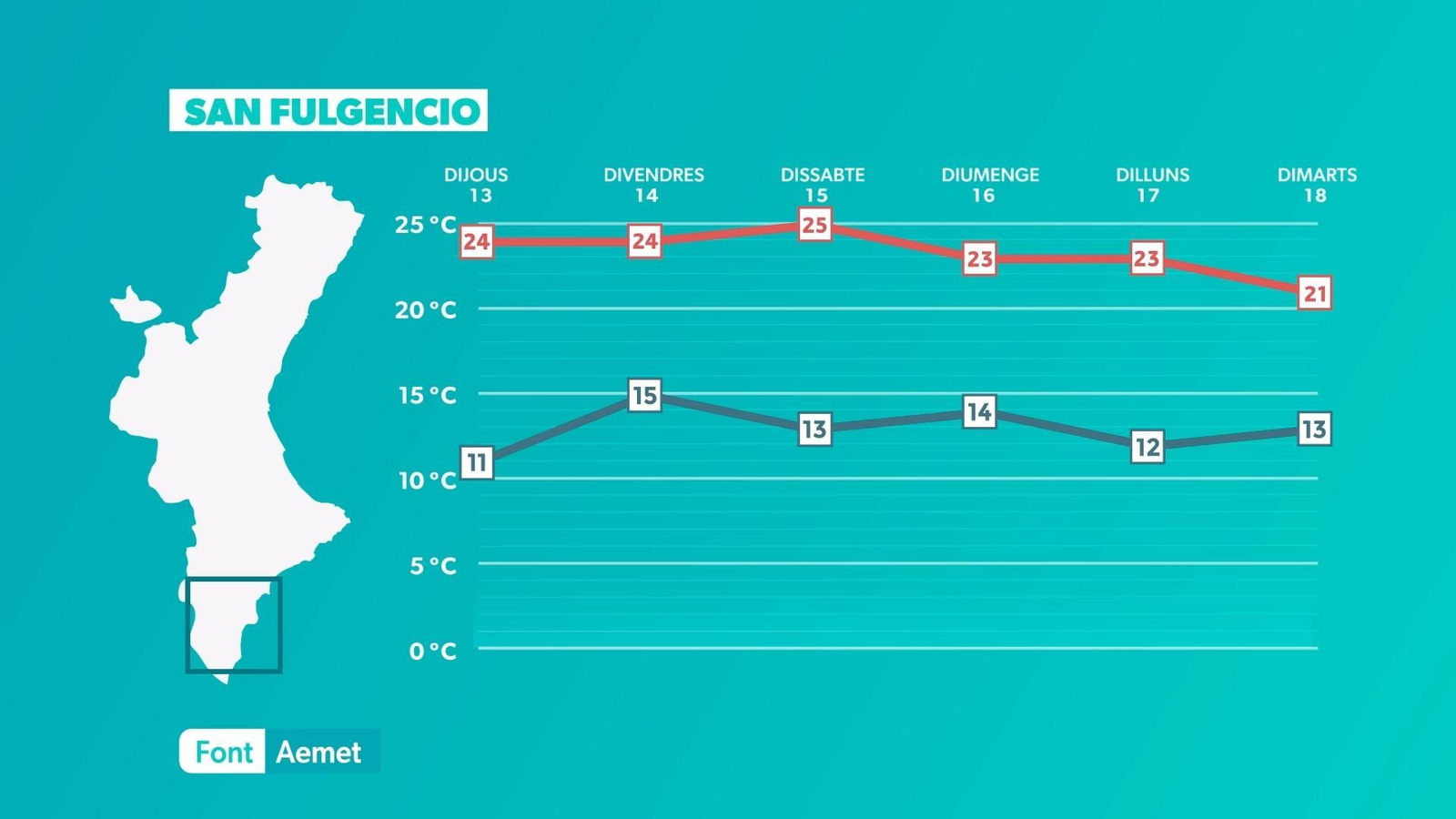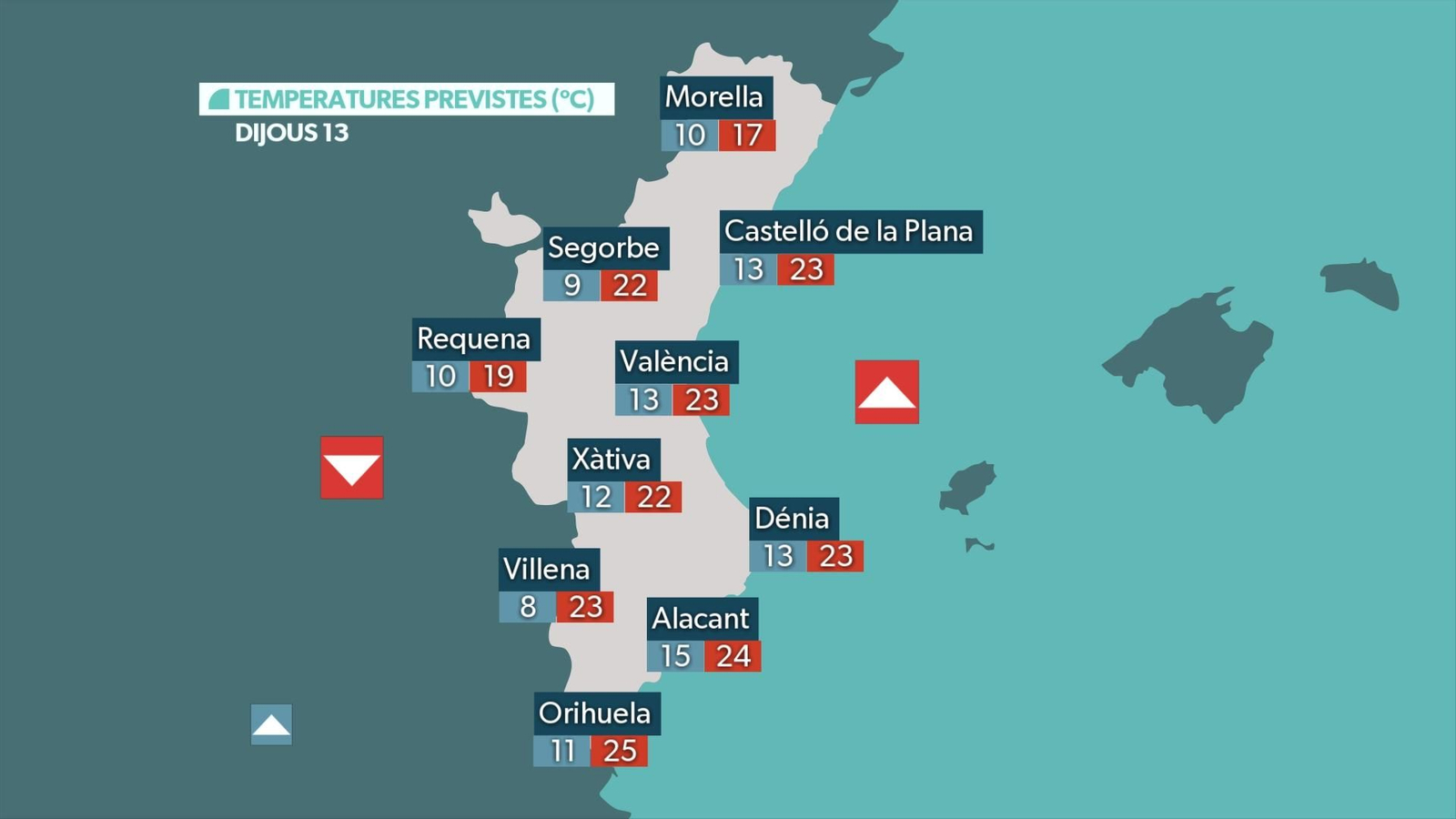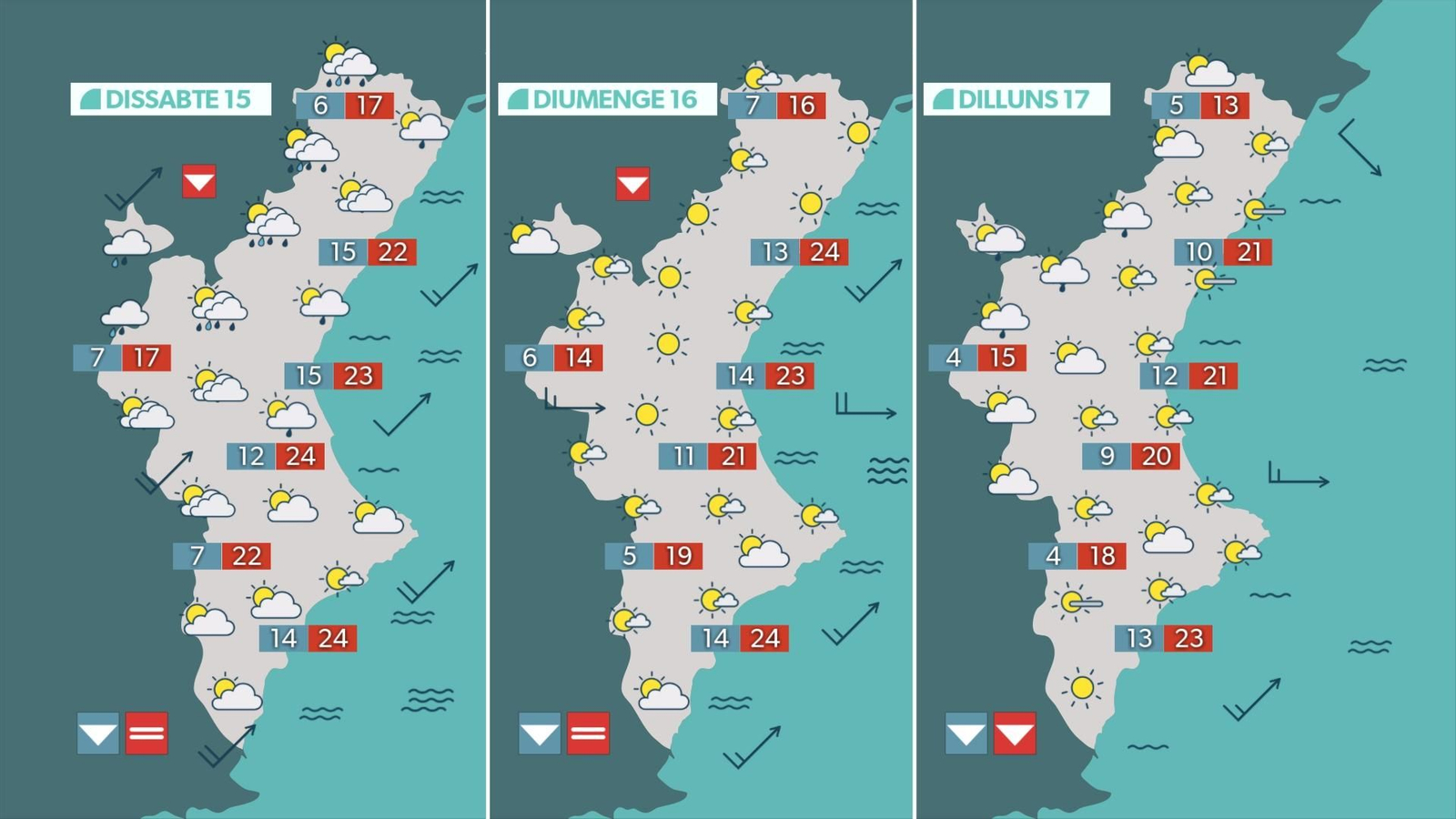 Divendres, el pas d'un front ens deixarà molts núvols però poques pluges. Sí que són probables alguns ruixats a l'interior, però poc importants i acompanyats de fang, perquè es mantindrà la calitja. Ja de vesprada s'obriran clarianes i a última hora el cel quedarà ras. El vent girarà a sud i llebeig, amb ratxes moderades al litoral d'Alacant i notable alteració marítima. Pujaran les mínimes, mentre que les màximes baixaran a l'interior. Per contra, a la costa i comarques centrals seran molt elevades, amb valors de 23 °C a 25 °C.