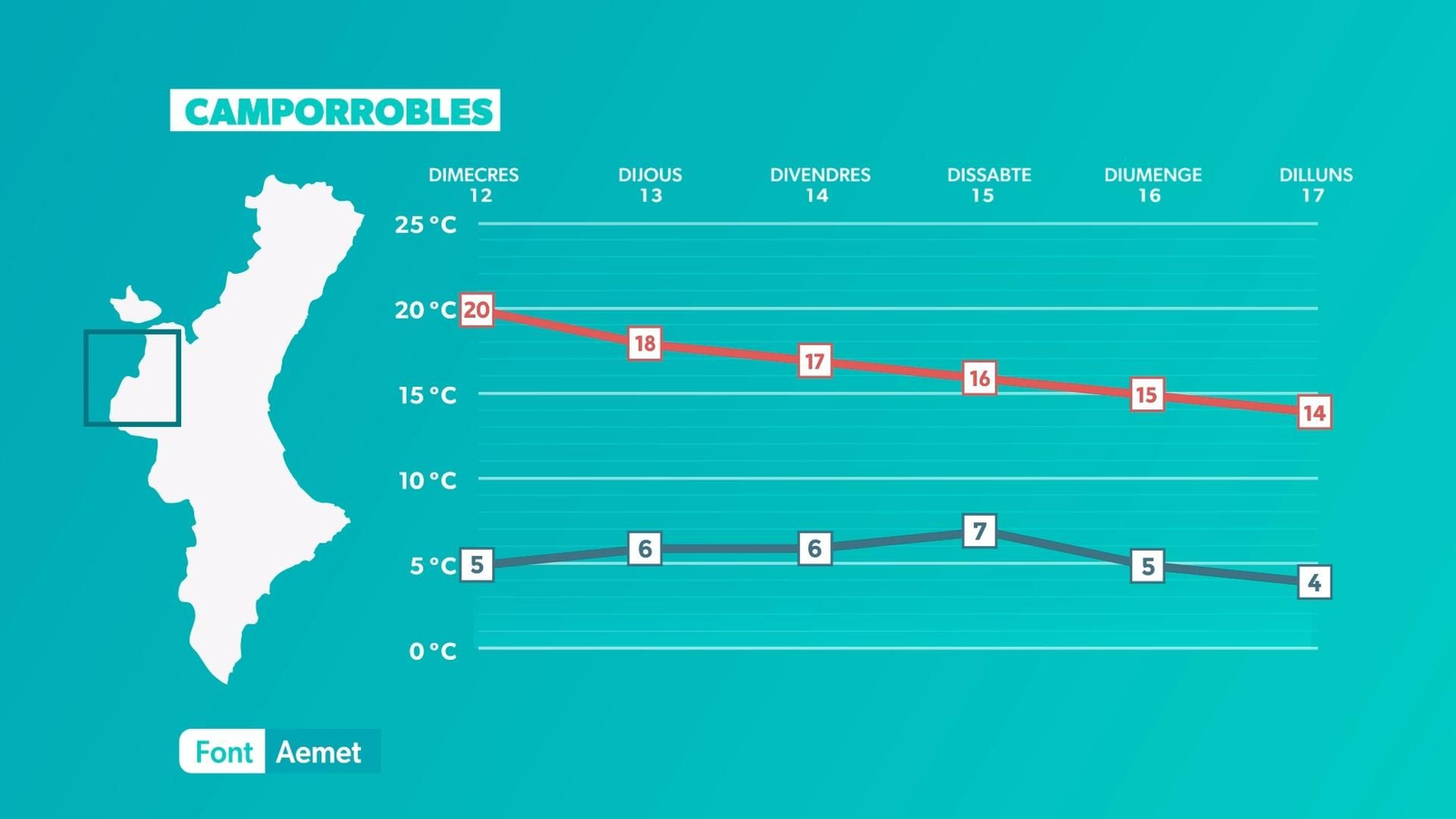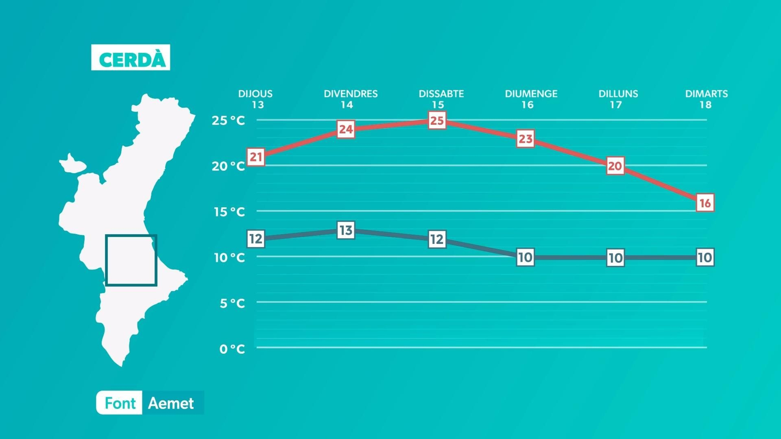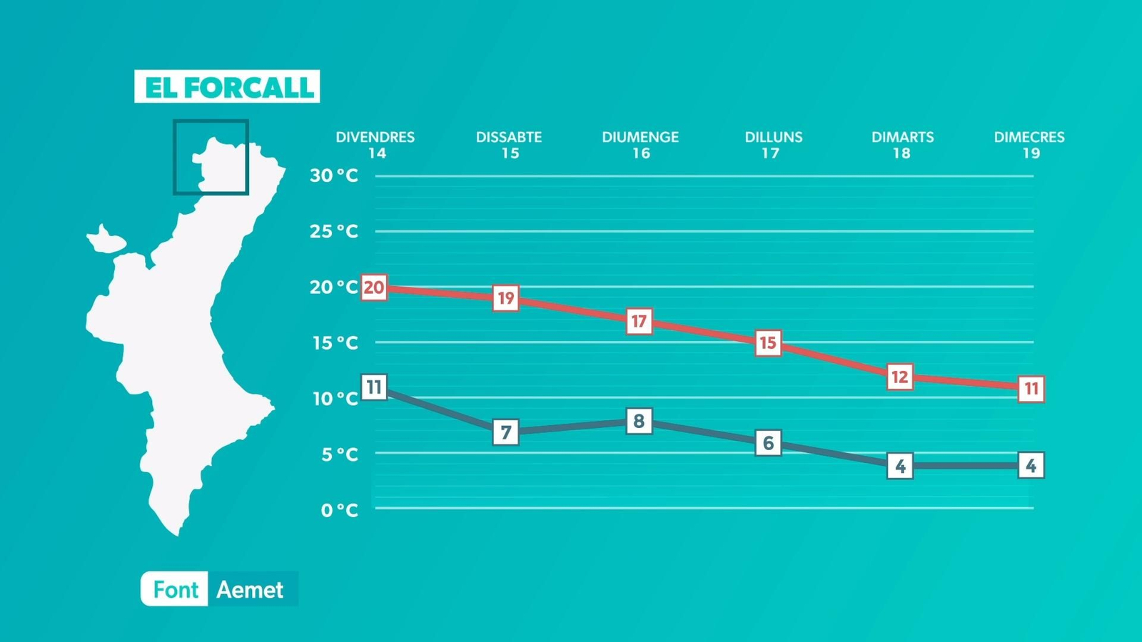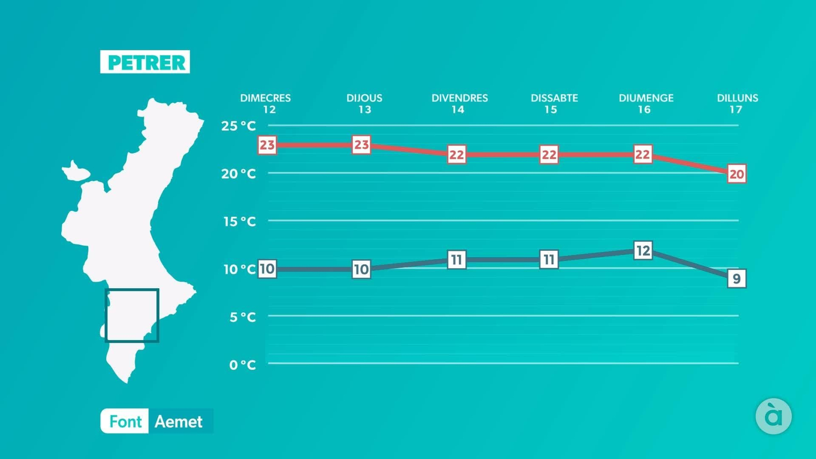 Divendres, el pas d'un front ens deixarà molts núvols però poques pluges. Sí que són probables alguns ruixats a l'interior, però poc importants i acompanyats de fang, perquè es mantindrà la calitja. Ja de vesprada s'obriran clarianes i a última hora el cel quedarà ras. El vent girarà a sud i llebeig, amb ratxes moderades al litoral d'Alacant i notable alteració marítima. Pujaran les mínimes, mentre que les màximes baixaran a l'interior. Per contra, a la costa i comarques centrals seran molt elevades, amb valors de 23 °C a 25 °C.