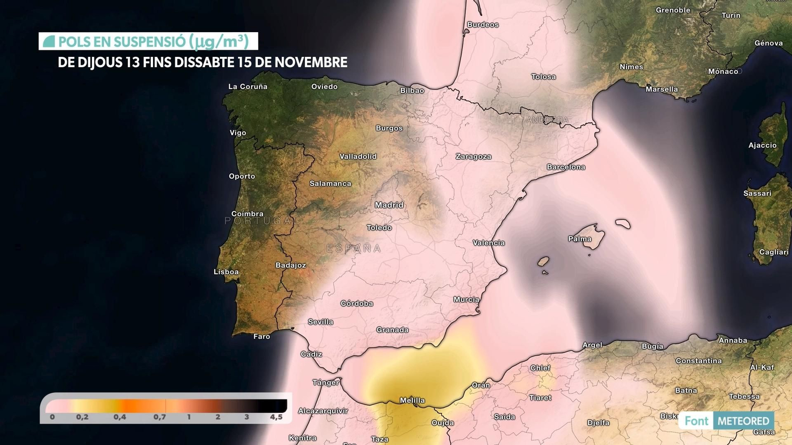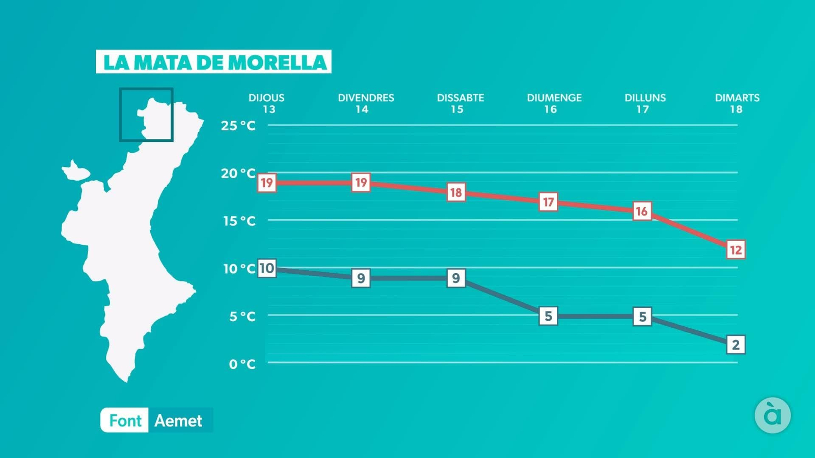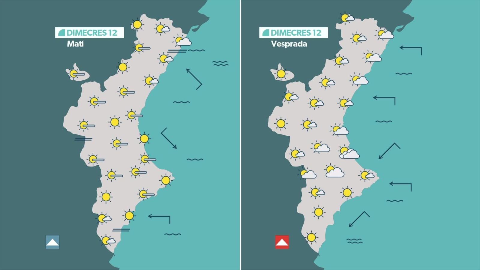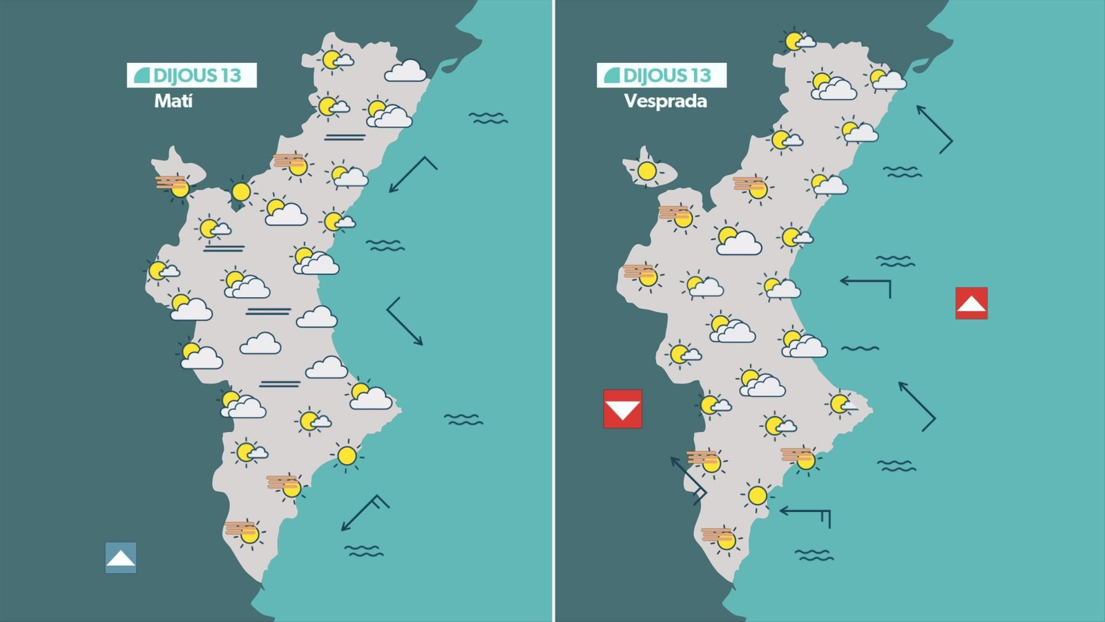El gir de vents a llevant ens deixarà un dijous amb humitat elevada, núvols abundants, boires i mala visibilitat al centre i nord. A mesura que avance la jornada s'obriran algunes clarianes, però la nuvolositat continuarà present al llarg de tot el dia. Més sol al sud, amb bandes de núvols alts de vesprada. Hem de comptar, també, amb calitja, presència de pols en suspensió que deixarà el cel térbol. Ja a última hora del dia el cel quedarà cobert per tot arreu per l'arribada d'un front. Amb més humitat i més núvols, pugen les mínimes, mentre que les màximes baixen lleugerament a l'interior i es mantenen sense canvis a la resta. La majoria dels valors estaran entre els 18 °C i els 22 °C, més alts a les comarques del sud, on s'arribarà als 25 °C.