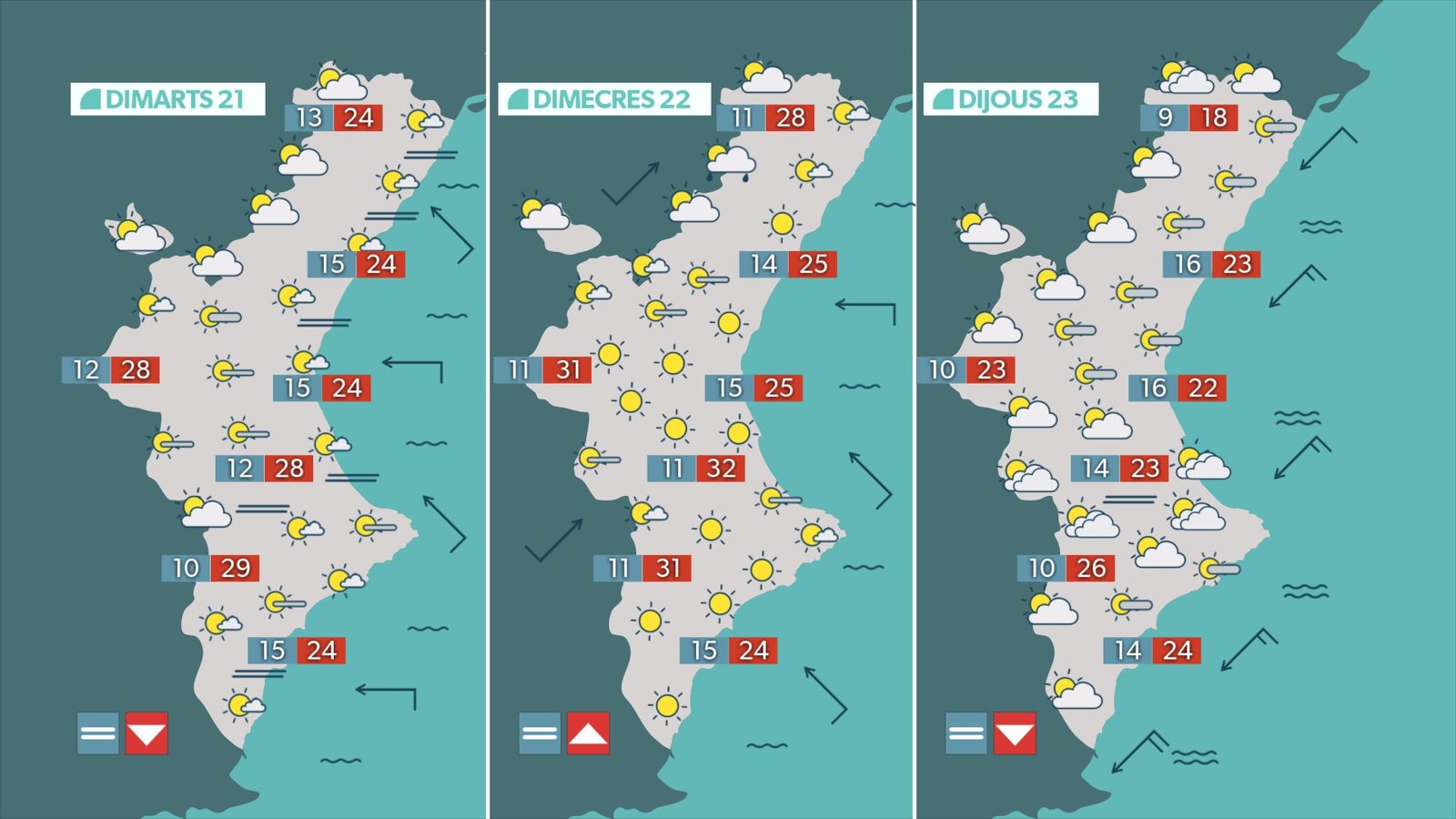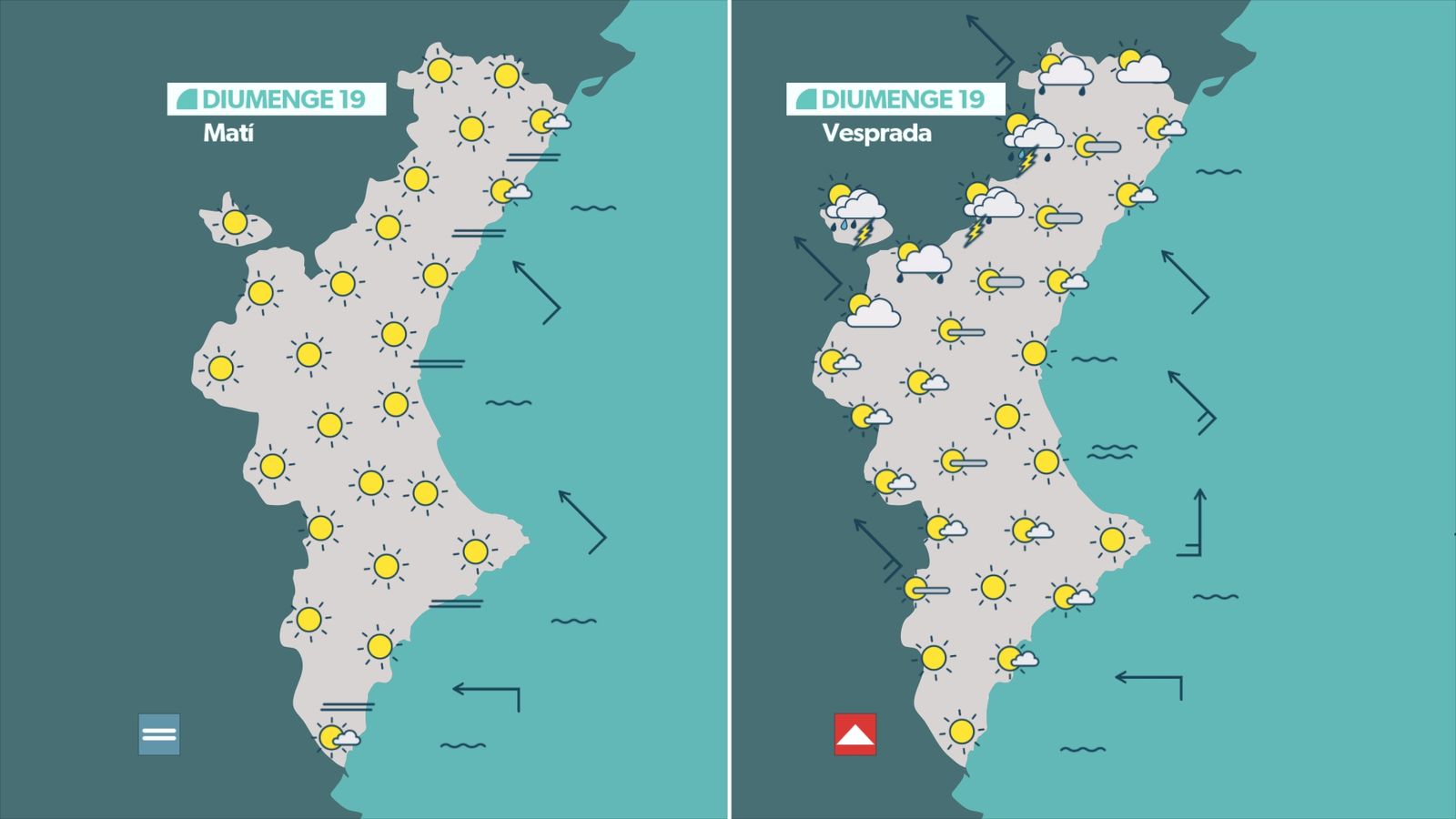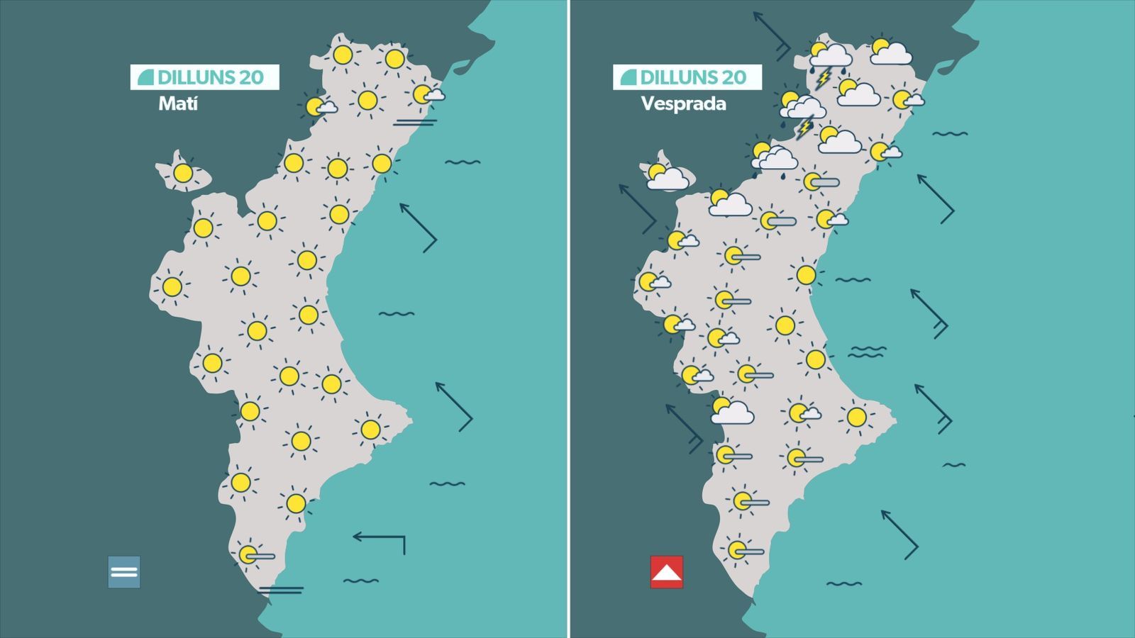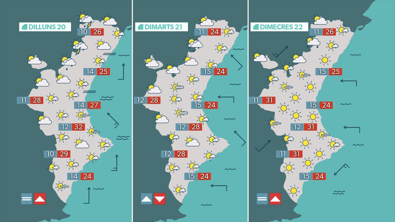 Entre diumenge i dilluns, les temperatures tocaran sostre i parlarem de màximes superiors als 30 °C a les comarques centrals i entre 25 °C i 30 °C a la resta. Jornades d'estiu, amb sol, però també amb boires i mala visibilitat al litoral. De vesprada, els núvols a l'interior nord creixeran amb més força i s'esperen ruixats, acompanyats de tempesta, al límit entre les comarques de Castelló i Terol. El vent bufarà fluix, amb brises moderades de vesprada.