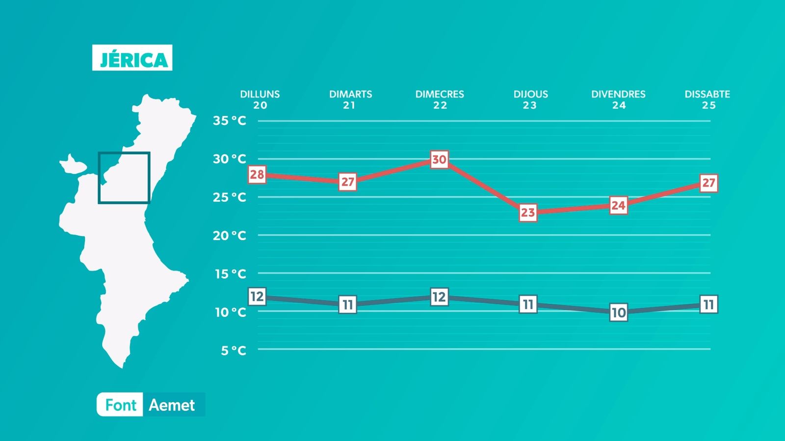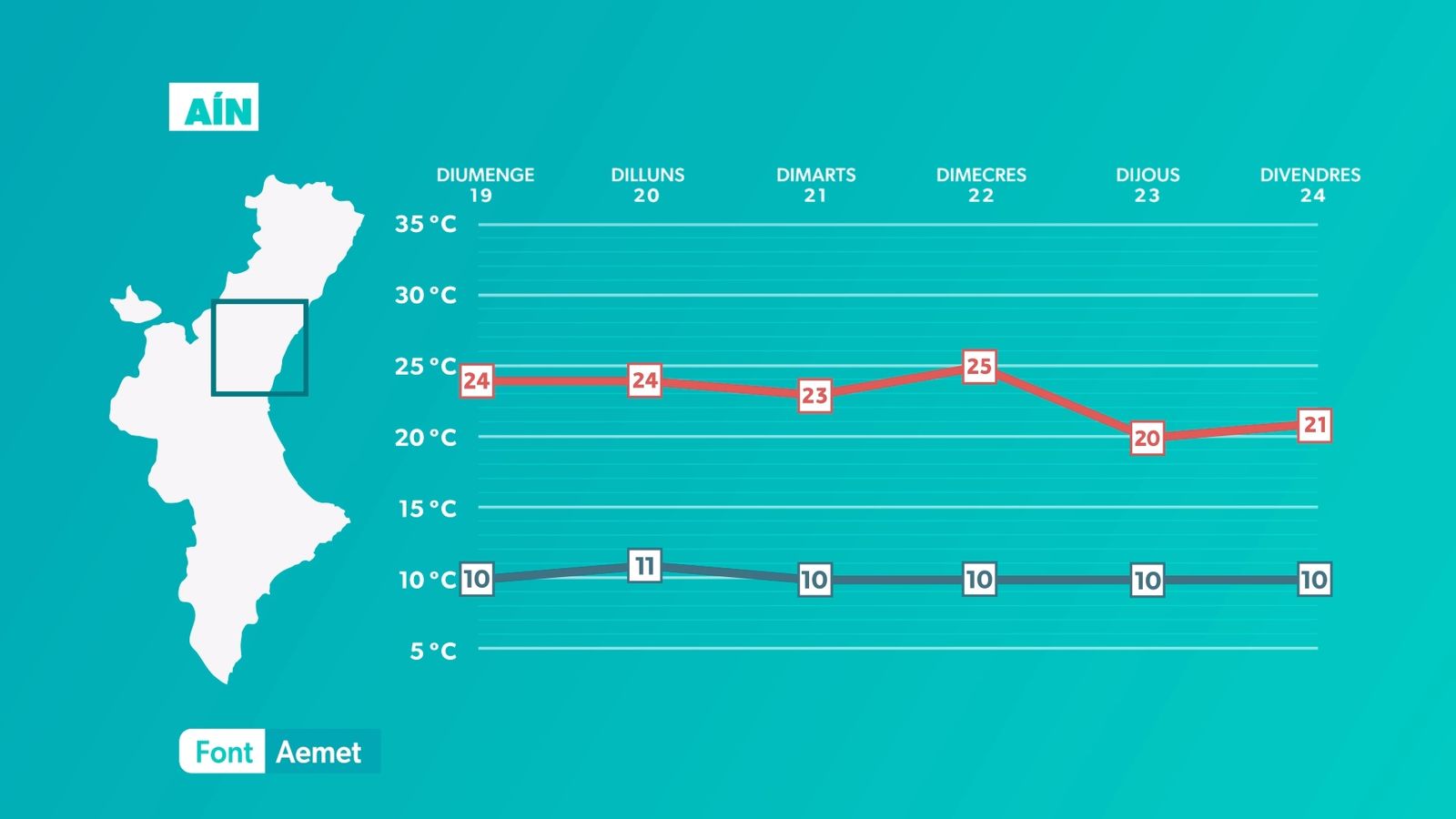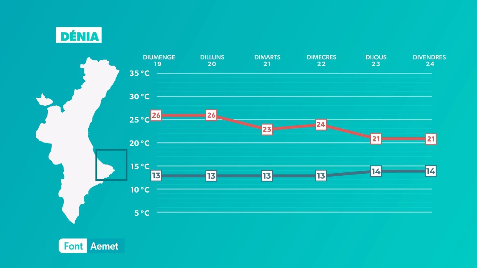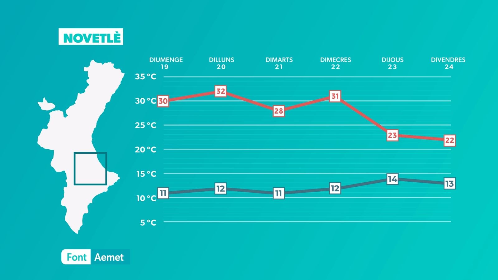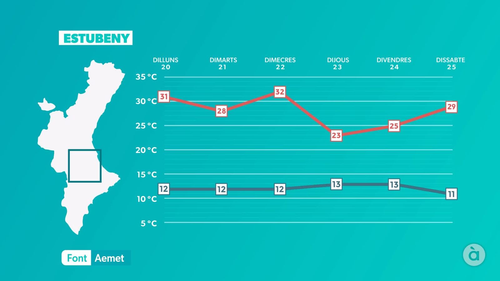 Entre diumenge i dilluns, les temperatures tocaran sostre i parlarem de màximes superiors als 30 °C a les comarques centrals i entre 25 °C i 30 °C a la resta. Jornades d'estiu, amb sol, però també amb boires i mala visibilitat al litoral. De vesprada, els núvols a l'interior nord creixeran amb més força i s'esperen ruixats, acompanyats de tempesta, al límit entre les comarques de Castelló i Terol. El vent bufarà fluix, amb brises moderades de vesprada.
