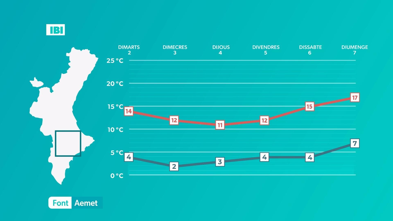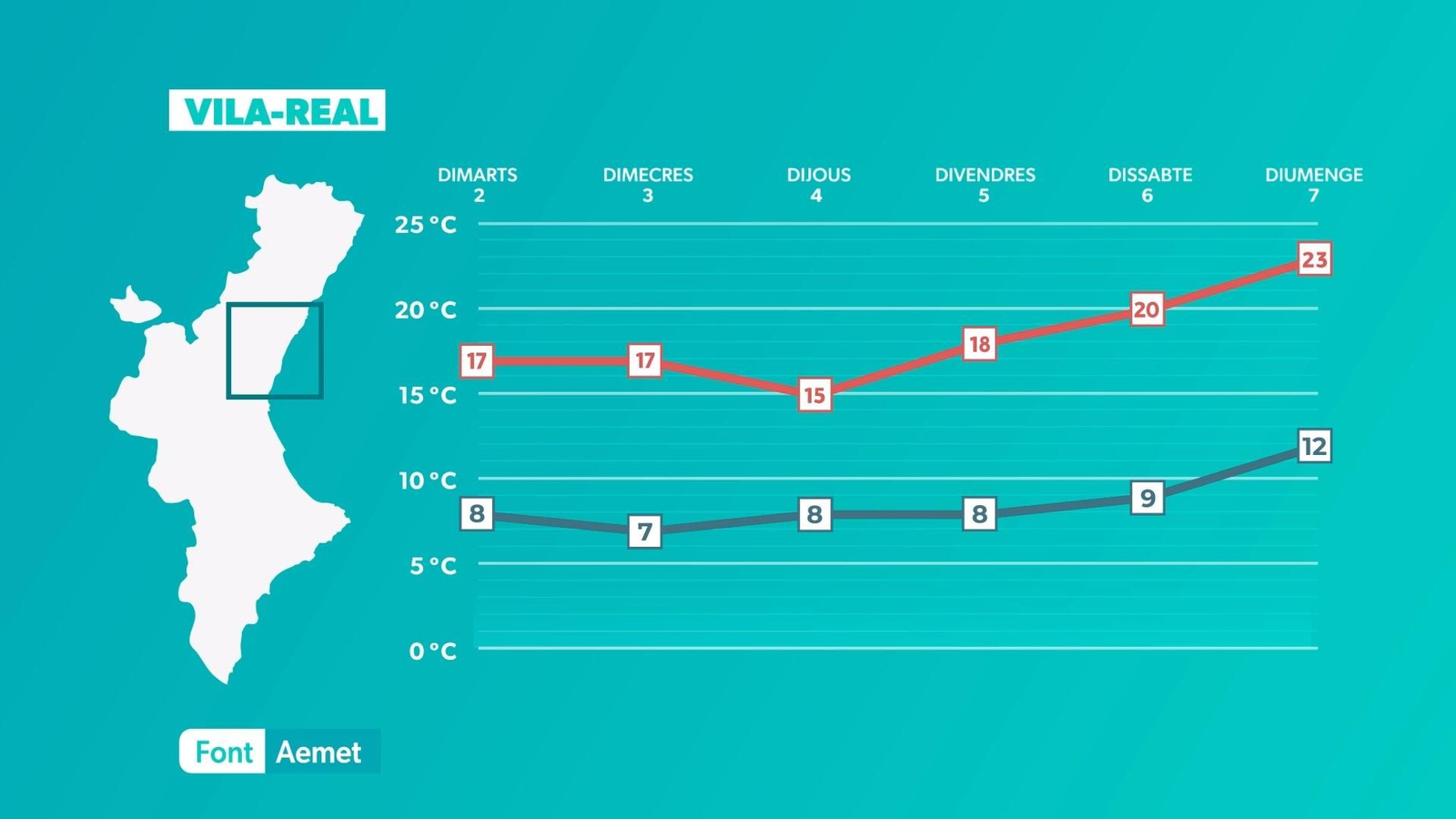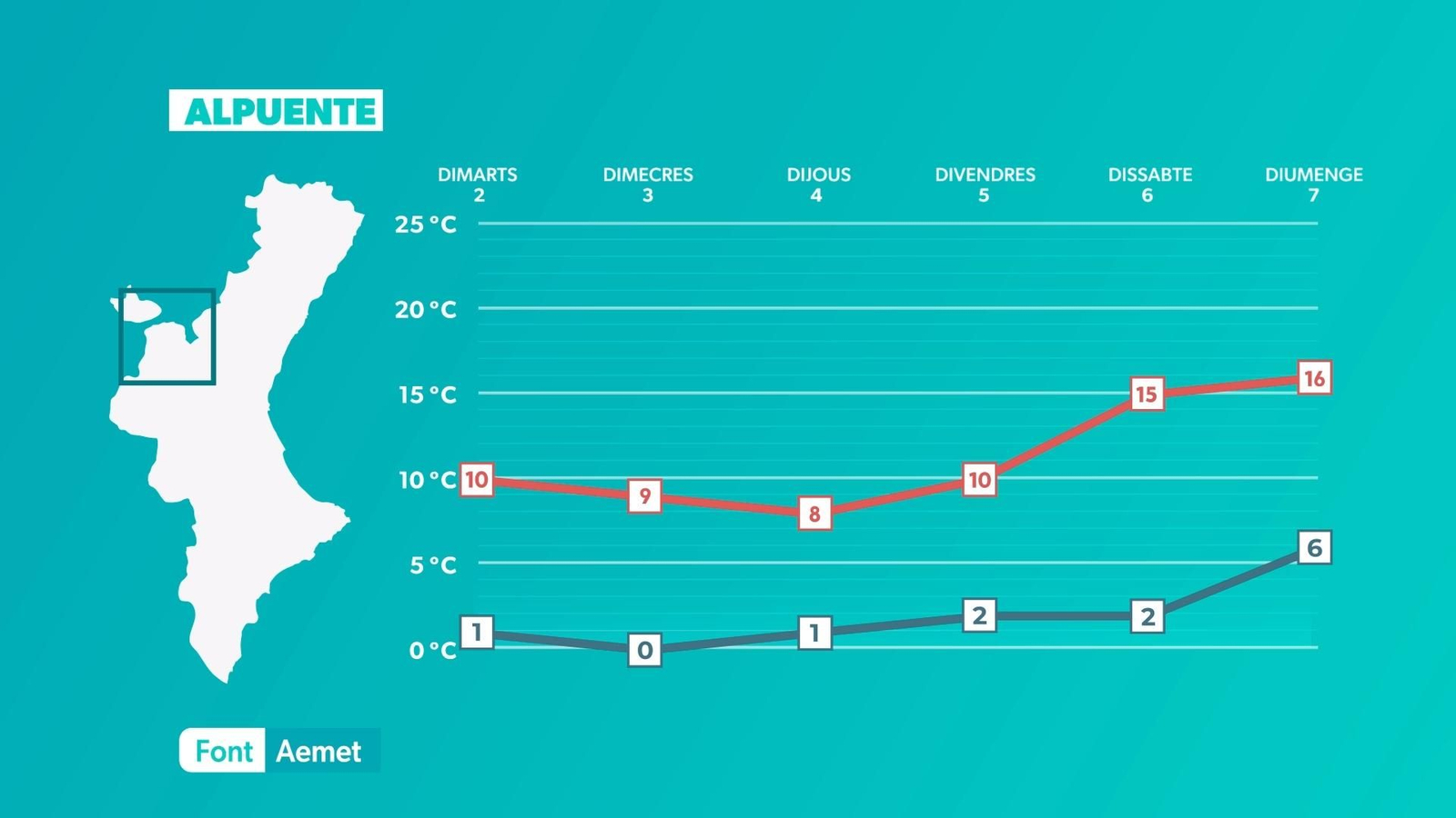 Hem començat el mes de desembre amb ambient fred i nuvolós, però amb poca pluja, una situació que es mantindrà dimarts de la mà de l'arribada de nous fronts. Tanmateix, a diferència de dilluns, la nuvolositat no serà tan compacta i es desplaçarà ràpidament de l'interior cap a la costa espentada pel vent de ponent. Així les coses, el dia començarà amb núvols, que seran més abundants a la Plana d'Utiel-Requena, la Serrania, la Vall de Cofrents-Aiora i el Racó d'Ademús. Els núvols es retiraran ràpidament per a tornar a formar-se a primera hora de la vesprada, quan el cel quedarà cobert. S'esperen ruixats durant la segona meitat del dia a l'interior central i nord. Ja a poqueta nit, les clarianes tornaran a guanyar terreny. El vent de ponent s'intensificarà al llarg de la jornada i les temperatures pujaran a les comarques centrals i al litoral central i sud, on s'esperen màximes de fins a 20 °C. Per contra, les màximes es mantindran baixes a l'interior de les províncies de Castelló i València, ja que quedaran per davall dels 15 °C.