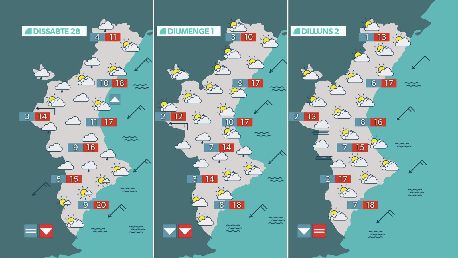 Descens de les temperatures i més núvols per a dissabte. El vent girarà a gregal i bufarà amb ratxes moderades al litoral d'Alacant, on la mar es picarà. Precisament, este vent provocarà la formació de núvols abundants a les comarques centrals i sud del golf de València, on s'esperen pluges dèbils. També cauran algunes precipitacions a l'interior de Castelló. Intervals de núvols a la resta, amb més sol a sotavent de les muntanyes d'Alacant, on el gregal arriba més sec i càlid. Les temperatures baixaran de forma acusada. La majoria de les màximes estaran entre els 14 °C i els 17 °C. A la costa sud, però, encara s'aplegarà als 20 °C, mentre que a l'interior de Castelló rondaran els 10 °C.