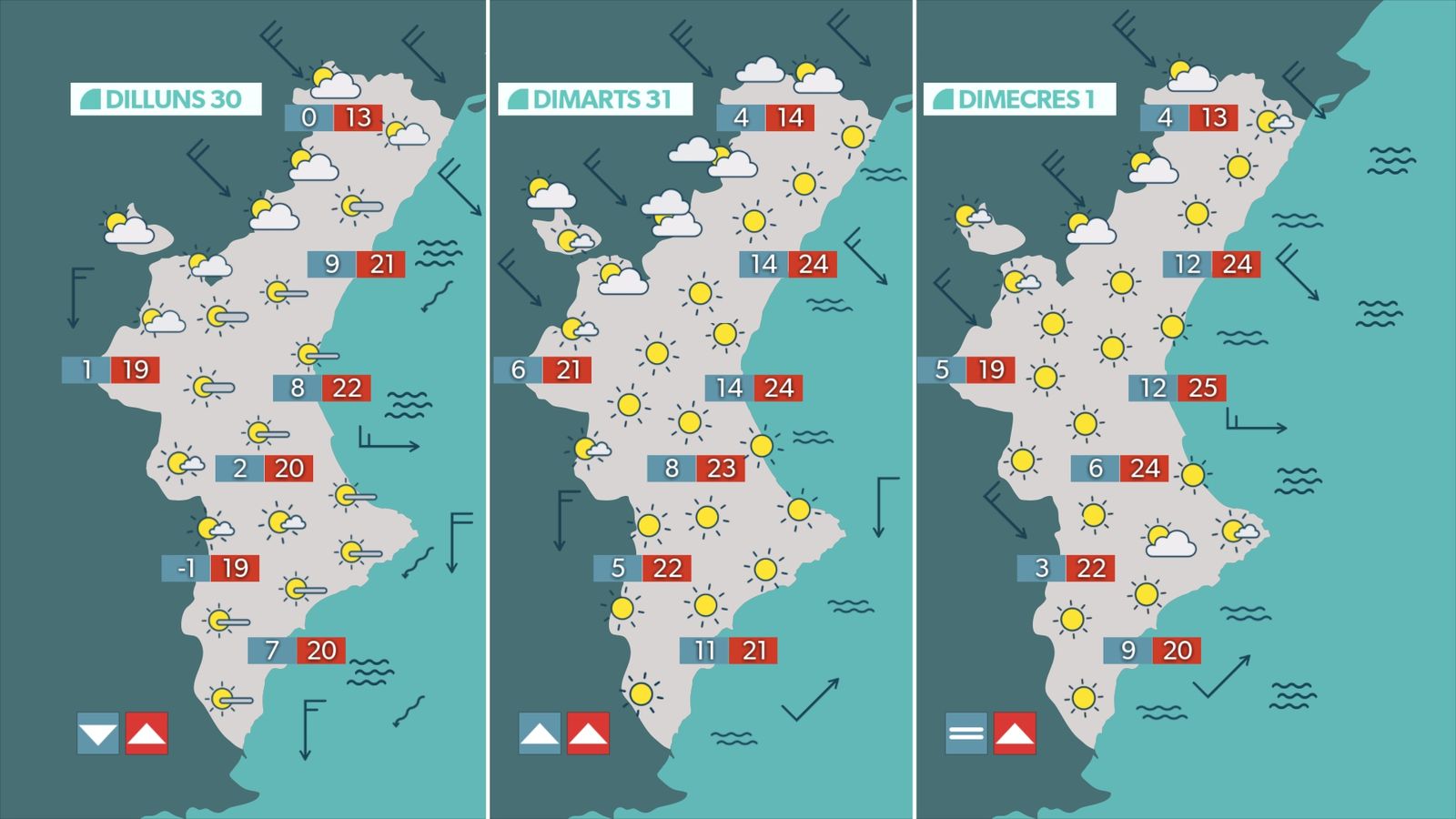 El vent amainarà dilluns i girarà a mestral, a nord-oest, sense arribar a encalmar totalment. Dilluns tindrem pas de núvols des de ponent a llevant, amb més fred de matí i temperatures més altes al migdia, amb màximes superiors als 20 °C a la costa.
