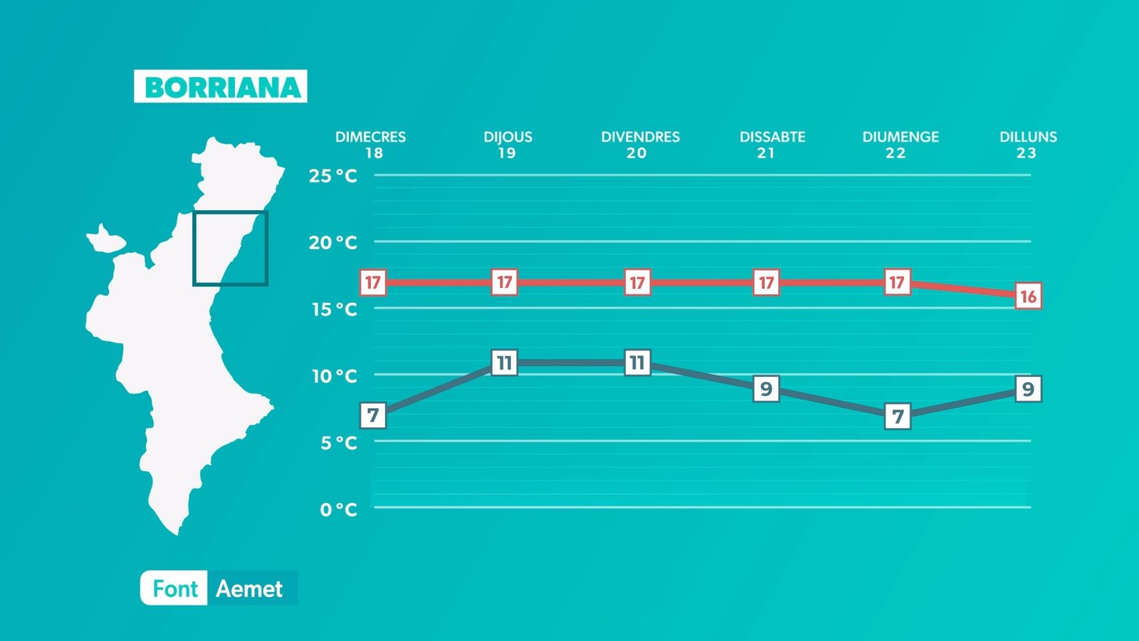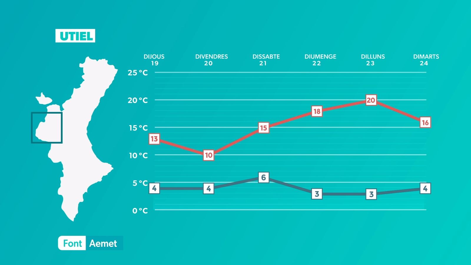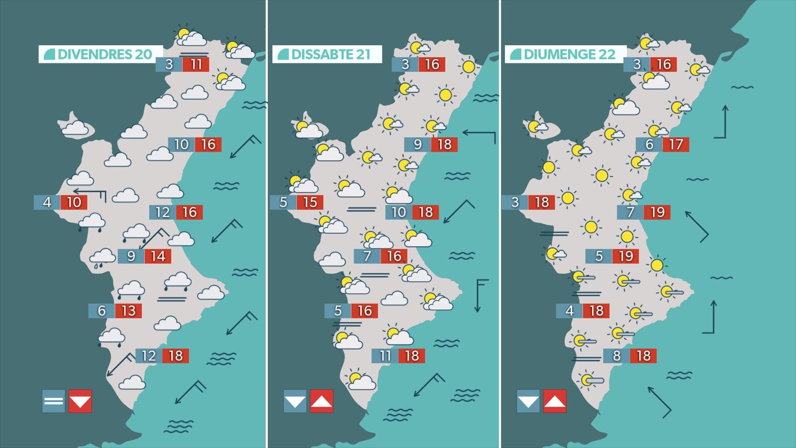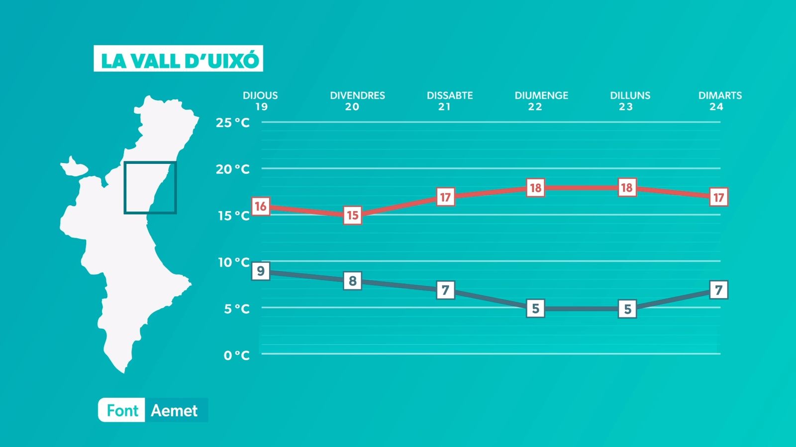 El sol serà el protagonista de la jornada de dimarts, amb una temperatura que té tendència a pujar de forma lleugera. Únicament hem d'esperar els núvols baixos a última hora del dia a la costa del Baix Maestrat. El vent bufarà fluix de matí, però de vesprada s'intensificarà el llebeig i el migjorn a la costa sud. Com déiem, la temperatura pujarà de forma lleugera. La nit tornarà a ser freda, amb mínimes de 5 °C a 10 °C a la majoria de les poblacions. Les màximes se situaran entre els 19 °C i els 23 °C, encara que a les comarques centrals s'arribarà puntualment als 25 °C. Al litoral, les màximes oscil·laran entre els 17 °C i els 20 °C.