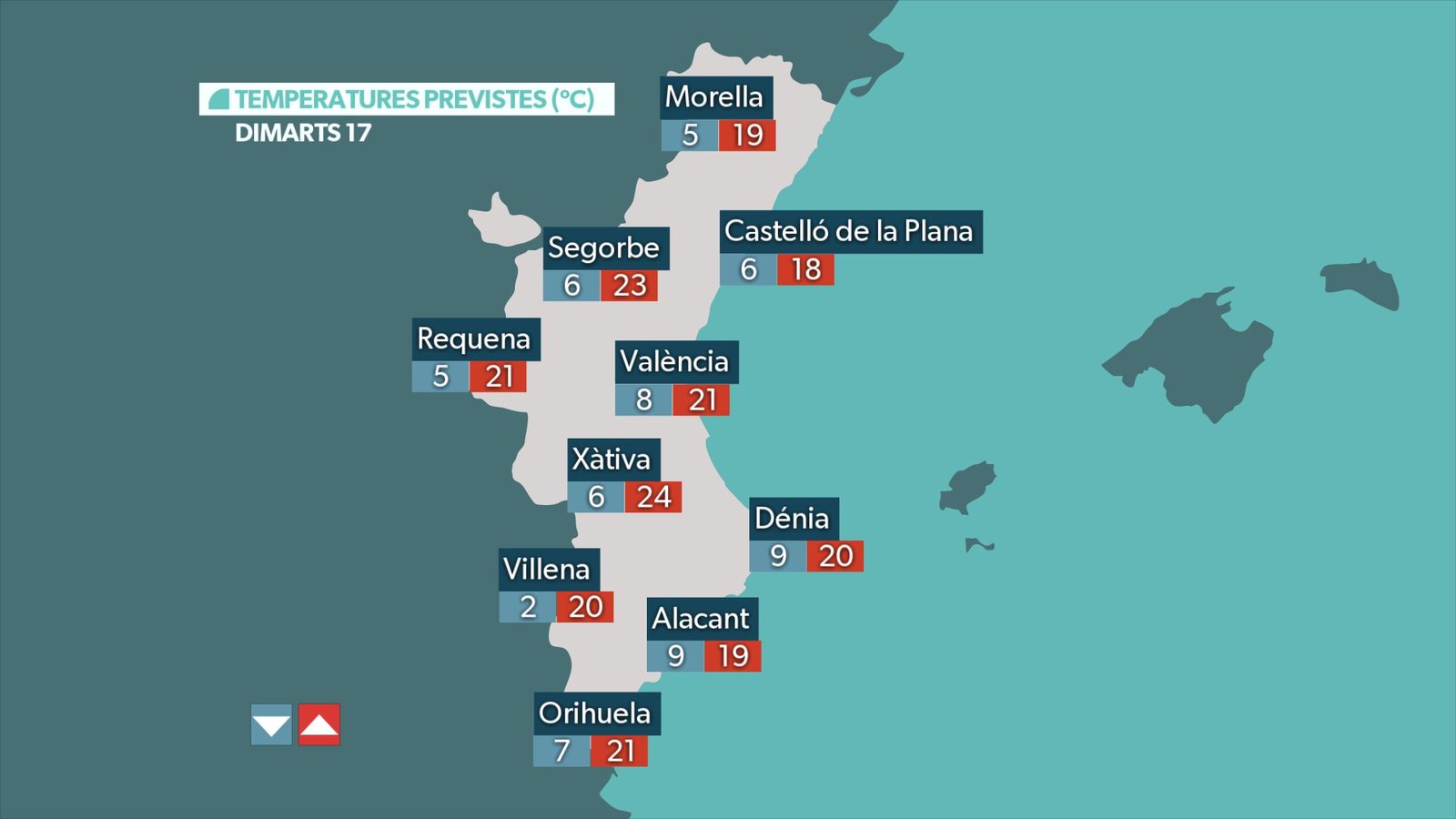 Diumenge tornarà a ser una jornada en general freda i ventosa, però amb menys nuvolositat. De fet, serà un dia amb domini del sol en gran part del territori, tan sols trobarem més núvols a l'interior central i durant el matí, quan no es descarta que hi puga caure algun plugim, que podria ser en forma de neu per damunt dels 900 metres, en tot cas ruixats poc destacables, anecdòtics més que res. De vesprada s'obriran més clarianes.