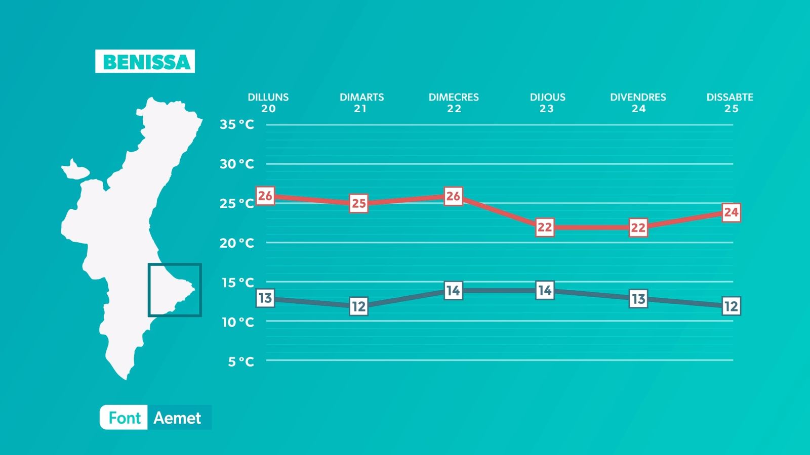 La primavera avançada s'ha instal·lat a la península. De fet, este cap de setmana les temperatures seran més altes del normal, especialment diumenge i a l'interior. Podríem parlar de màximes entre 5 °C i 8 °C per damunt de la mitjana climàtica. De moment, dissabte, l'ascens tèrmic serà lleuger i la majoria de les màximes estaran entre els 25 °C i els 29 °C. Les més altes s'assoliran a l'interior i a les comarques centrals. A la costa, per contra, les màximes estaran entre els 20 °C i els 24 °C per efecte de la temperatura de la mar, que està entre els 16 °C i els 17 °C. Fruit de la diferència tèrmica entre l'aigua de la mar i la temperatura de l'aire, es formaran núvols baixos i boires al litoral, especialment litoral de Castelló i d'Alacant. Tot i les boires costaneres, serà un dia assolellat, amb bandes de núvols alts durant el matí. De vesprada, creixeran nuvolades a les muntanyes de l'interior que podrien deixar algun ruixat aïllat, localment acompanyat de tempesta, al Racó d'Ademús i entre l'Alcalatén i l'Alt Maestrat. El vent bufarà fluix, amb predomini de les brises de vesprada.