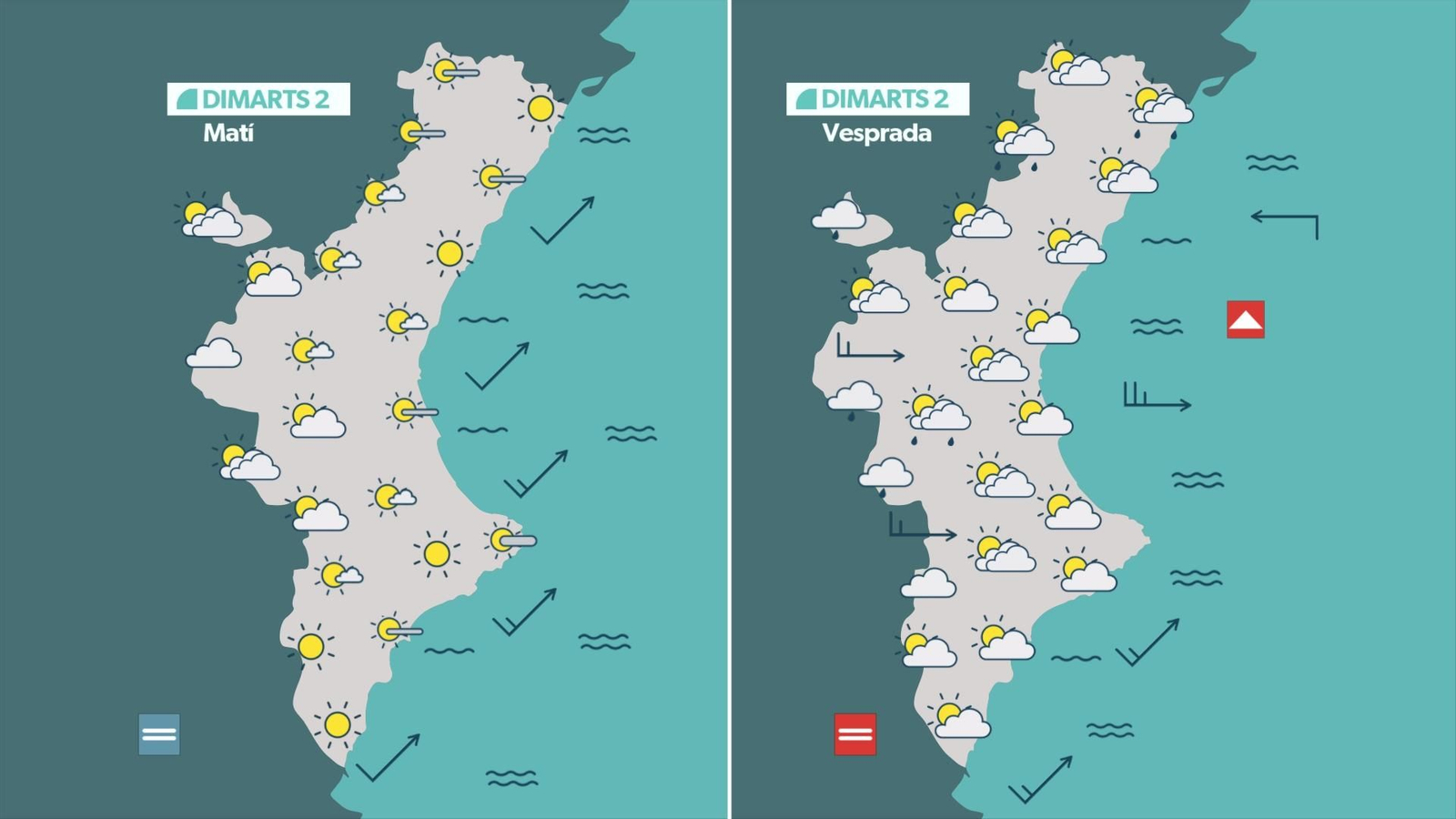 Dimarts serà un dia amb núvols abundants i pluges dèbils a l'interior. També arriba vent de ponent i registrarem un ascens de les temperatures al golf de València, mentre que dijous arribarà un nou front que ens deixarà més núvols i ruixats més generals