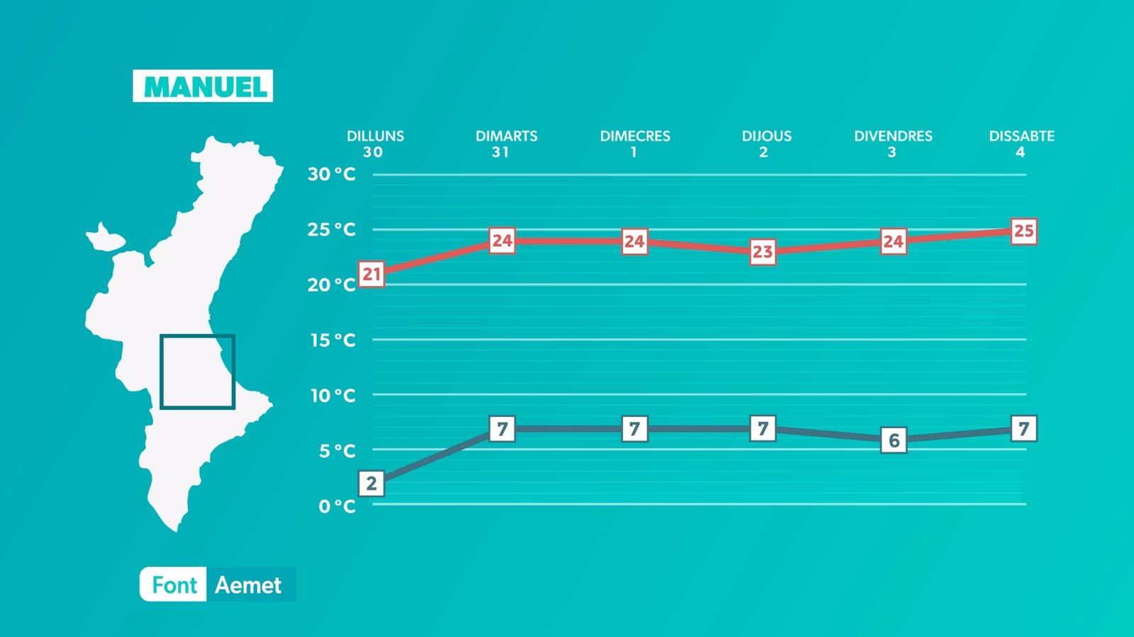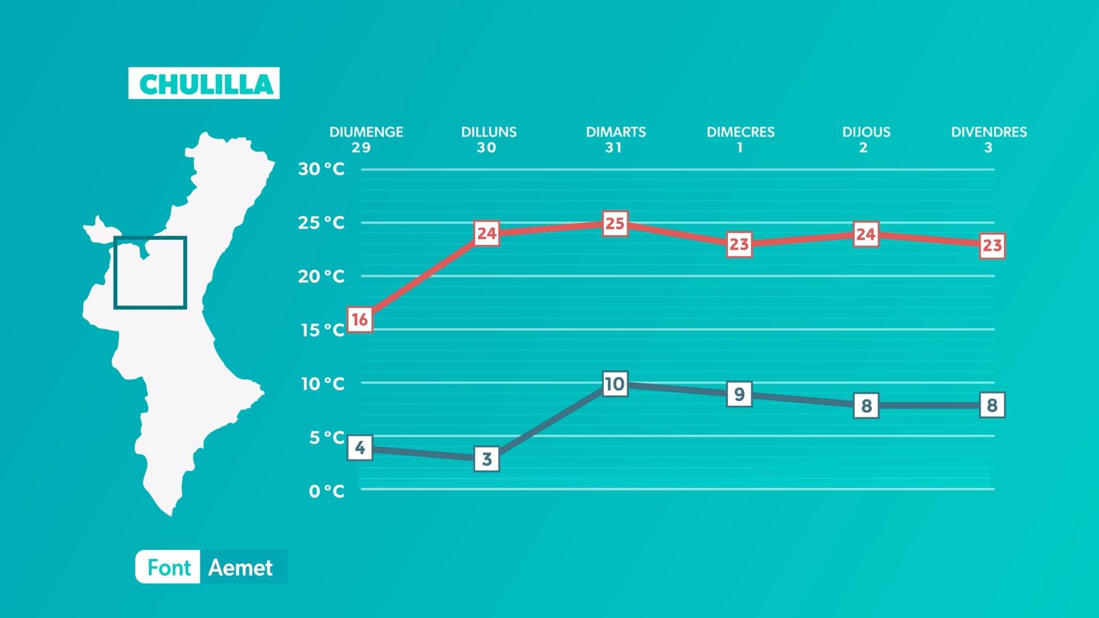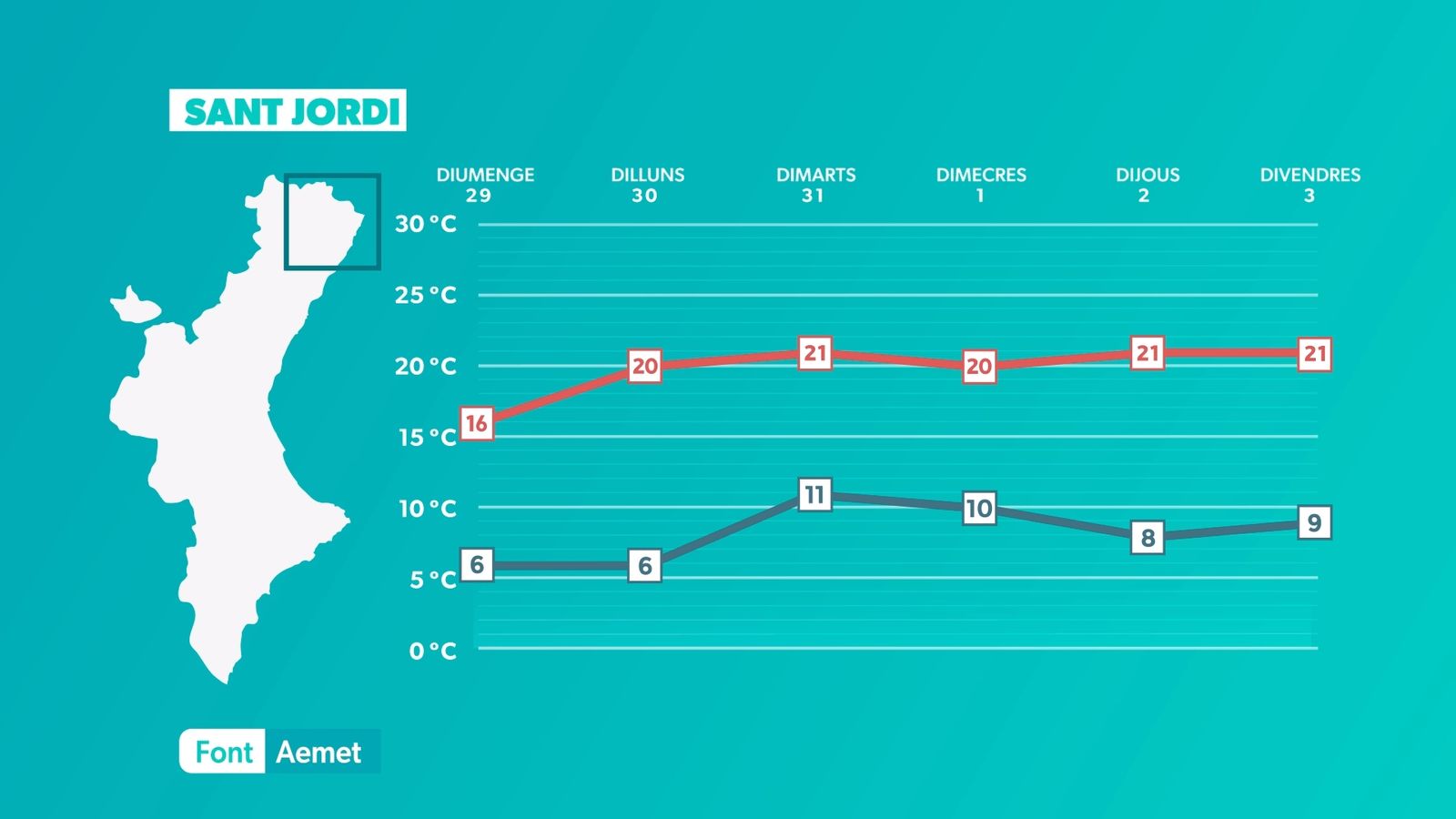 L'inici de la Setmana Santa remuntaran les temperatures, sobretot entre dilluns i dimarts, amb valors superiors als 25 °C a partir de dimarts.