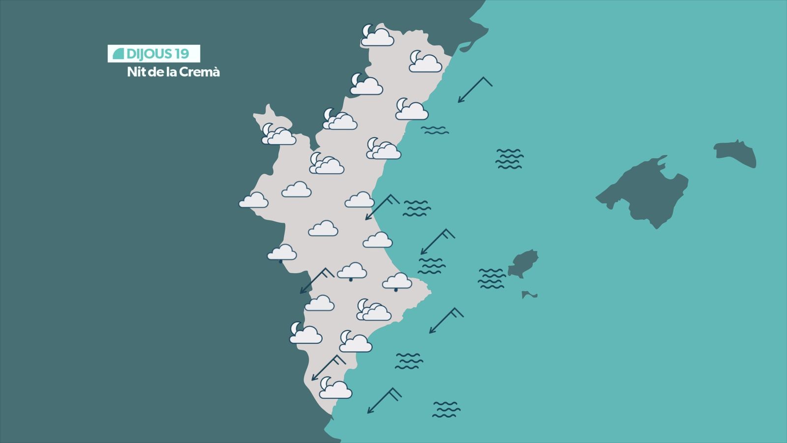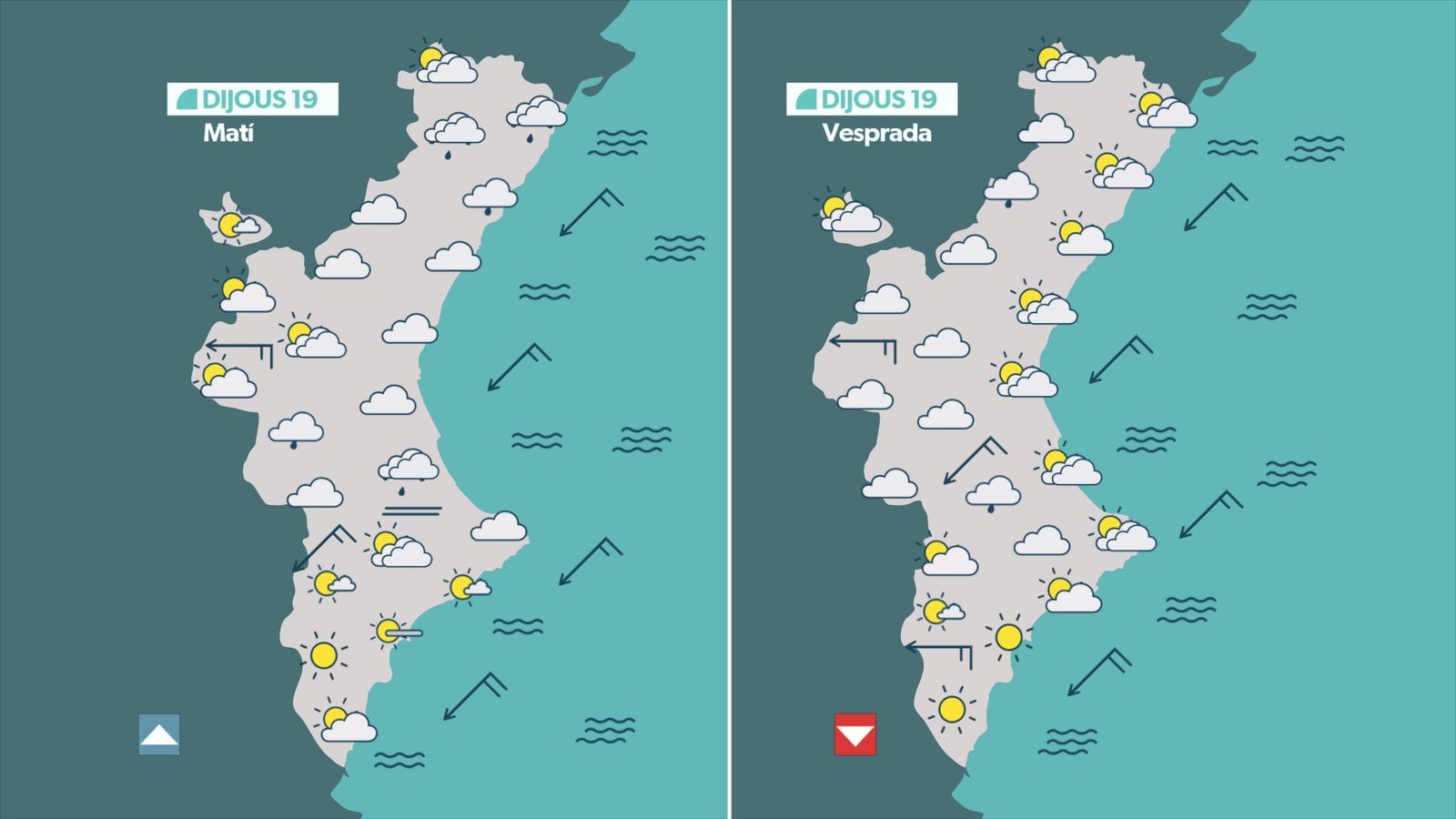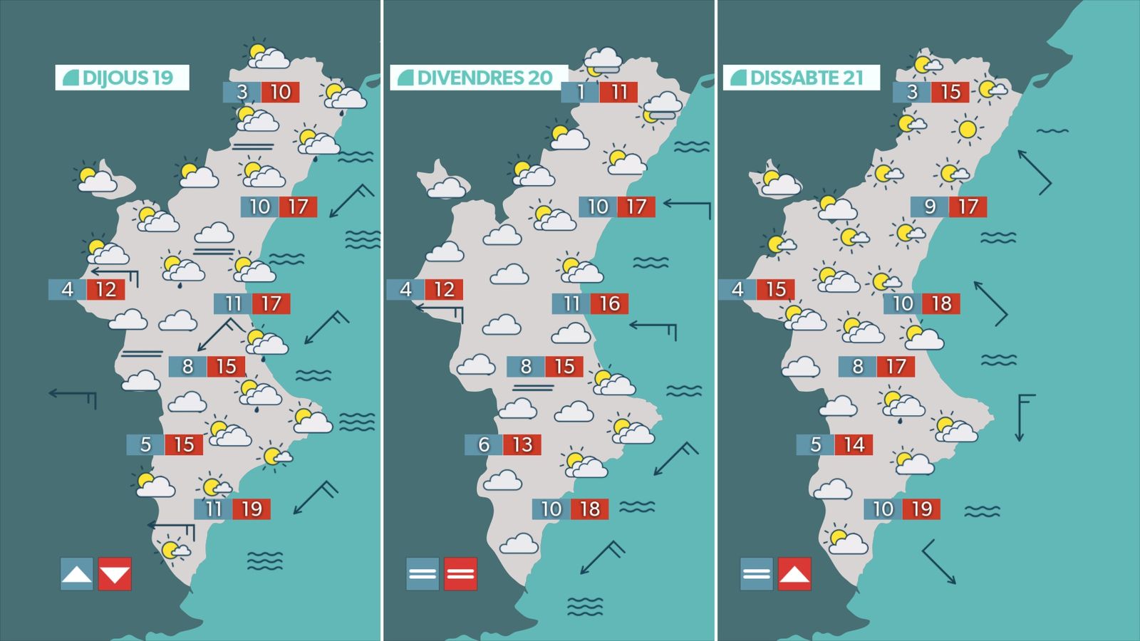 Dijous canviarà lleugerament l'oratge. Tindrem més humitat, més núvols i un descens tèrmic més acusat, que es notarà sobretot a l'interior. La majoria de les màximes estaran entre els 12 °C i els 17 °C. Ambient fresc i acompanyat de nuvolositat abundant al centre i nord, amb risc de pluja dèbil durant el matí al litoral i a partir de migdia al prelitoral i interior. Durant la segona meitat del dia, els núvols es retiraran. El vent bufarà de gregal, moderat al litoral, i la mar es picarà.