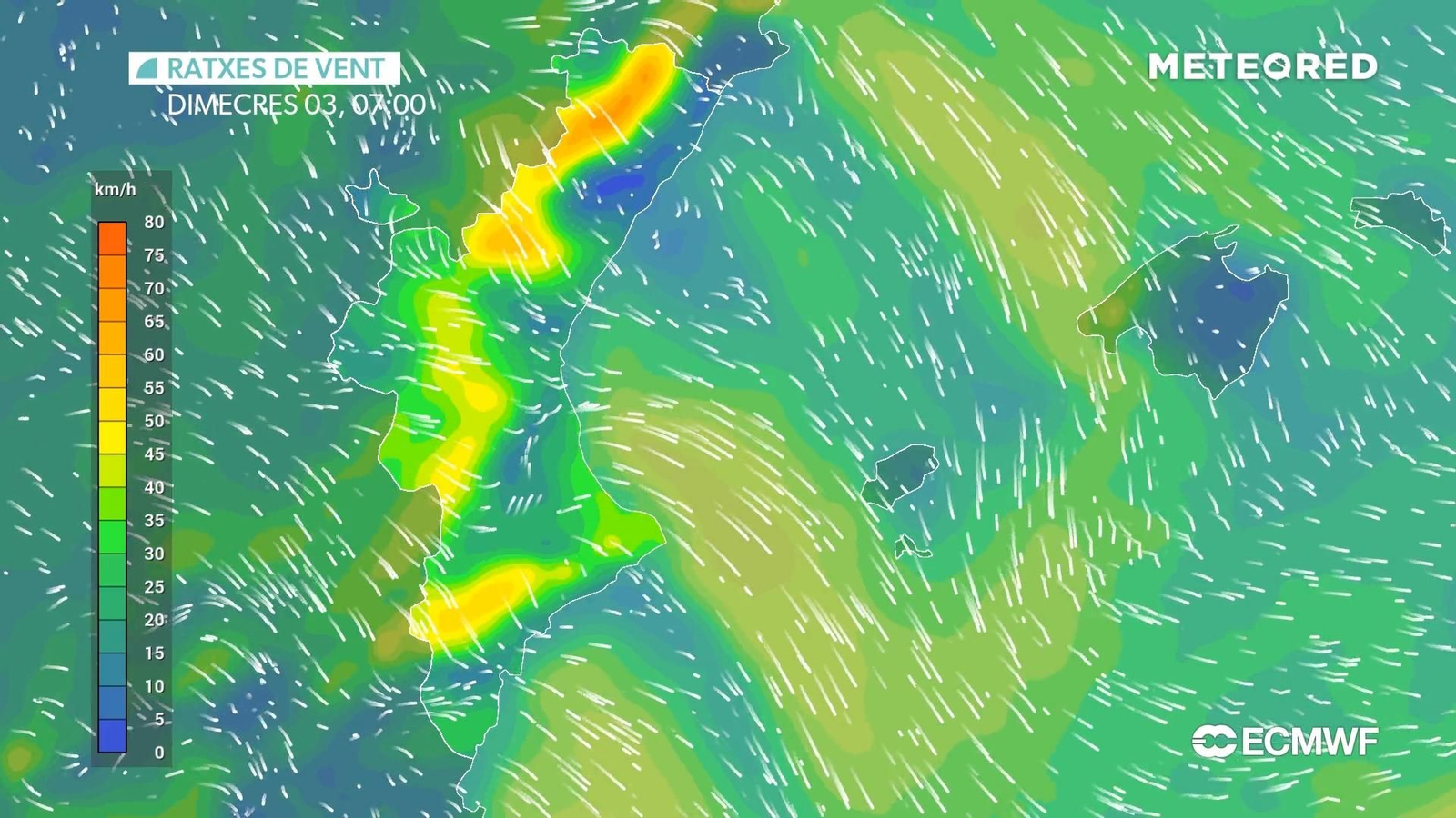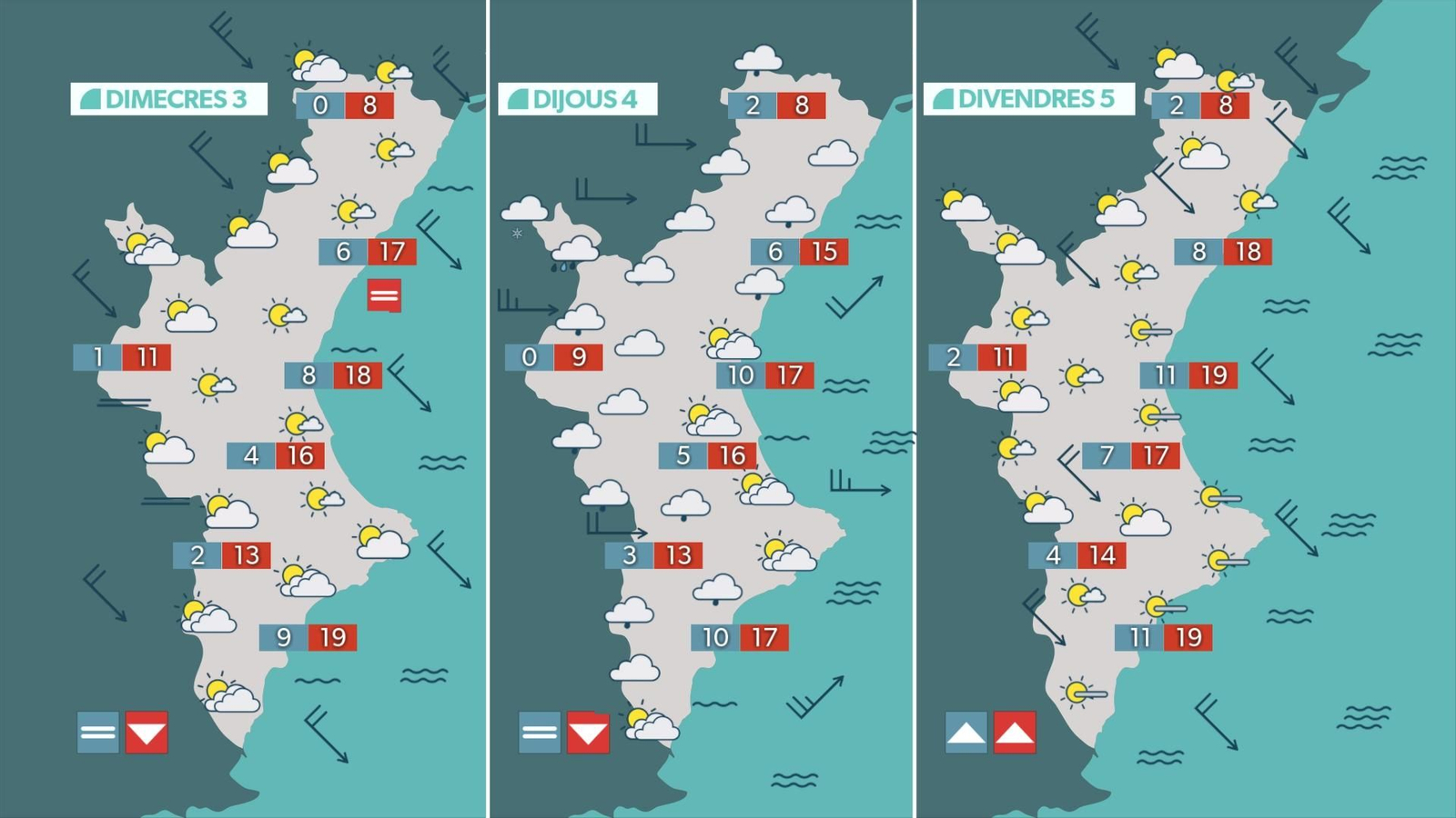 El protagonista de dimecres serà el vent de mestral, que bufarà amb ratxes fortes, especialment al nord. Serà un matí d'intervals de núvols, més abundants a l'interior i al sud, i baixaran les temperatures. Ja durant la vesprada, el cel s'arrasarà. L'ambient serà fred a l'interior, amb màximes que oscil·laran entre 8 °C i 12 °C, mentre que al litoral encara s'acostaran als 20 °C.