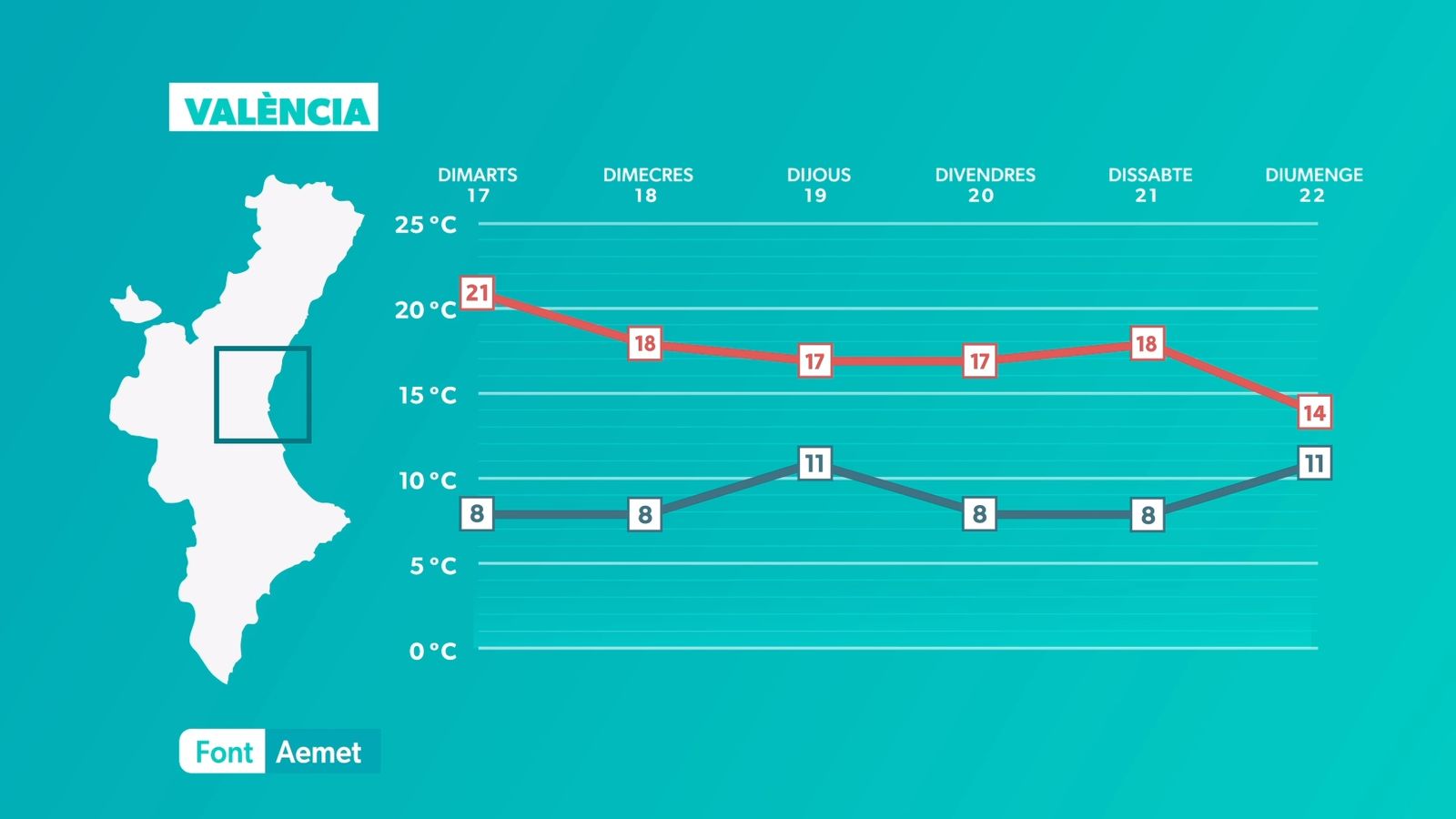 El vent serà el protagonista de la jornada, amb ratxes que superaran els 120 km/h als punts més exposats al mestral. De fet, l'Aemet ha activat els avisos nivell groc a totes les comarques castellonenques, i l'interior nord de València, per ratxes superiors als 80 km/h. De 07:00 hores a 19:00 hores, l'avís serà taronja a l'interior nord. Allí les ratxes poden ser destacables i deixar una sensació de fred acusada, per això les temperatures seran ben baixes a l'interior nord.
