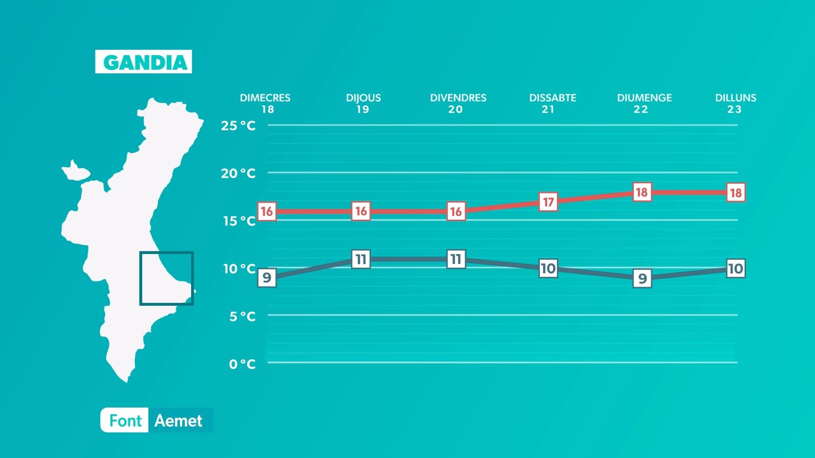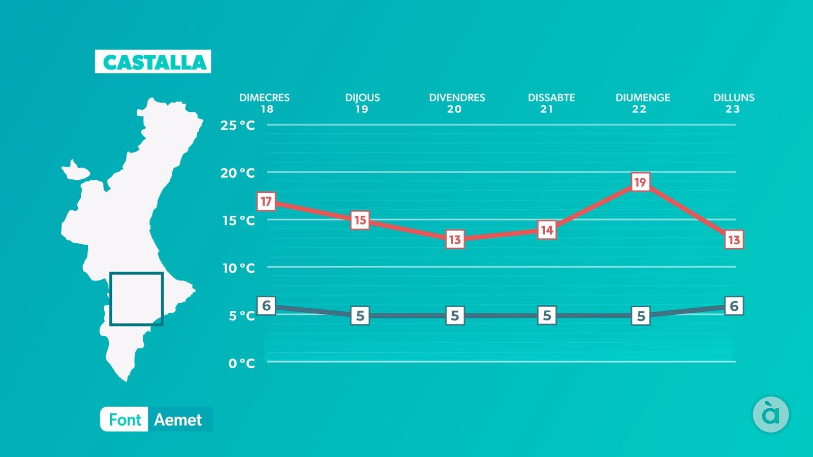 La temperatura començarà a baixar dimecres, però encara parlarem de valors de 16 °C a 20 °C a la major part del territori. De matinada, es formaran núvols baixos i boires al litoral de Castelló i València i a les comarques centrals. Independentment, augmentaran els núvols de tipus alt i mitjà de sud a nord que deixaran el cel enteranyinat. El vent girarà a gregal, amb ratxes moderades de vesprada a la costa.