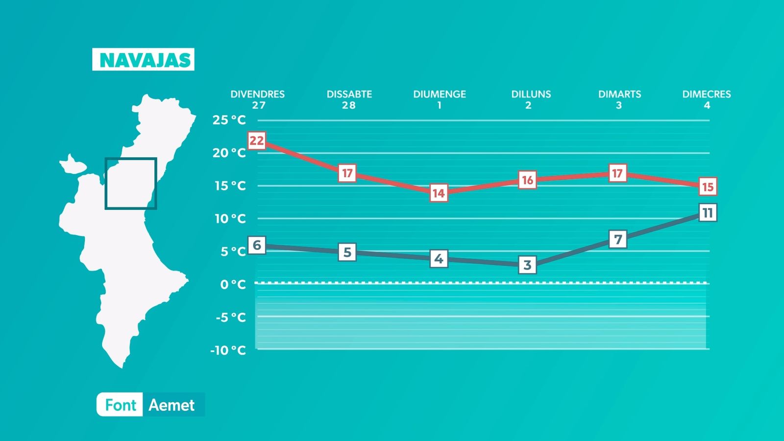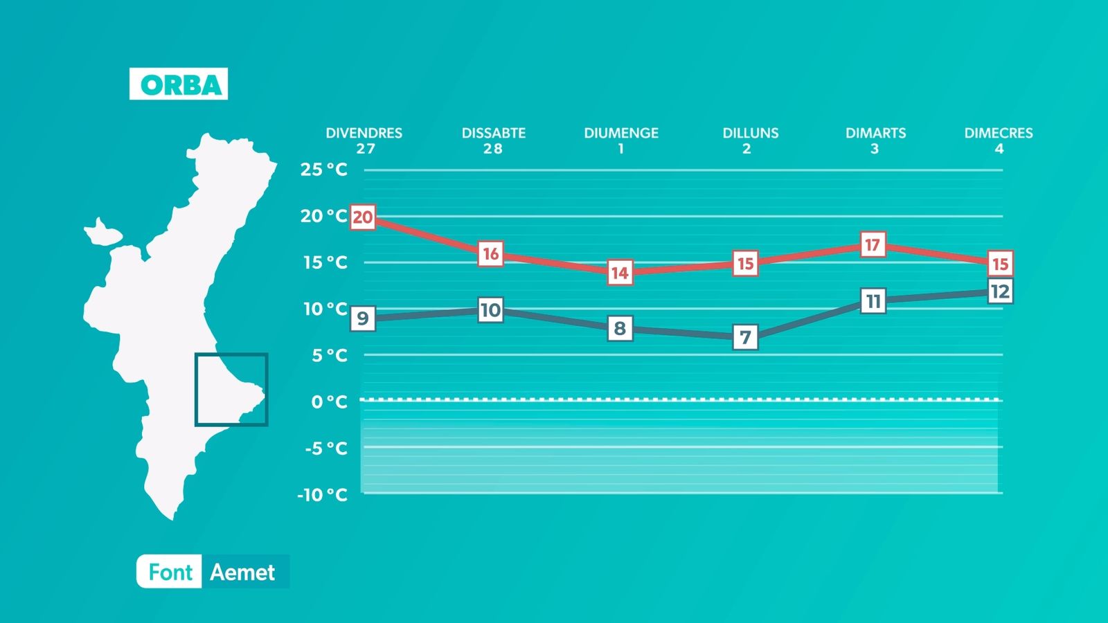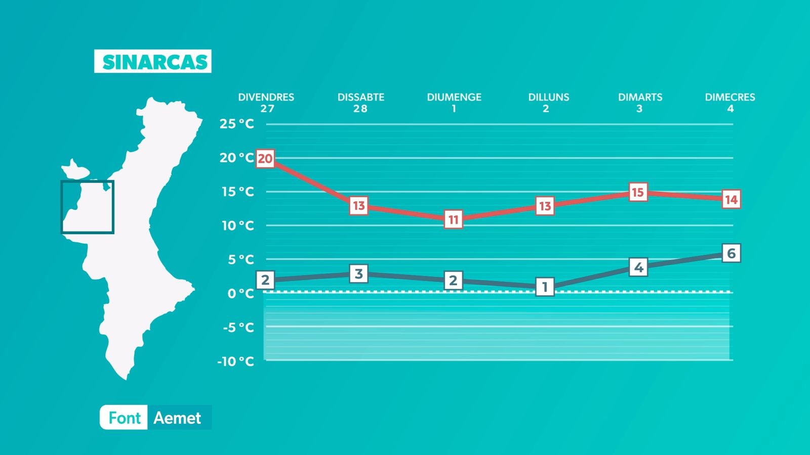 S'acaba la calma que hem tingut els últims dies i a partir del cap de setmana tindrem un oratge més variable, que podria desembocar en un episodi de pluges la pròxima setmana. De moment, estabilitat per a divendres però amb més núvols. Es concentraran a l'àrea litoral i seran més abundants durant el matí, per a tornar a augmentar a poqueta nit, quan el cel quedarà cobert, especialment a la costa d'Alacant i litoral nord. Independentment, al llarg de la jornada augmentaran els núvols de tipus alt i mitjà. Les temperatures tenen tendència a baixar de forma lleugera al litoral sud i a mantindre's sense canvis a la resta. La nit serà freda, amb mínimes de 3 °C a 6 °C a l'interior i de 7 °C a 10 °C a la costa. Màximes de 18 °C a 20 °C al litoral i prelitoral i superiors als 20 °C a l'interior, lluny de la influència marítima.