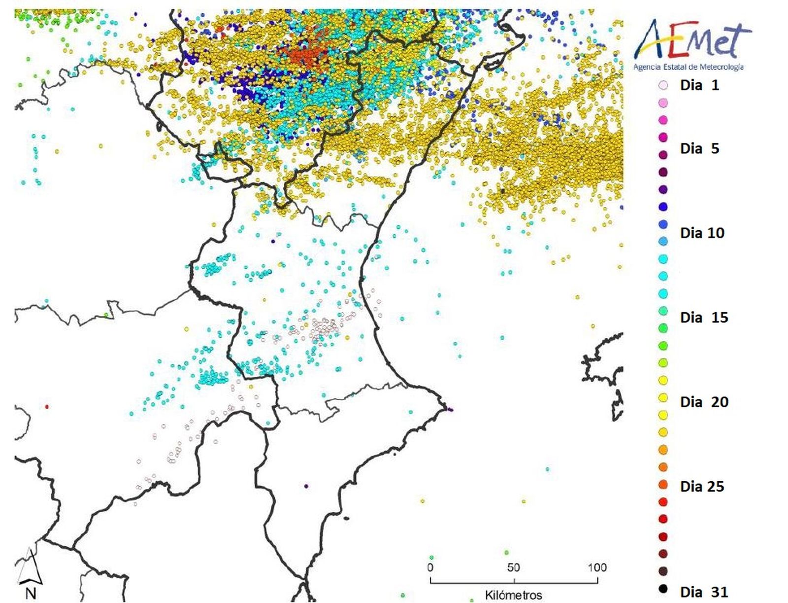 S'han registrat 14 dies de tempesta amb més de 4.000 descàrreges elèctriques entre núvol i terra detectades per la xarxa d'Aemet (Agència Estatal de Meteorologia).