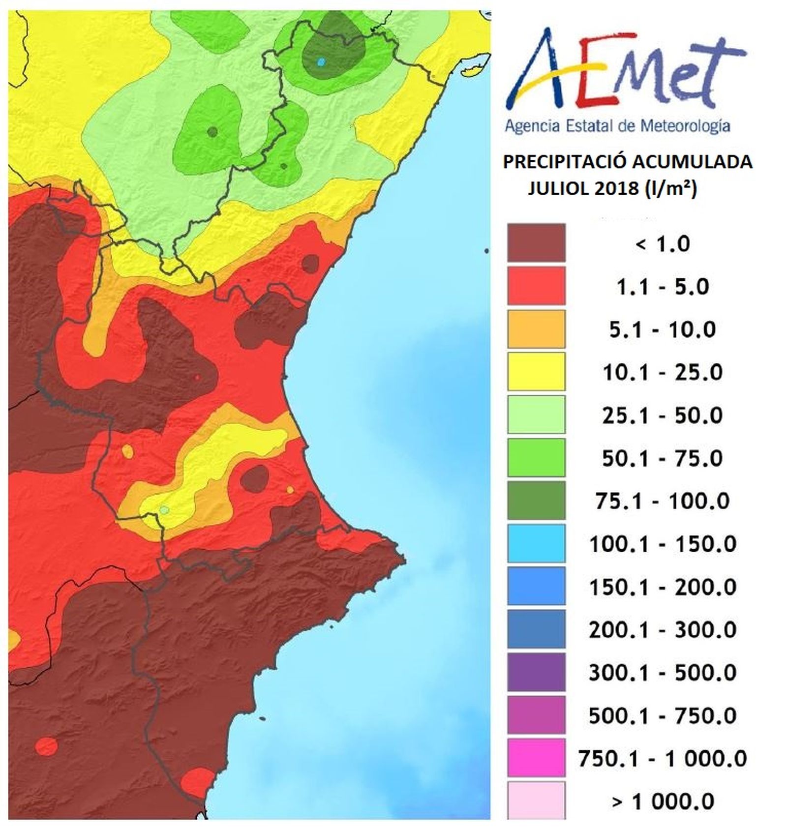 Segons les dades de l'Agència Estatal de Meteorologia, el mes de juliol de 2018 ha sigut molt càlid a la Comunitat Valenciana. La temperatura mitjana ha sigut de 25 °C, és a dir, 1 °C superior a la mitjana climàtica del període de 30 anys de referència (1981-2010).